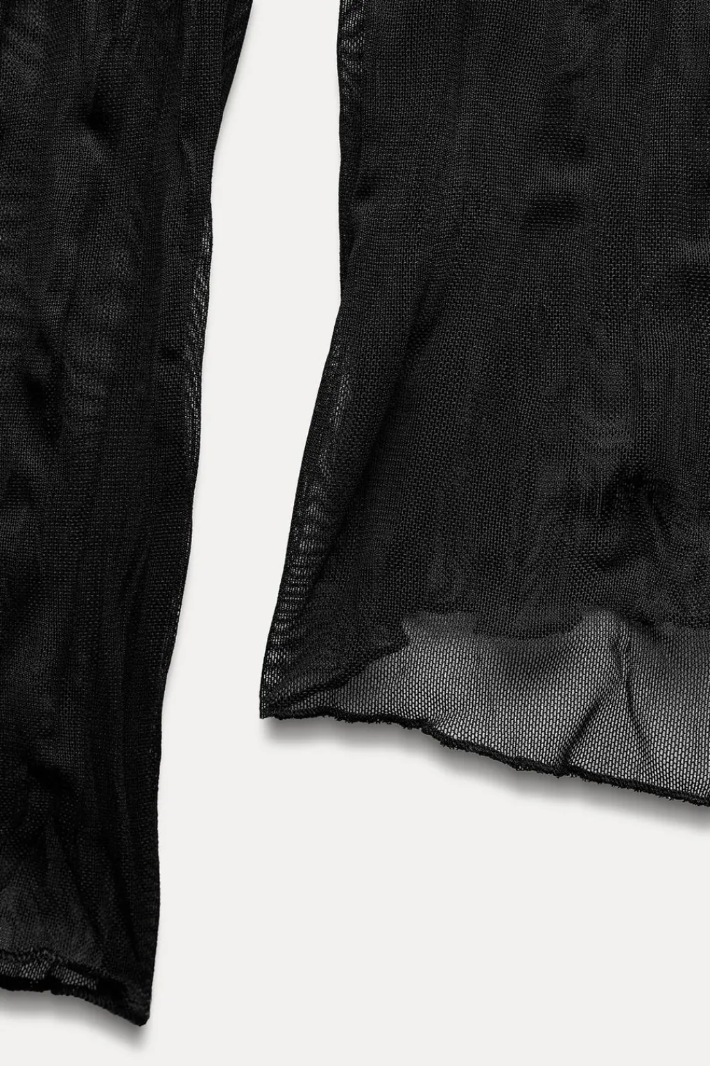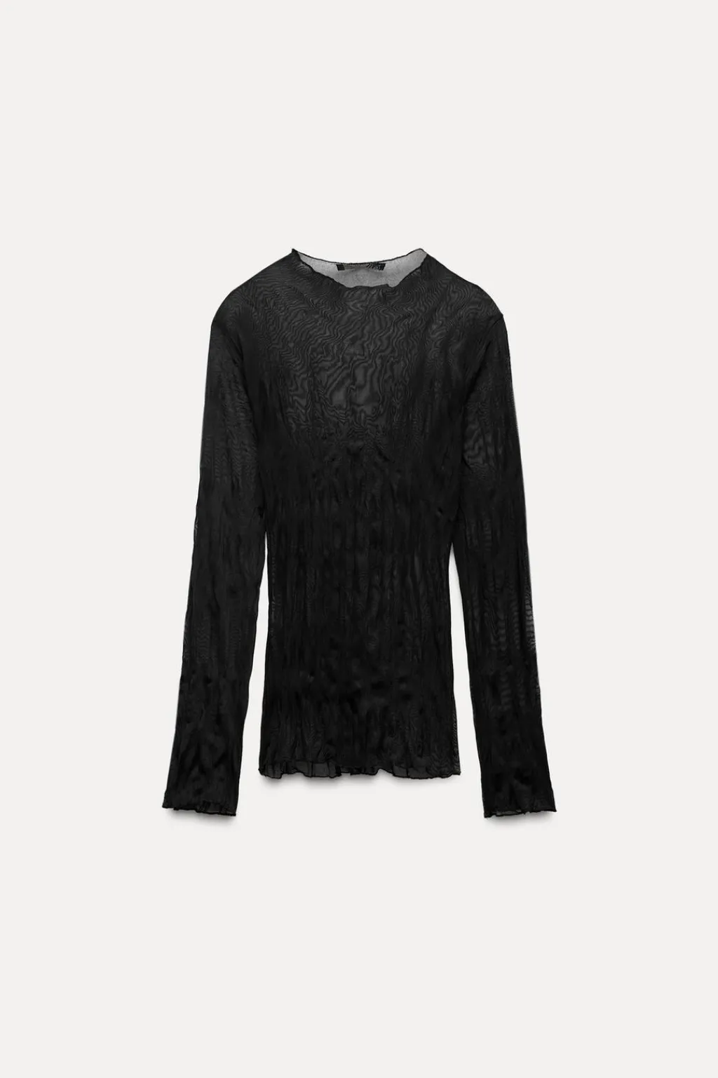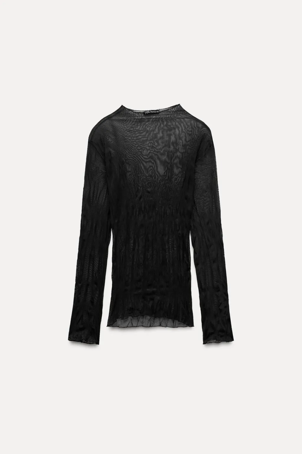 Top semitransparente confeccionado en tejido efecto arrugado. Cuello subido y manga larga.
