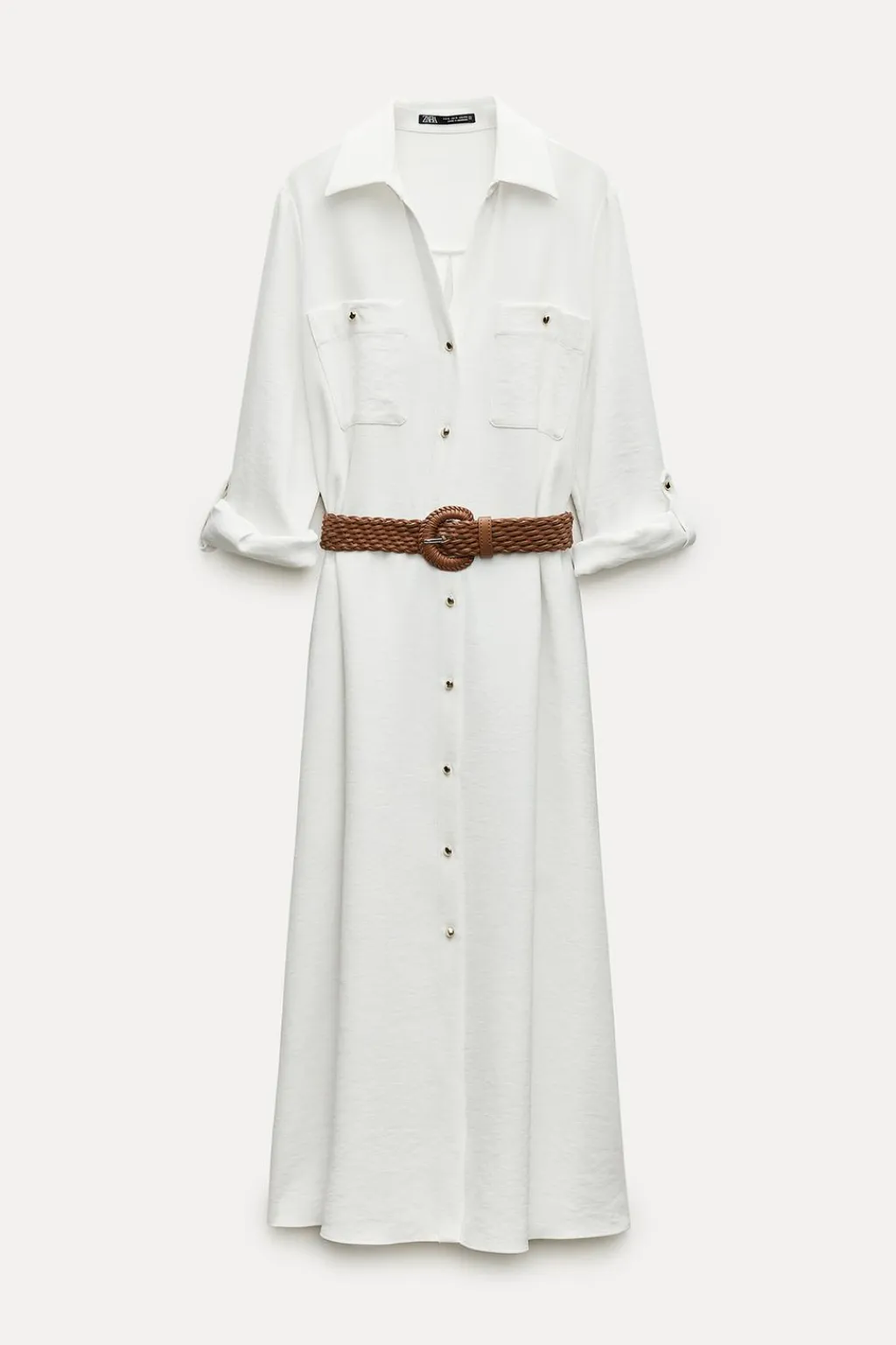 Vestido midi de cuello solapa con escote pico y manga acabada en vuelta con trabilla y botón. Bolsillos delanteros de plastrón. Cierre frontal con botones y cinturón.