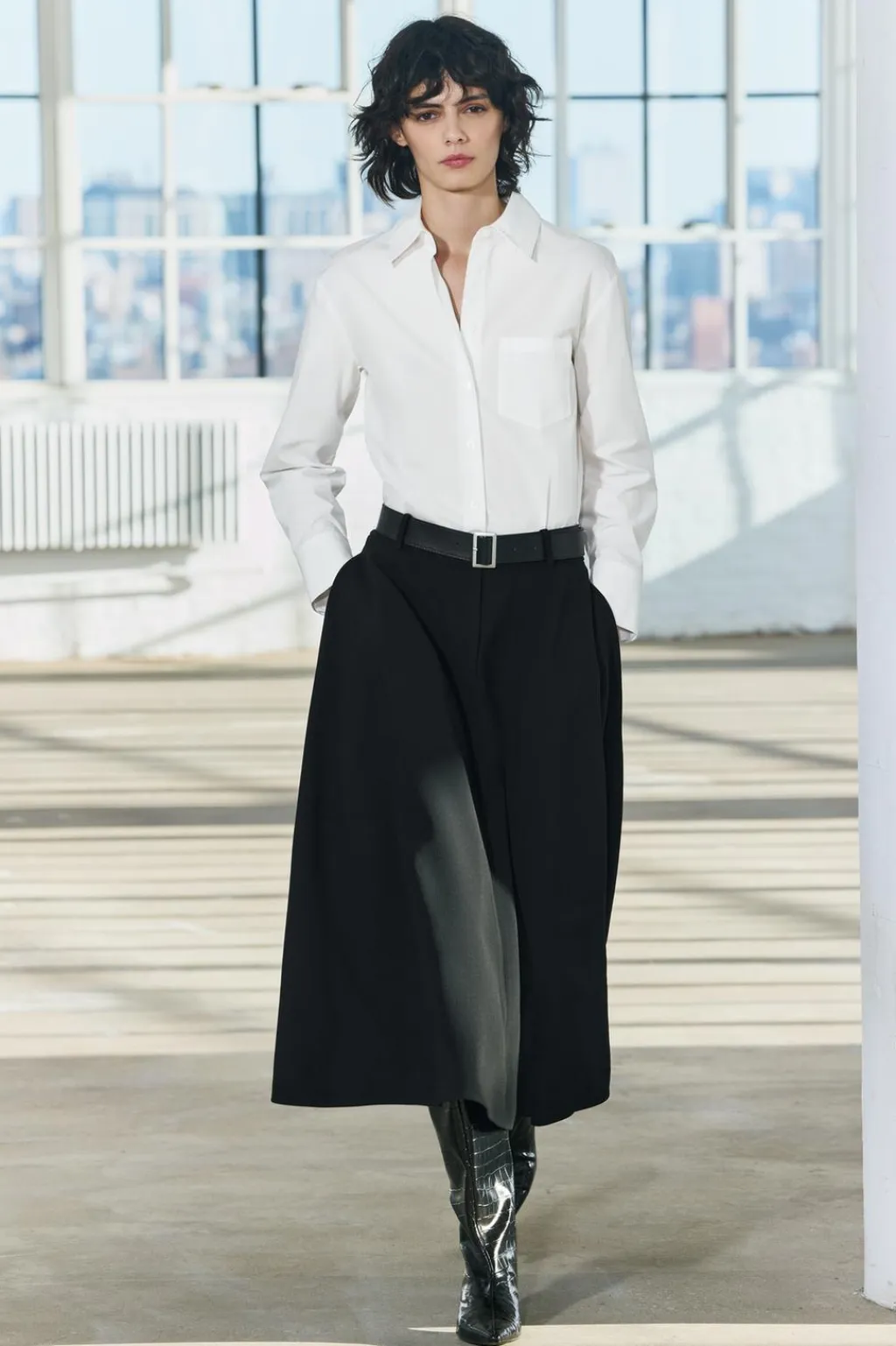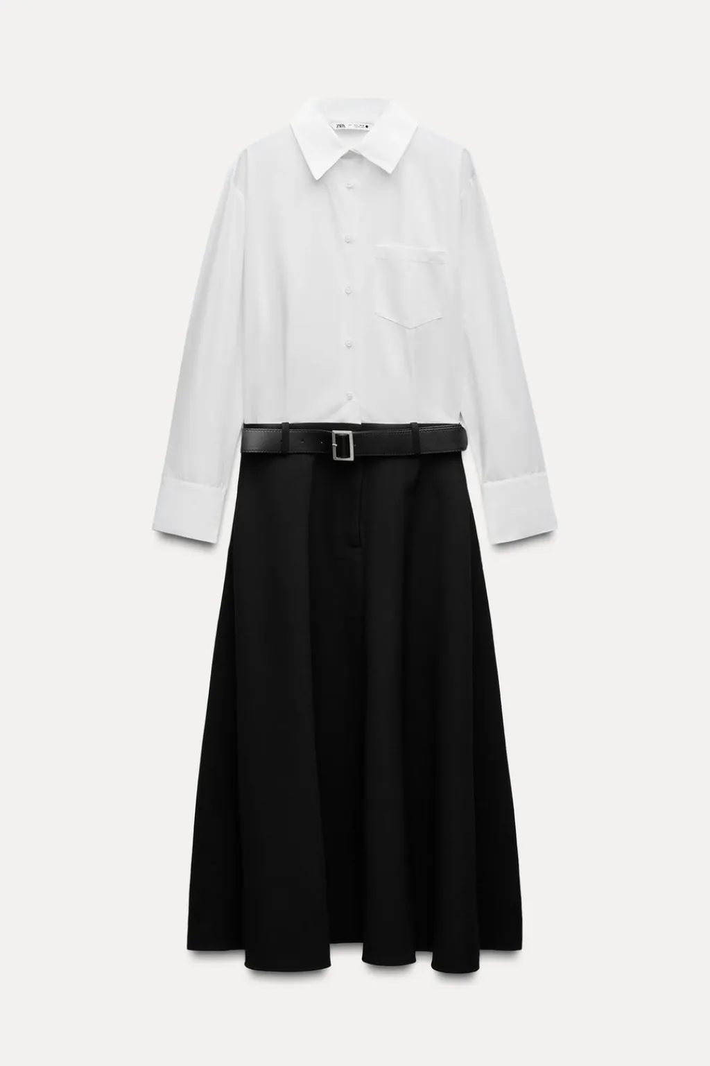 Vestido midi de cuello solapa con manga larga acabada en puño. Bolsillos laterales ocultos en costura. Cinturón a tono ajustable con hebilla metálica. Detalle de combinación de tejidos a contraste. Bajo acabado en línea evasé. Cierre frontal con botones.