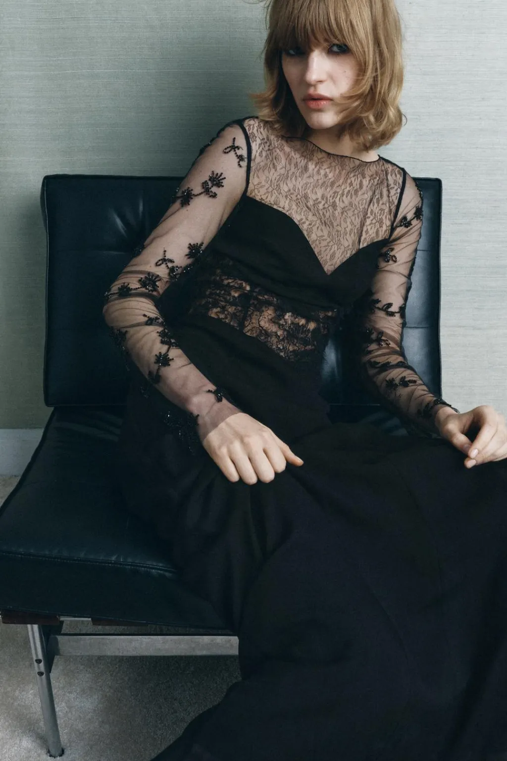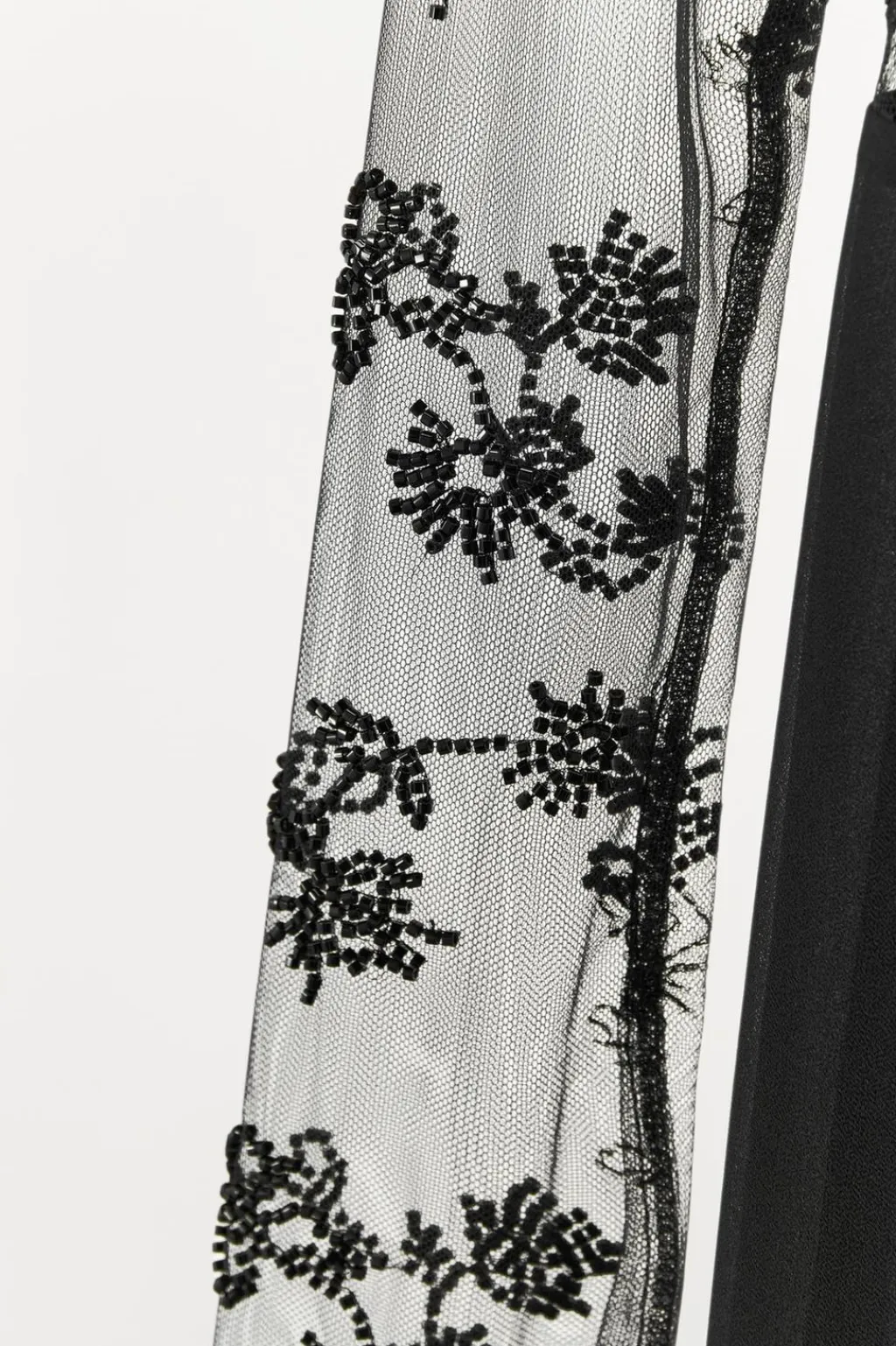 Vestido largo de cuello barco y manga larga. Detalle de encaje y aplicación de lentejuelas y abalorios combinados a tono. Forro interior. Cierre en espalda con cremallera metálica.