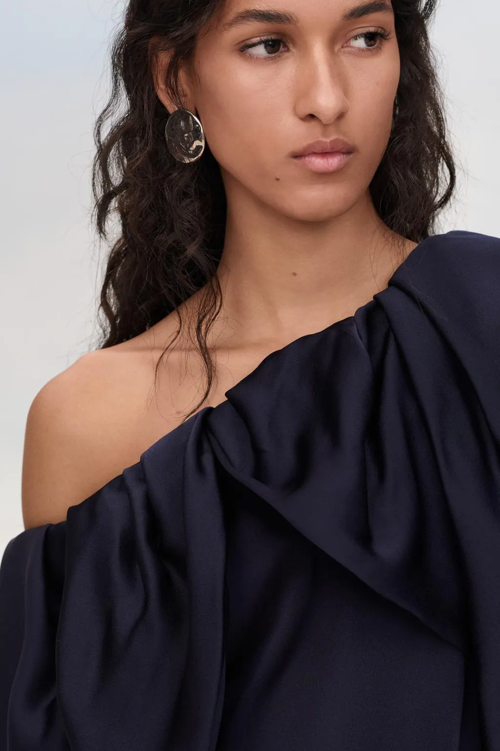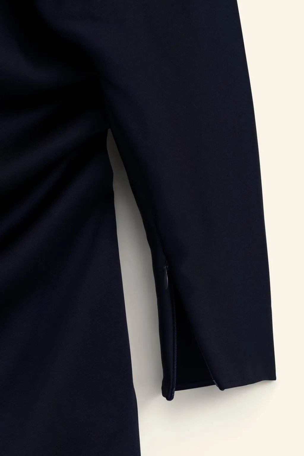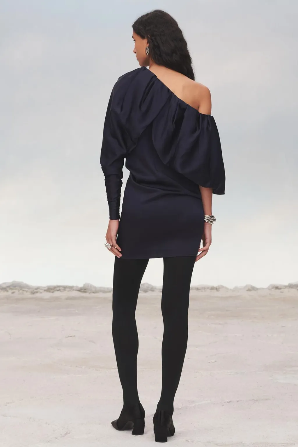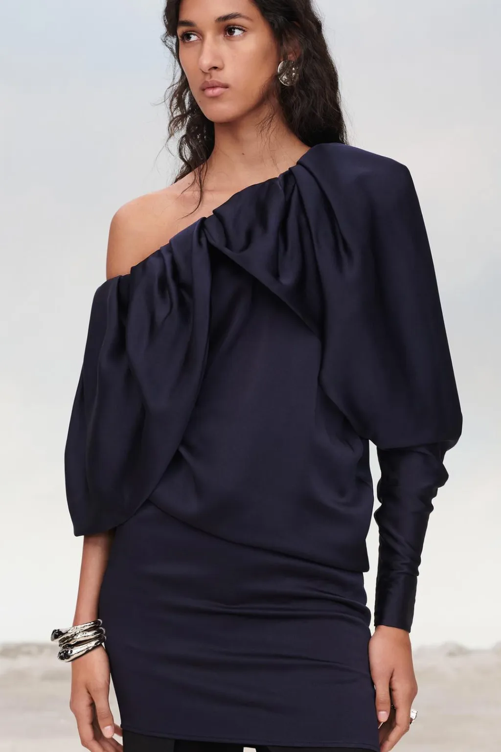Vestido corto confeccionado en hilatura de algodón. Escote asimétrico y manga larga con cremallera oculta en costura. Detalle de superposición en mismo tejido tipo capa y drapeado lateral.