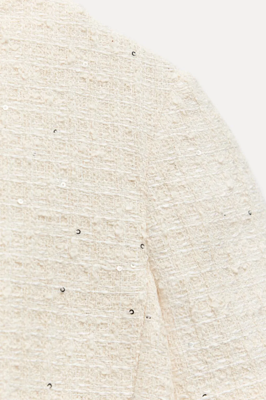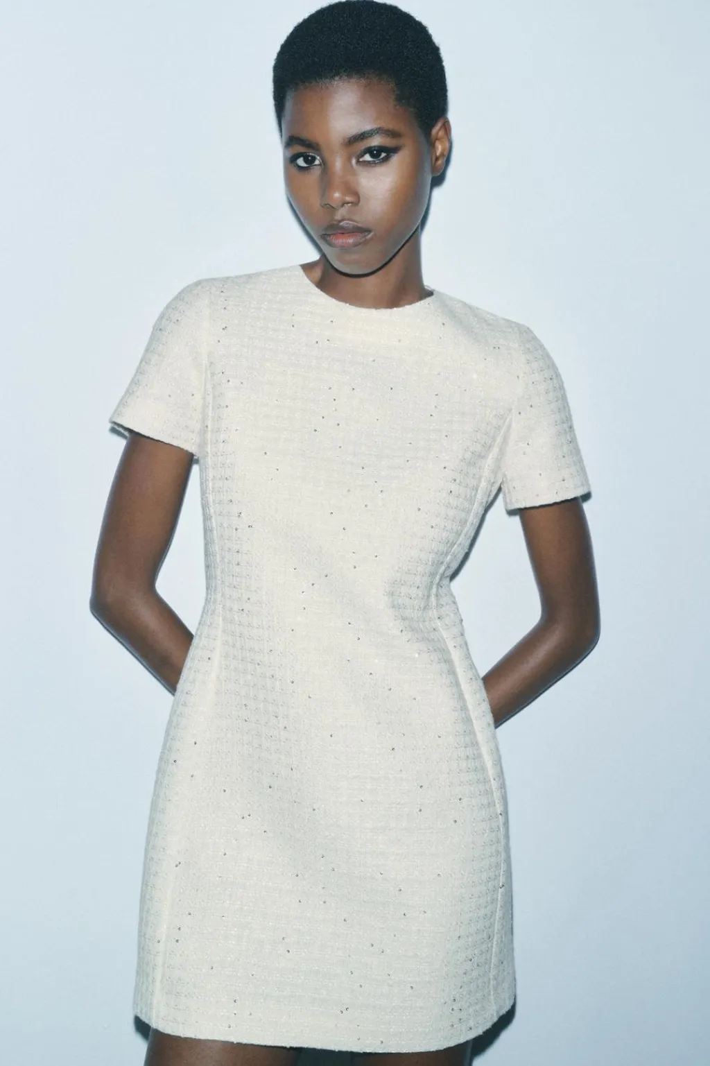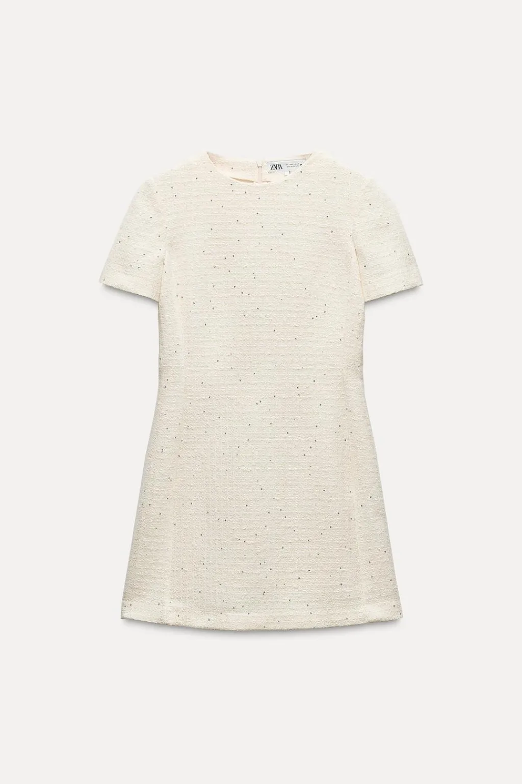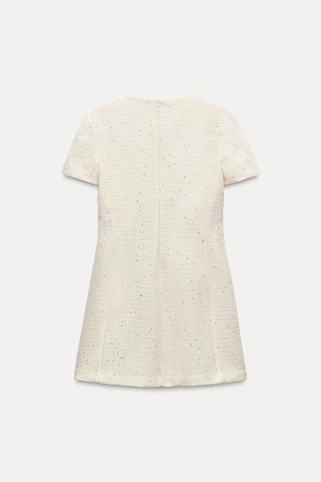 Vestido corto confeccionado en hilatura con algodón. Cuello redondo y manga corta. Detalle de aplicación de brillos. Cierre en espalda con cremallera oculta en costura.