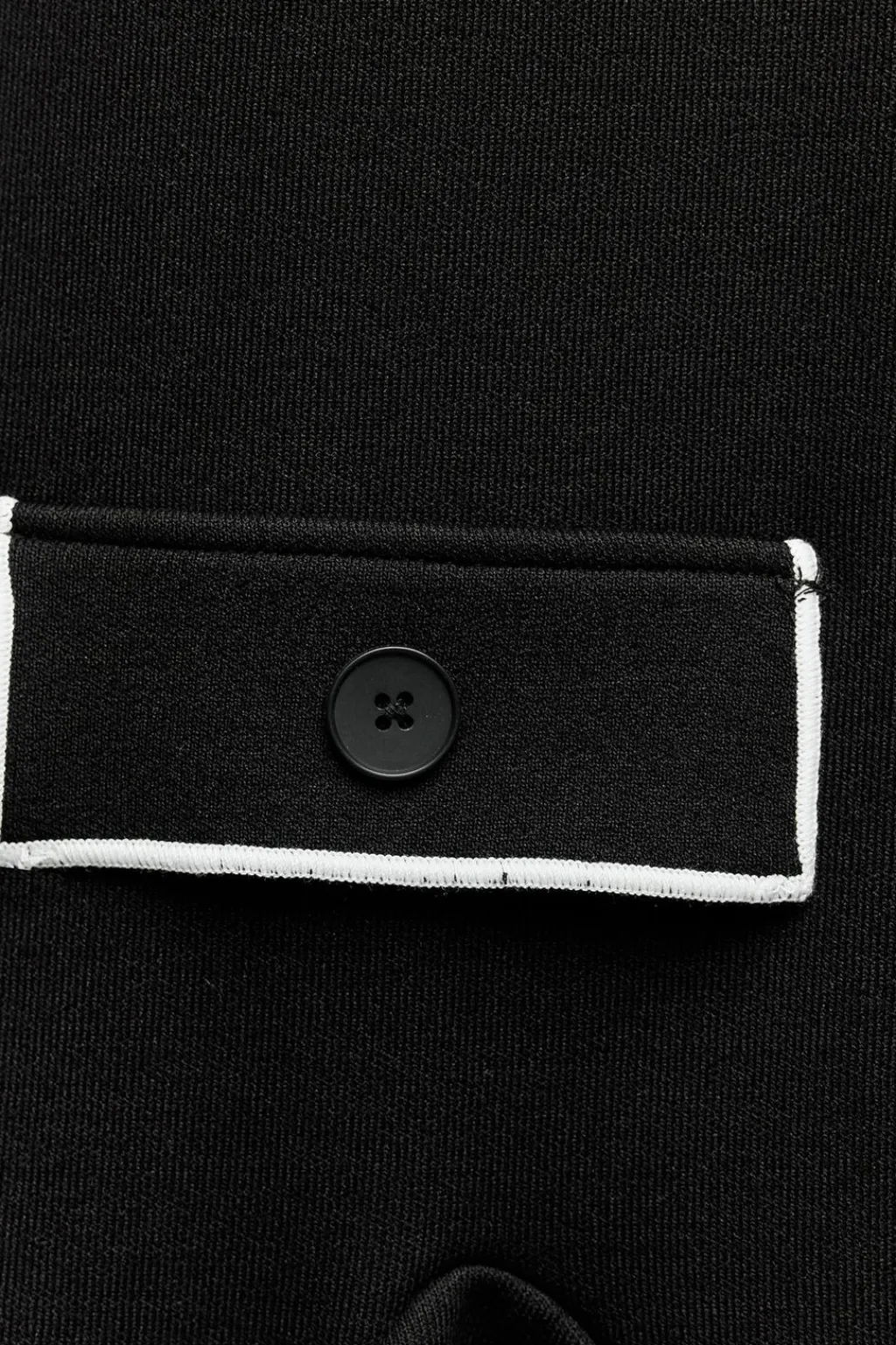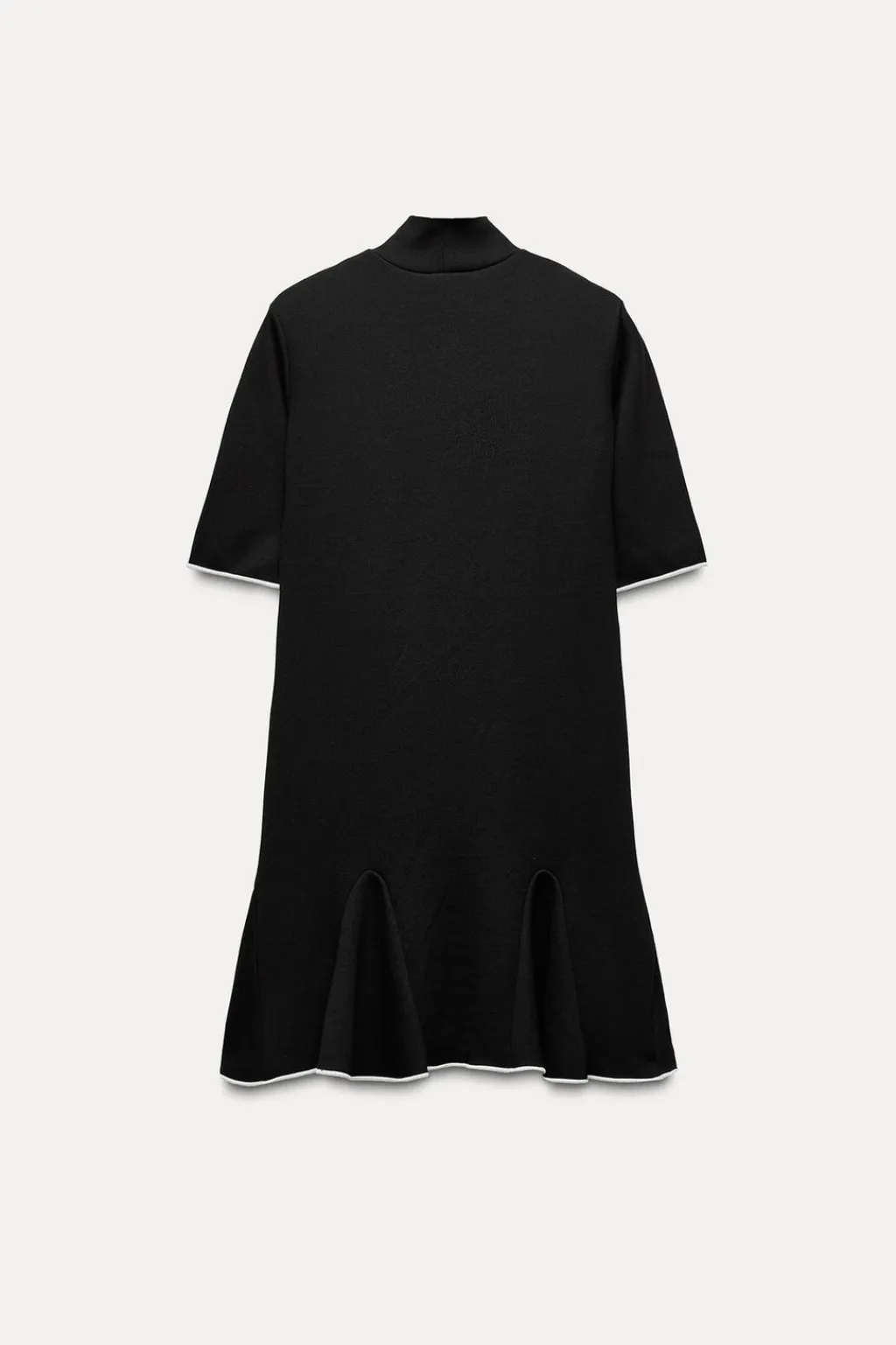 Vestido corto confeccionado en hilatura con mezcla de viscosa. Cuello perkins y manga corta. Falsos bolsillos de vivo con solapa y botón en delantero. Detalle de vivos a contraste. Bajo acabado en godets.