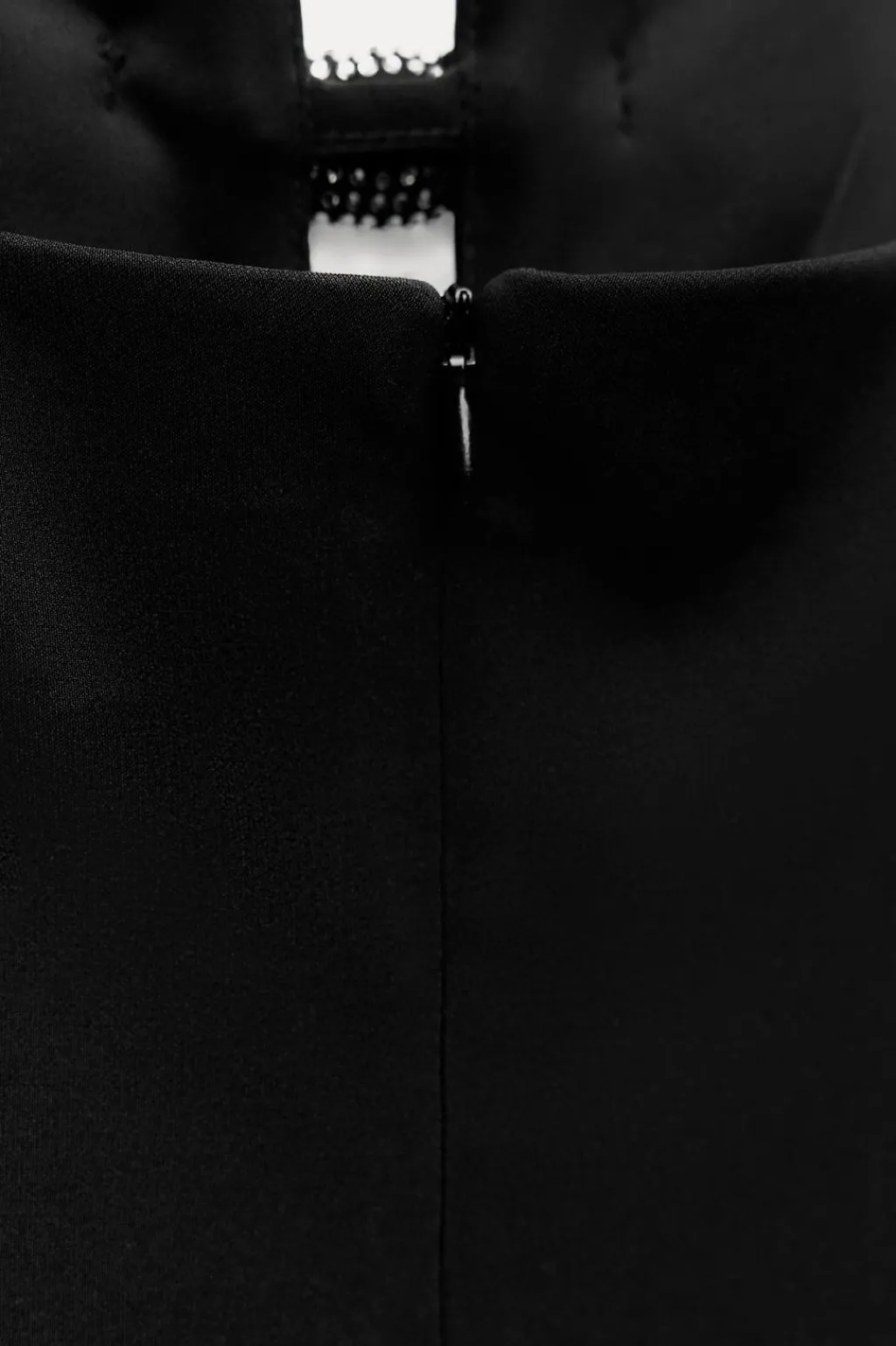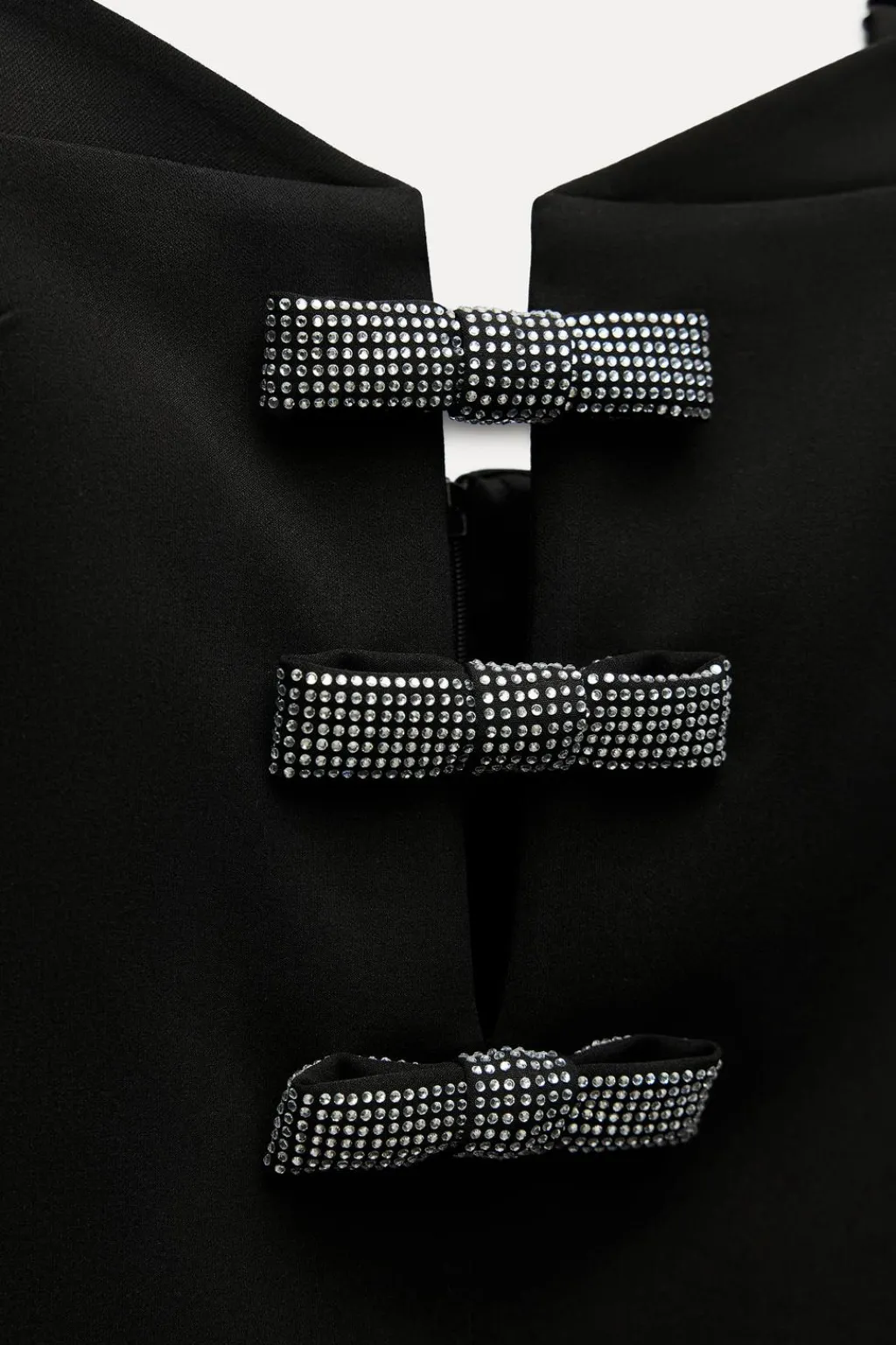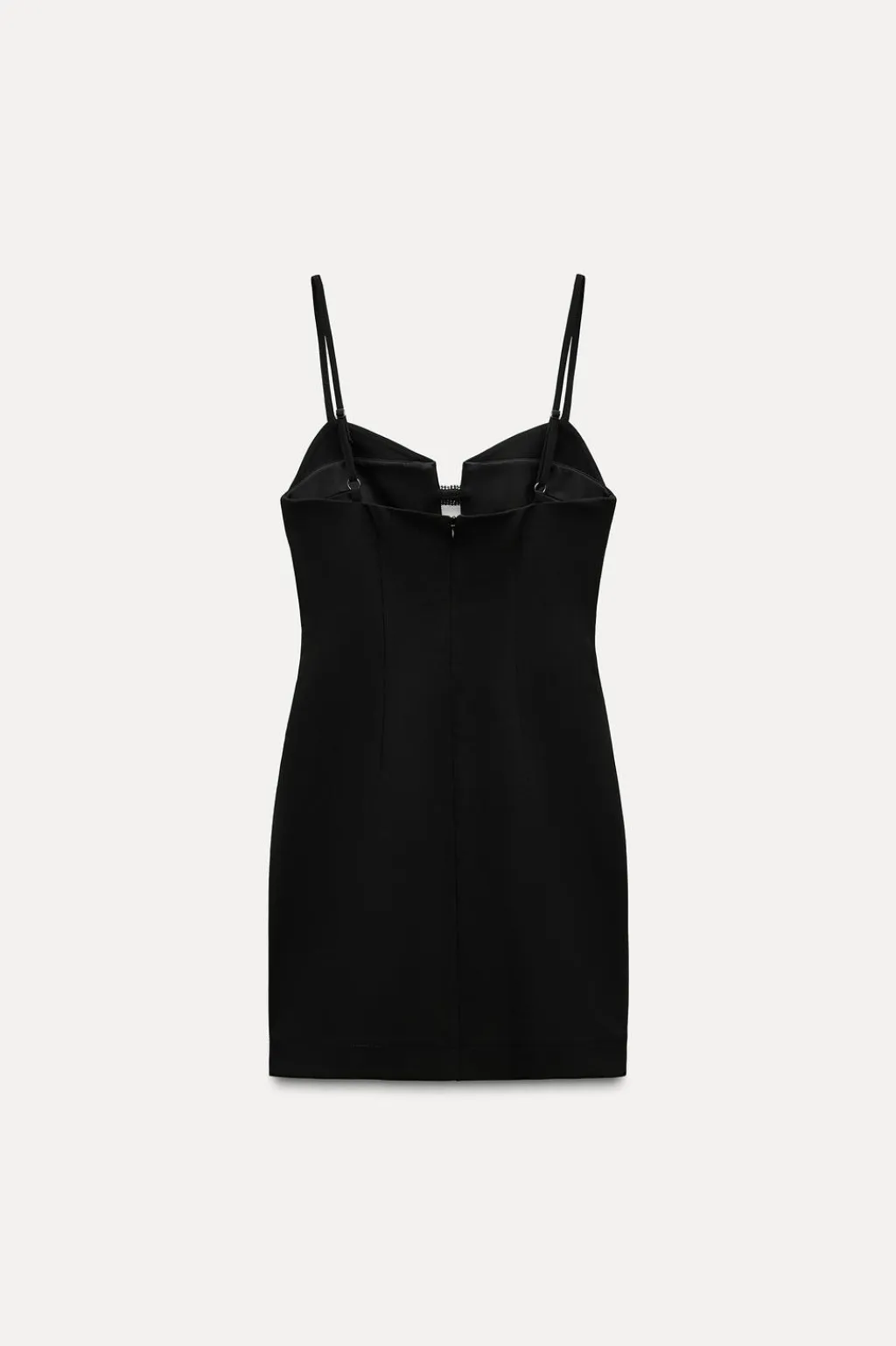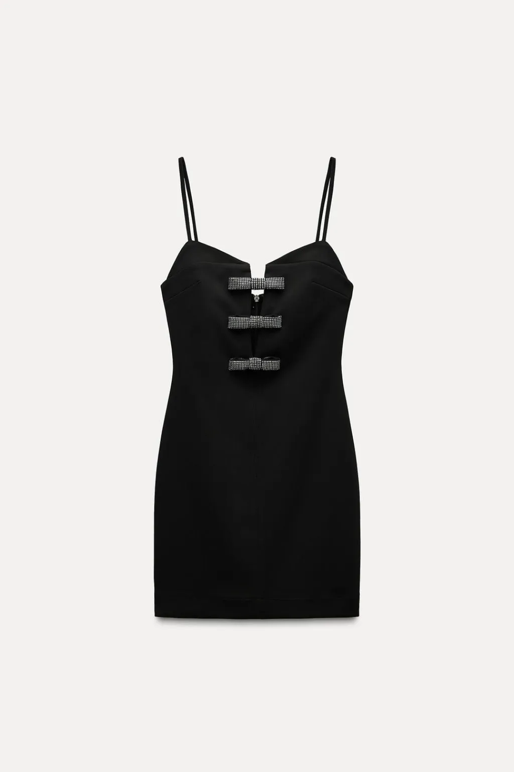 Vestido corto de escote pico con tirantes finos ajustables. Detalle de abertura y lazos con aplicación brillos en pecho. Forro interior combinado a tono. Cierre en espalda con cremallera oculta en costura.