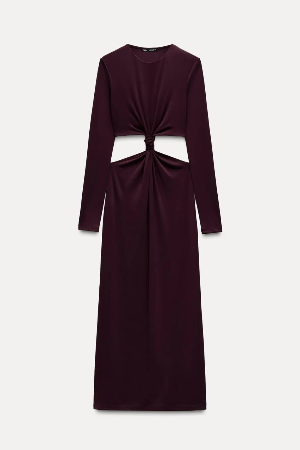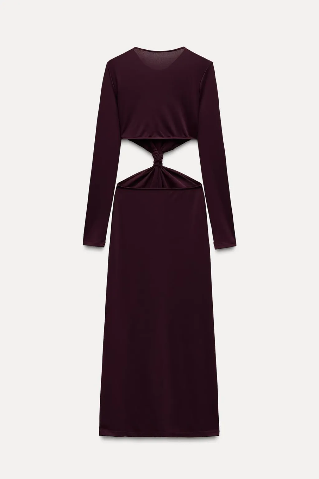 Vestido largo de cuello redondo y manga larga. Detalle de nudo en delantero y abertura en cintura.