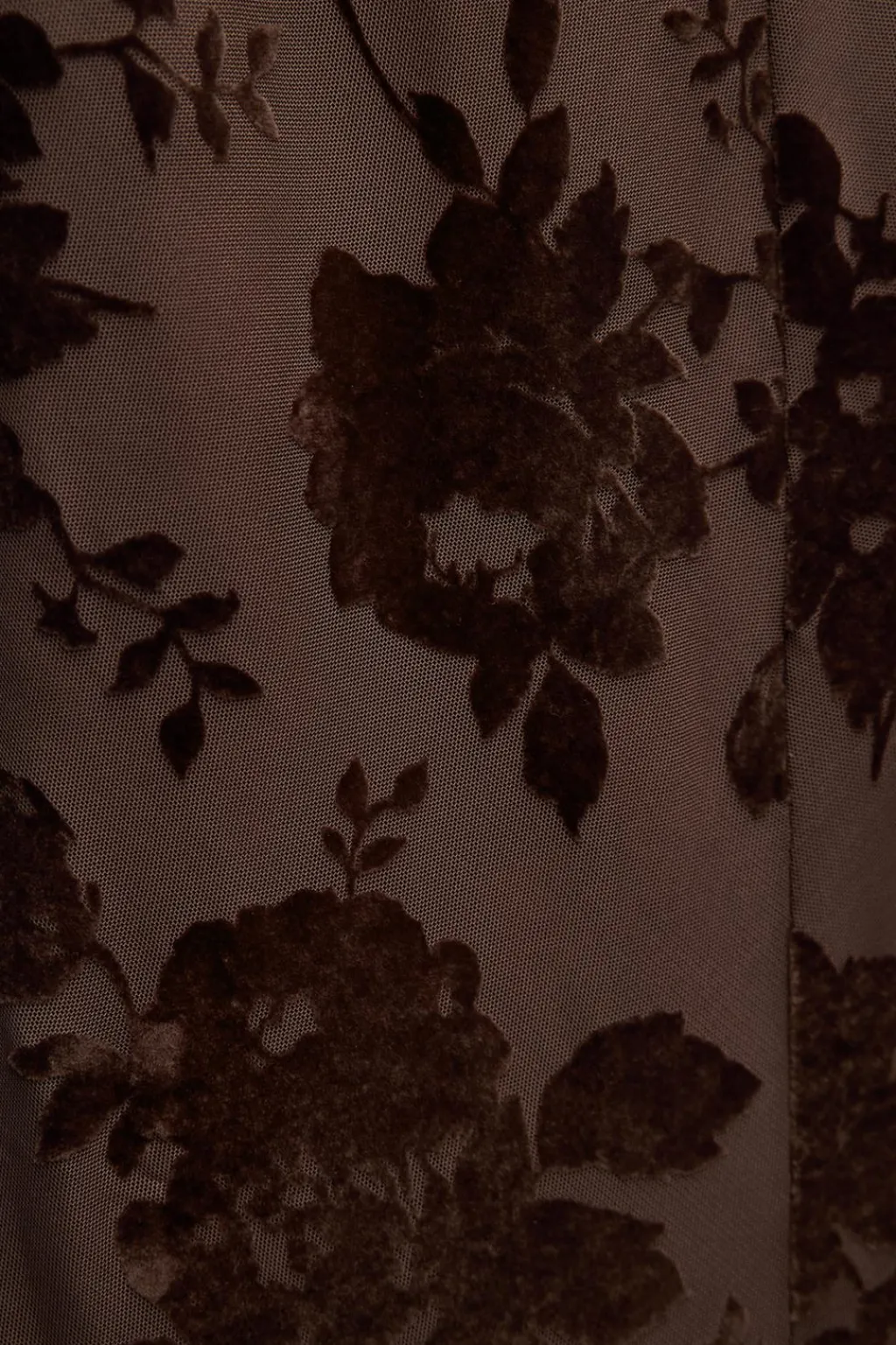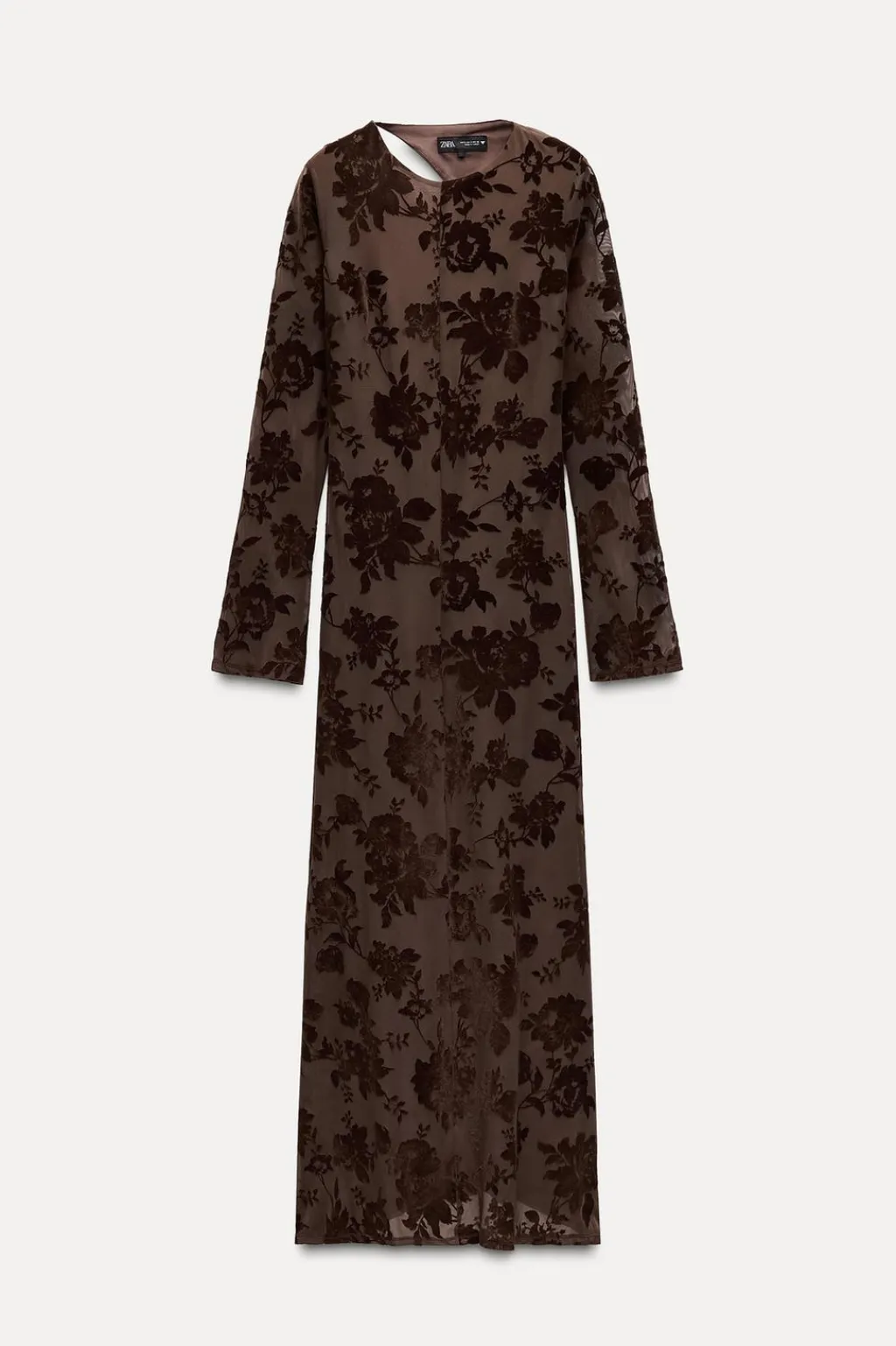 Vestido largo de cuello redondo y manga larga. Detalle de flores flocadas. Espalda descubierta con escote fluído y cierre con botón. Forro interior.