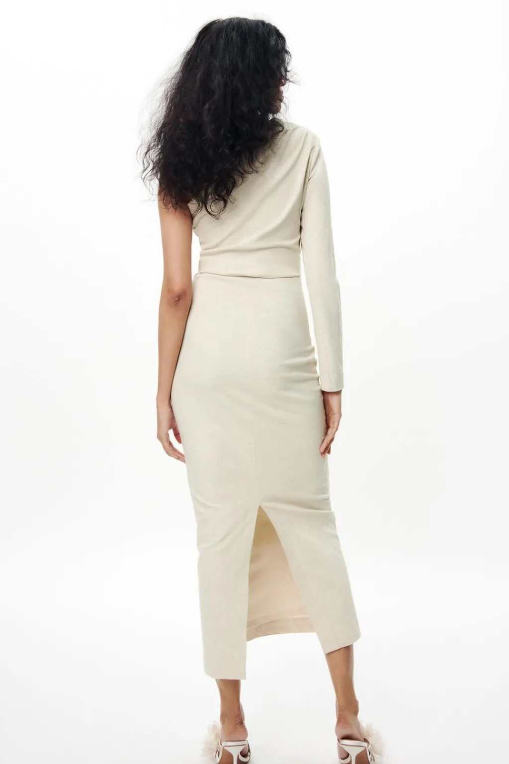 Vestido midi de escote asimétrico y manga larga. Detalle de tejido drapeado. Bajo acabado en abertura. Cierre con cremallera oculta en costura.