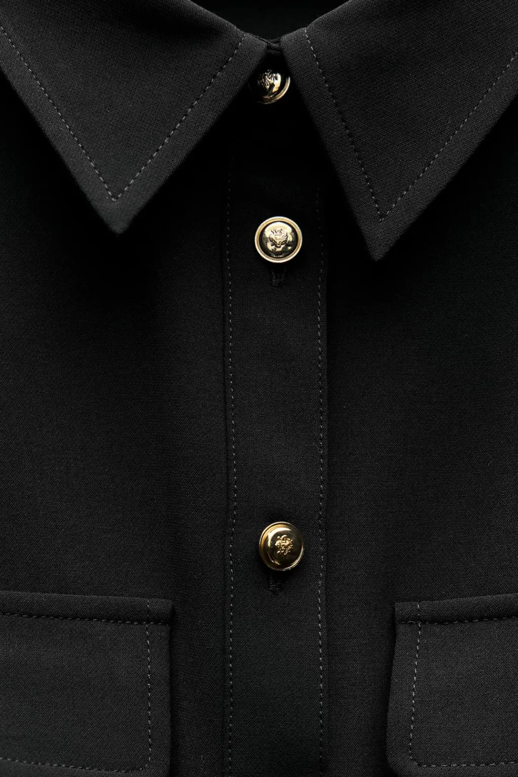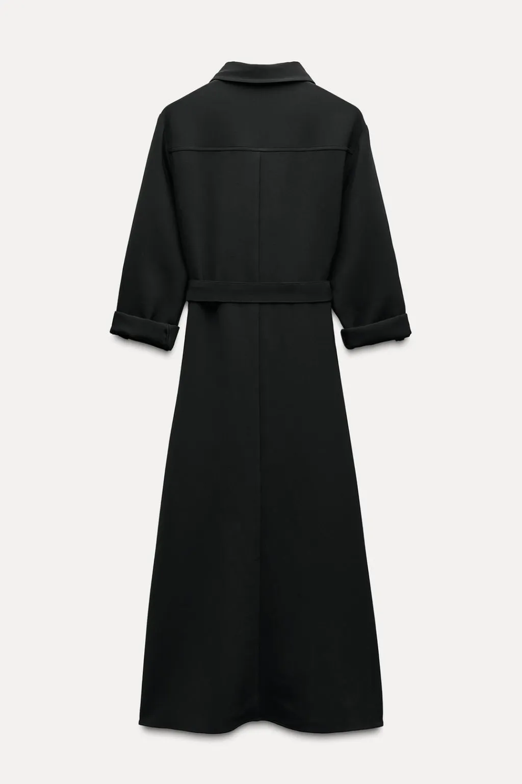 Vestido de cuello solapa y manga larga acabada en vuelta con trabilla. Bolsillos delanteros de plastrón con solapa. Cintura entallada con cinturón a tono y bajo en evasé. Cierre frontal con botones dorados.