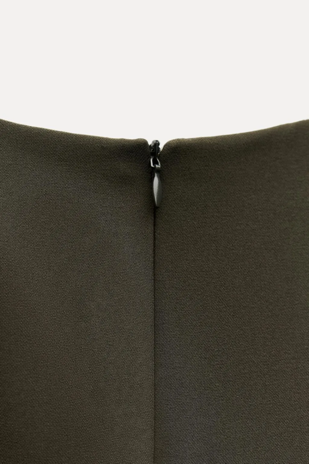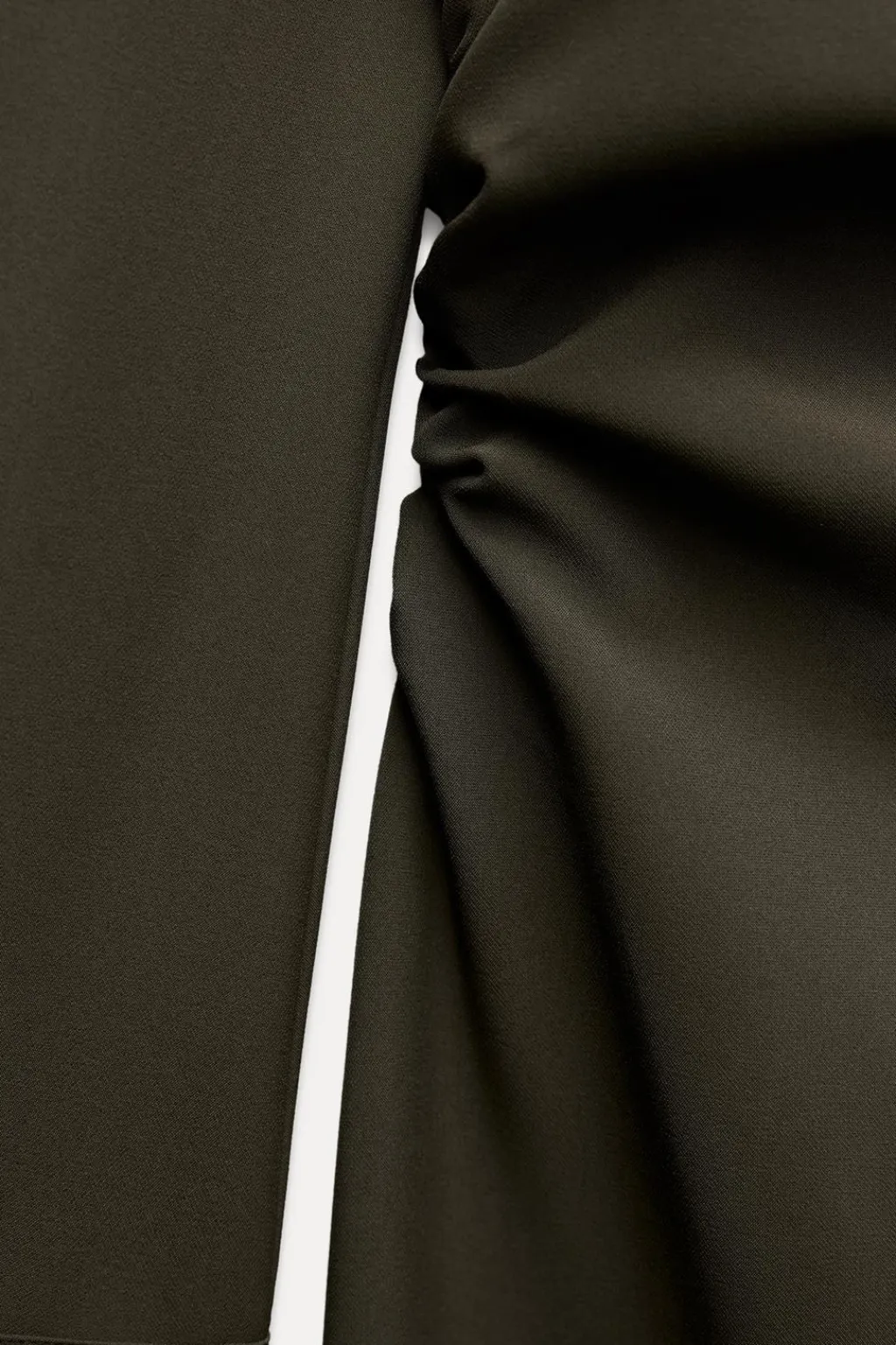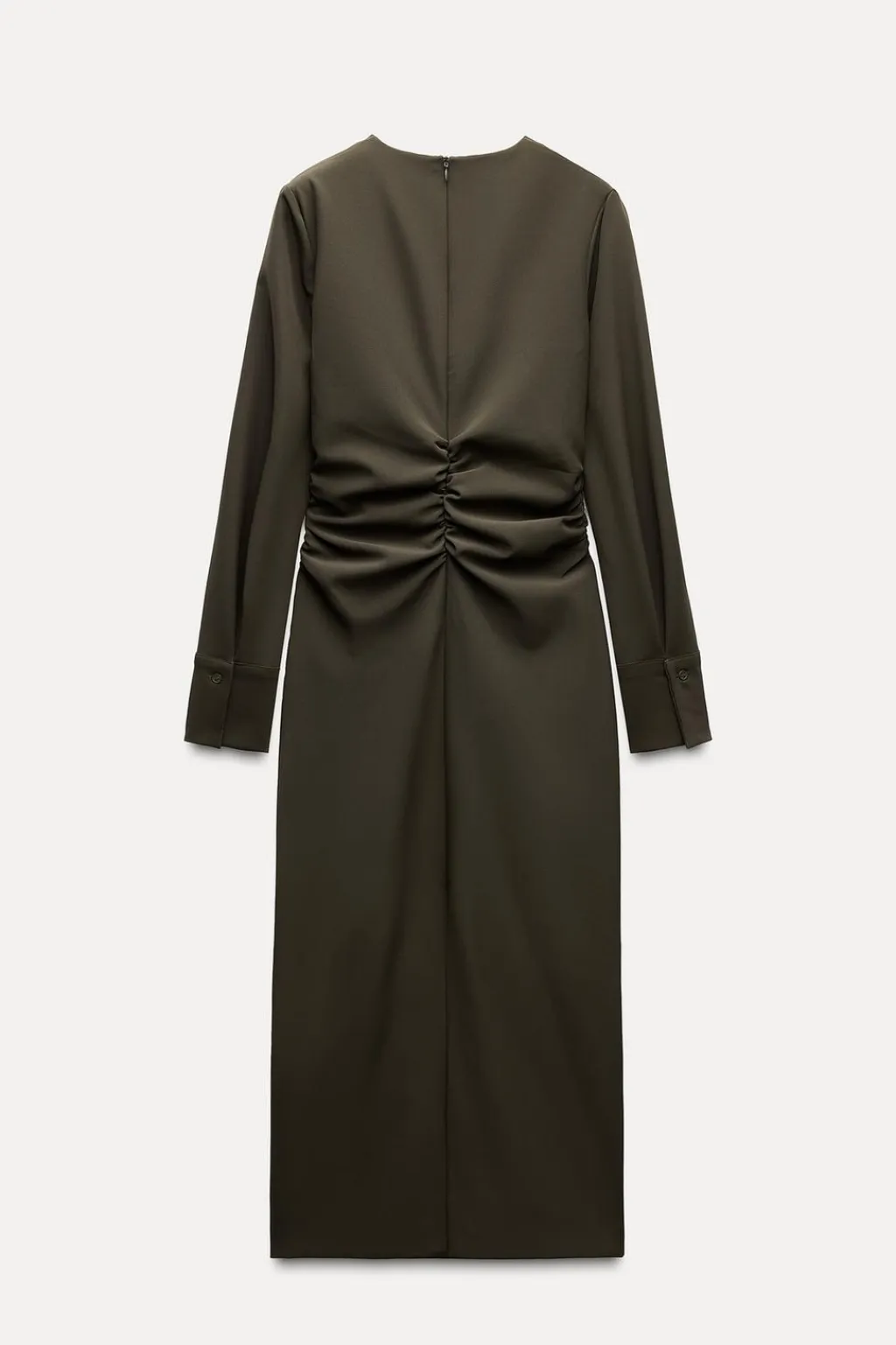Vestido midi de cuello redondo y manga larga acabada en puño. Detalle de drapeado lateral. Cierre en espalda con cremallera oculta en costura.
