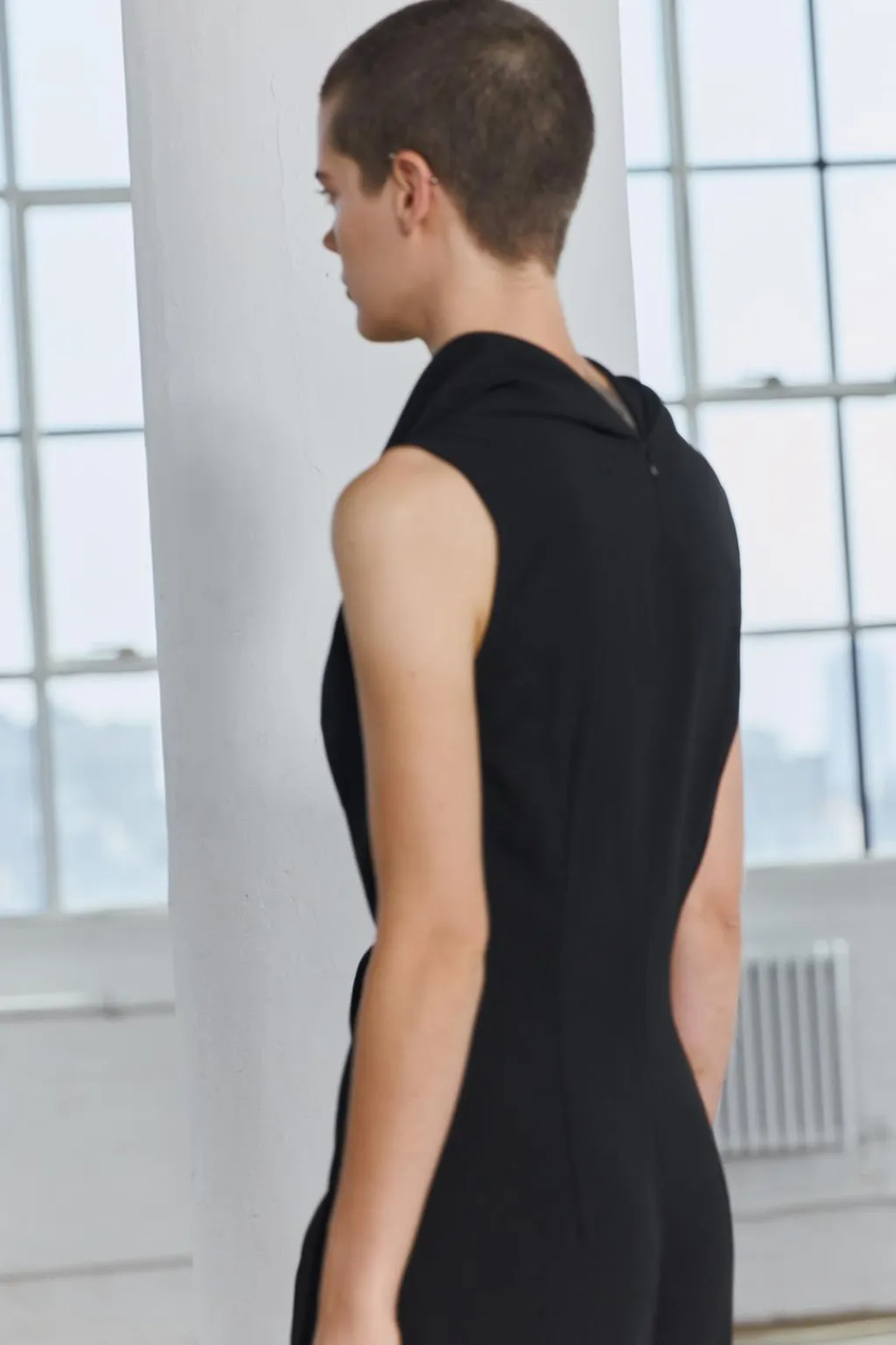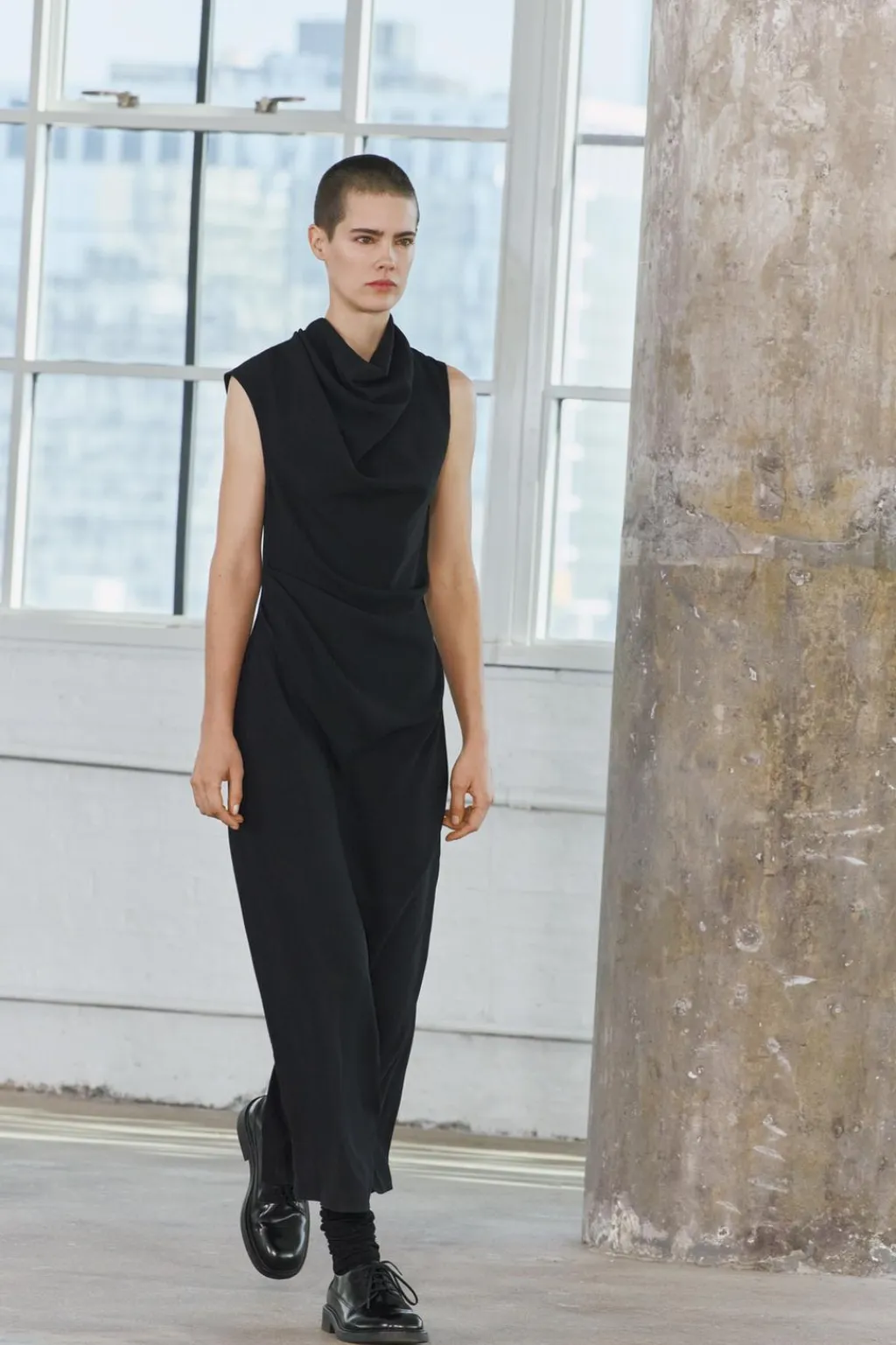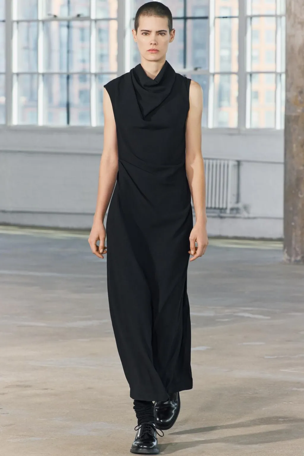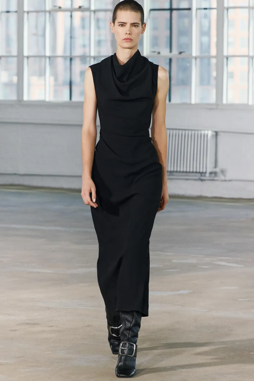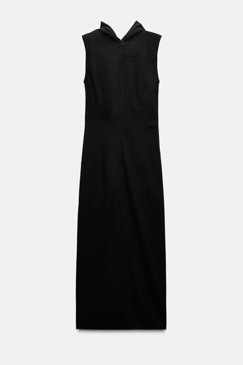Vestido midi de cuello fluido y manga sisa. Detalle de tejido drapeado.