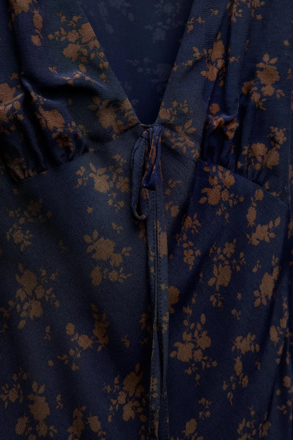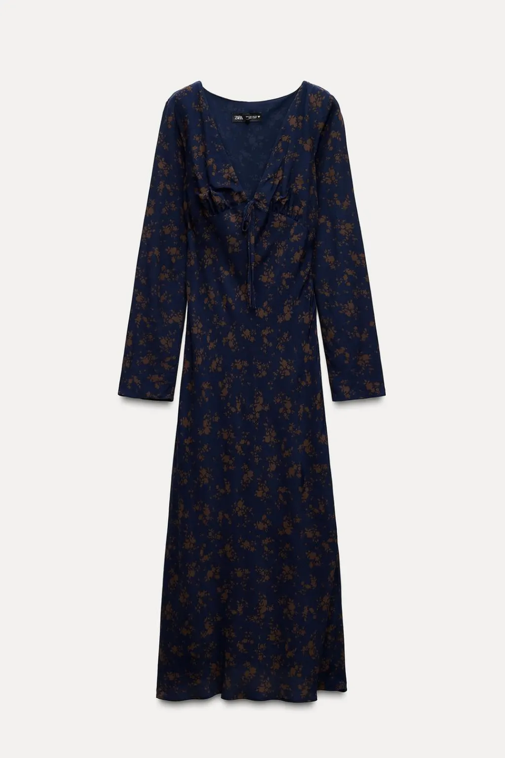 Vestido midi de escote pico con lazada y manga larga. Forro interior combinado. Cierre lateral con cremallera oculta en costura.