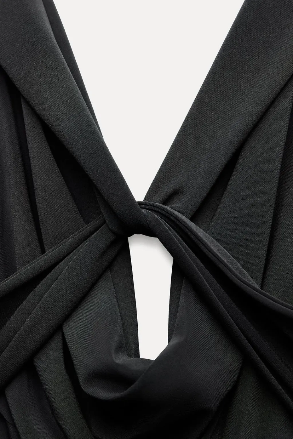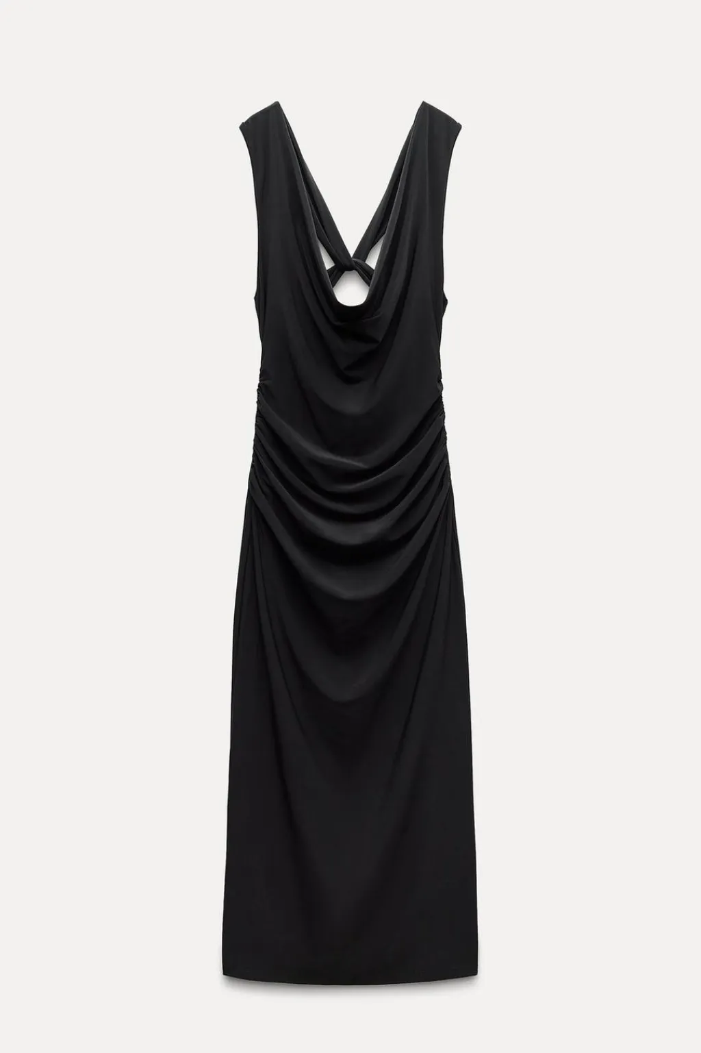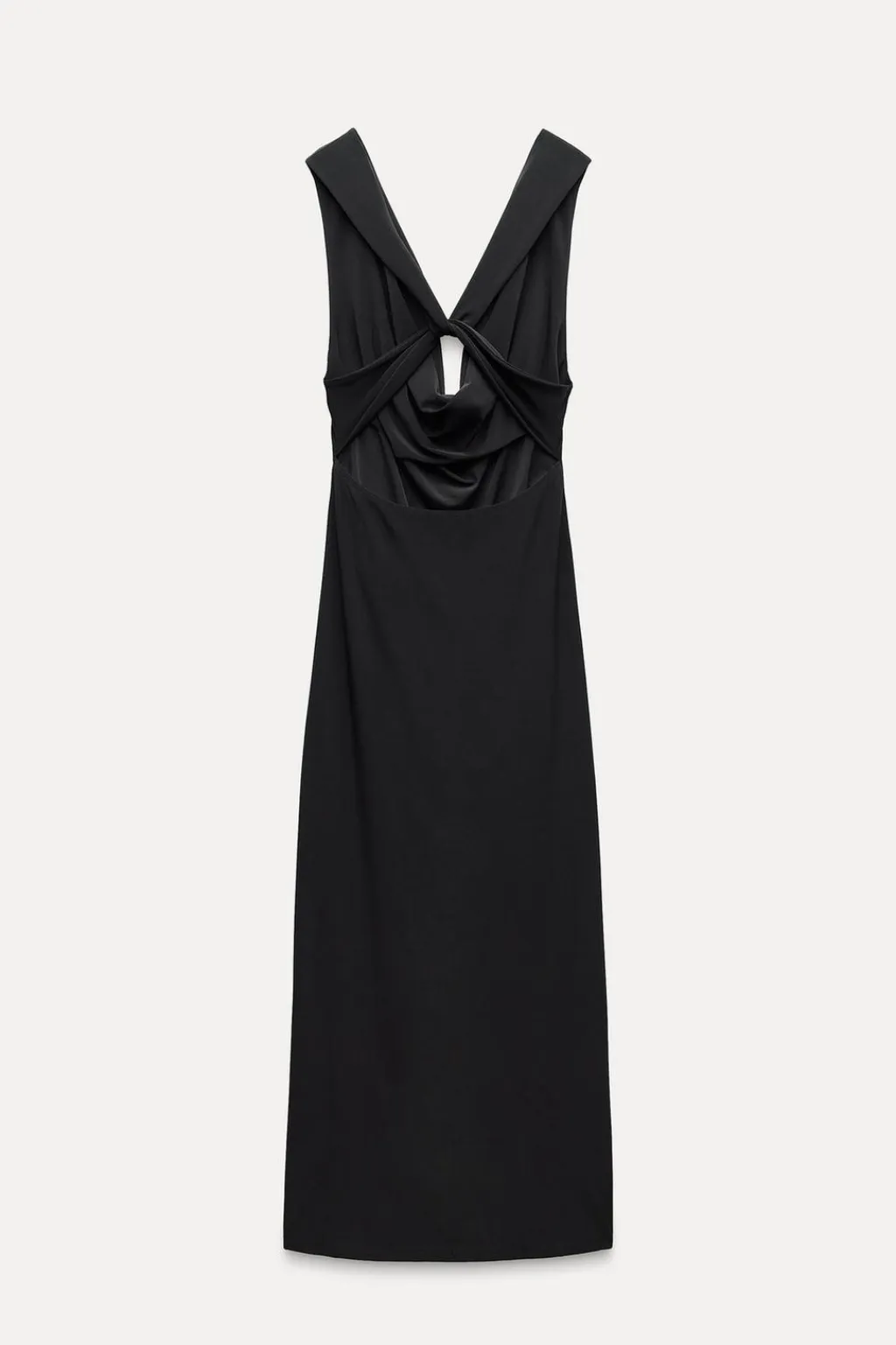 Vestido midi de escote fluido y manga sisa. Detalle de nudo en espalda.