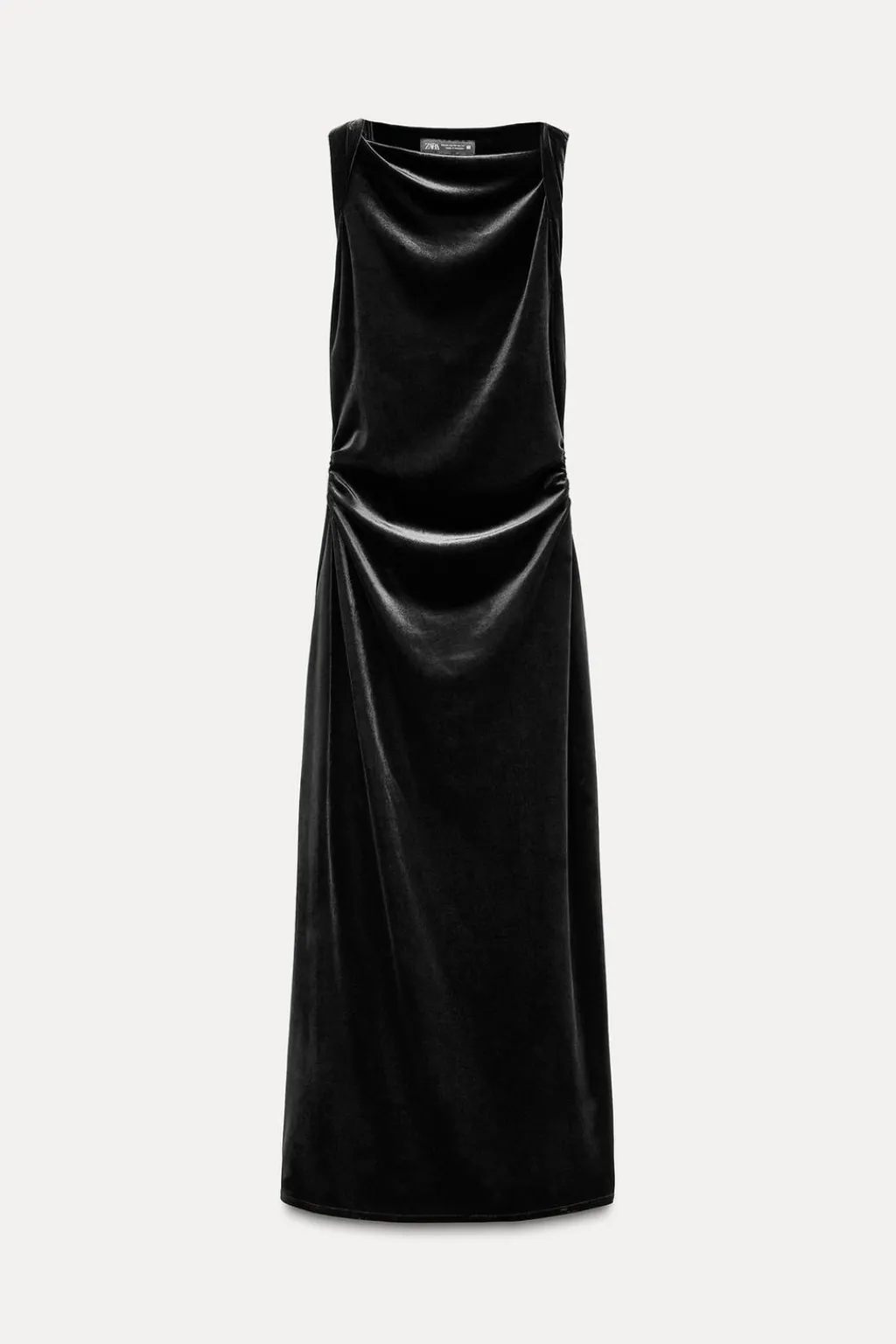 Vestido de cuello redondo y manga sisa enroscada. Detalle de frunces laterales en cintura.