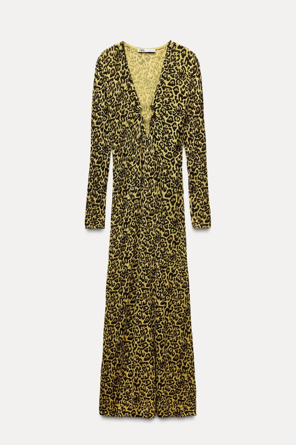 Vestido largo de escote pico pronunciado con aro dorado y frunces. Manga larga.