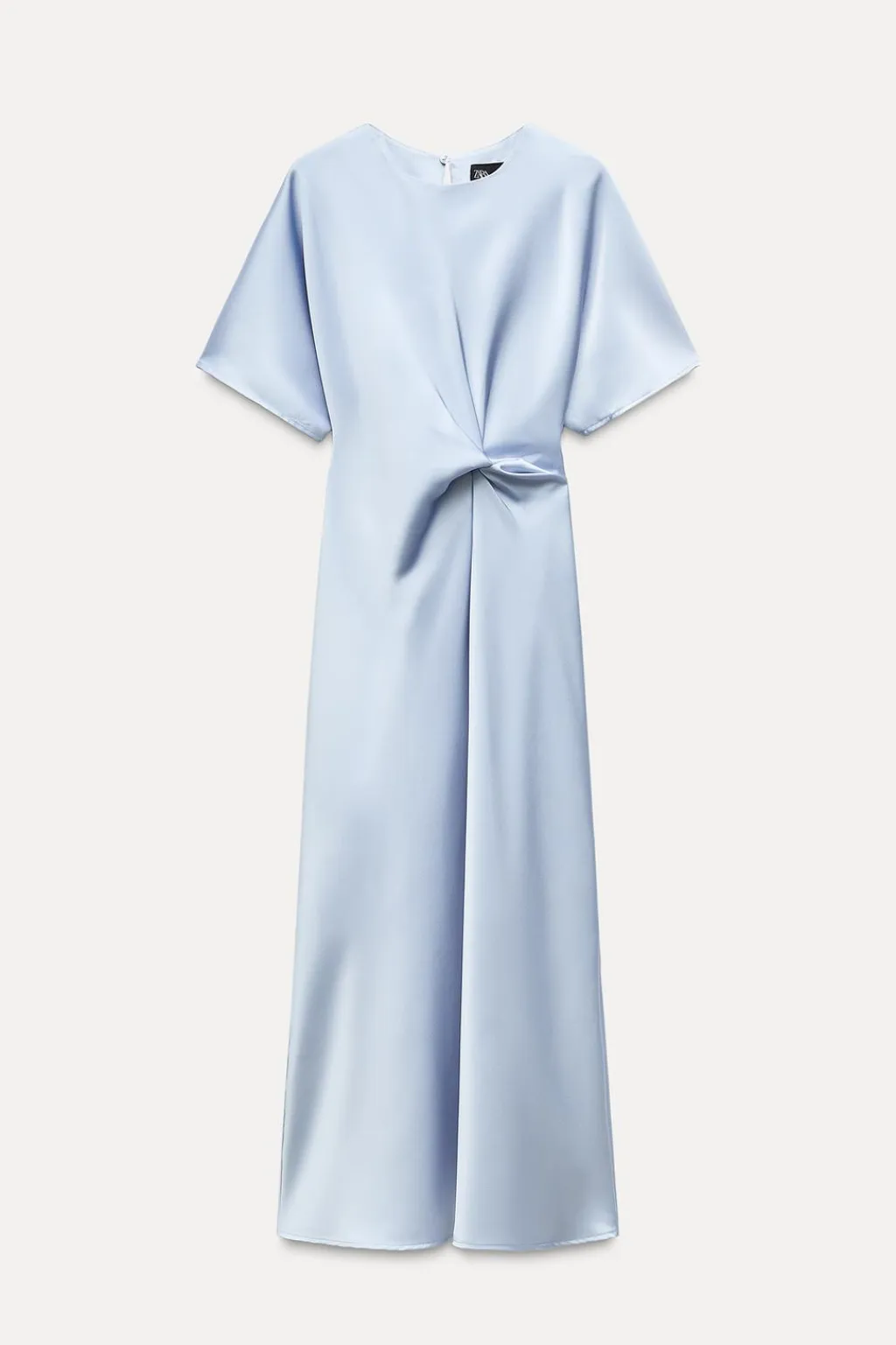 Vestido midi confeccionado en tejido satinado. Cuello redondo y manga corta. Detalle de nudo en lateral. Cierre en espalda con abertura y botón.