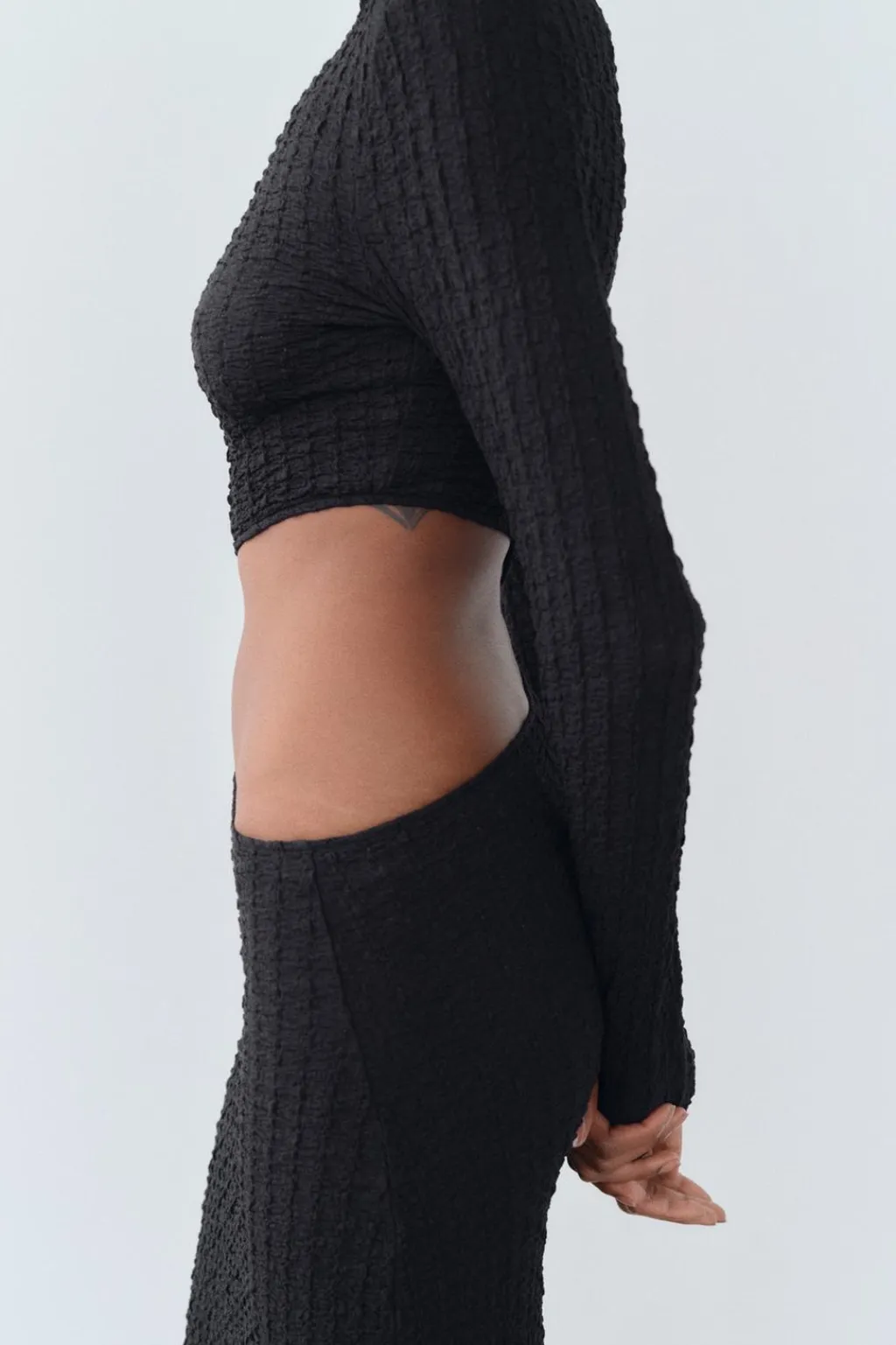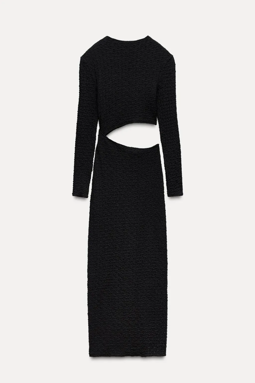Vestido confeccionado en tejido con textura. Cuello subido y manga larga. Detalle de abertura en cintura.