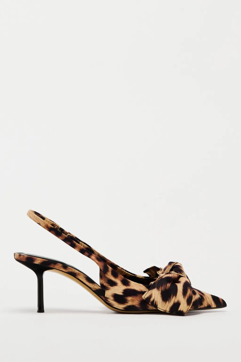 Zapato destalonado de tacón en tejido. Detalle de lazo en la parte delantera. Estampado animal. Tira trasera con pieza elástica. Acabado en punta.