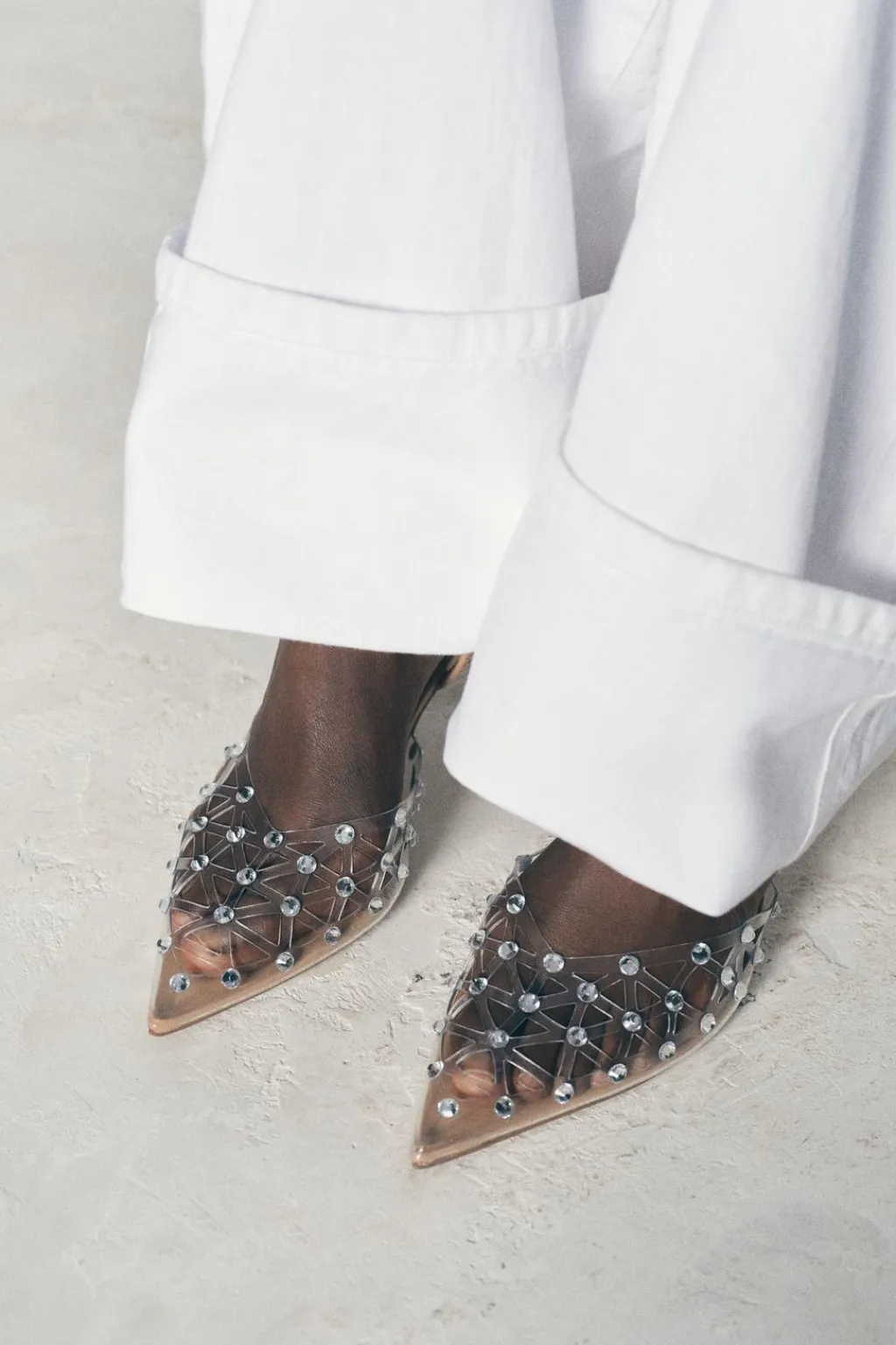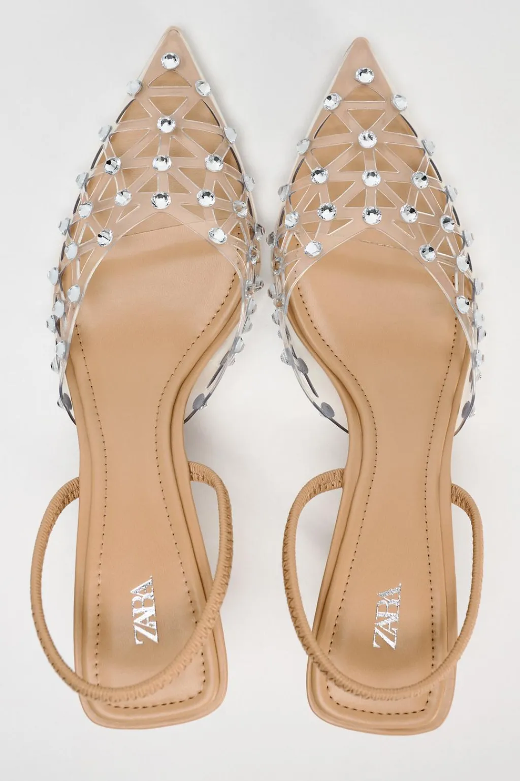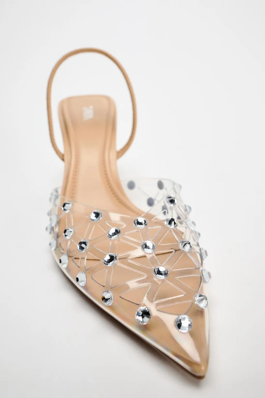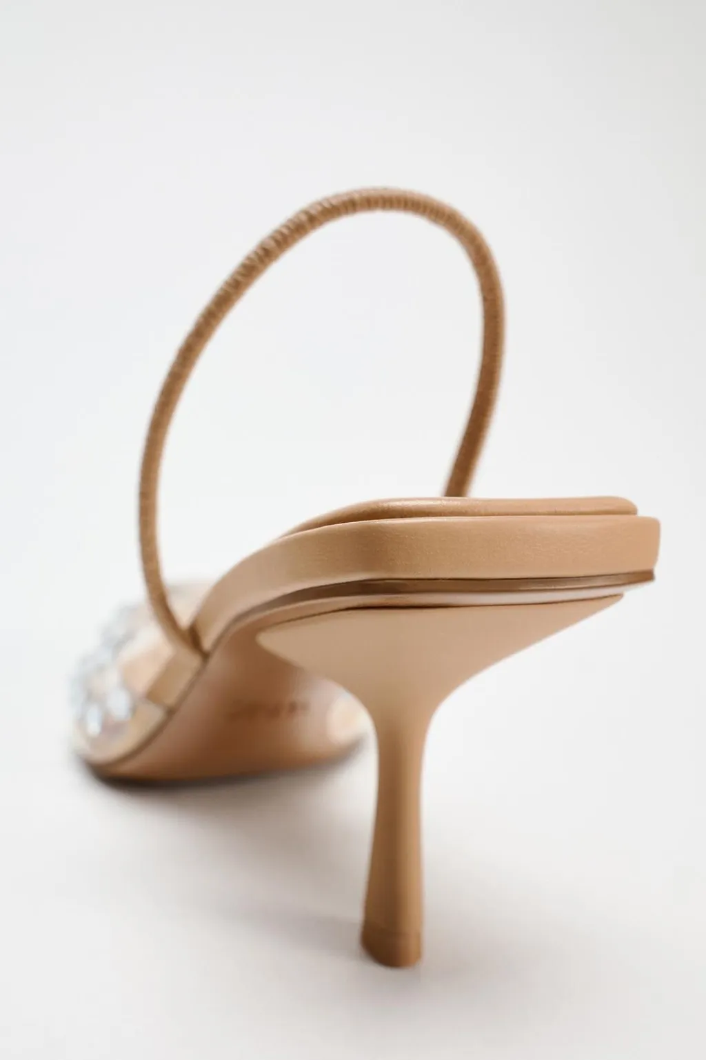 Zapato de tacón alto destalonado en vinilo con detalle de brillos. Tira trasera con elástico. Acabado en punta.