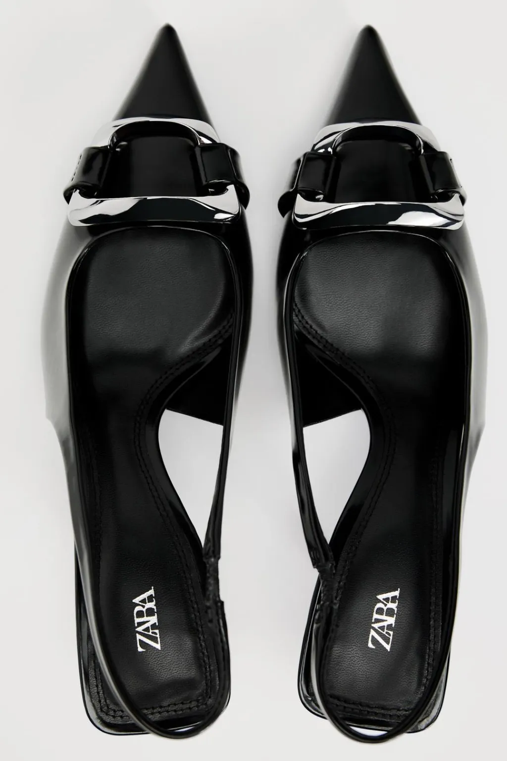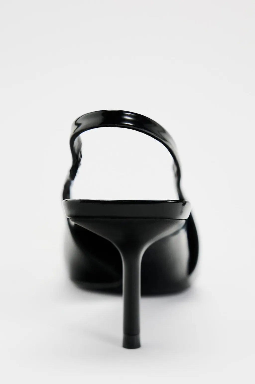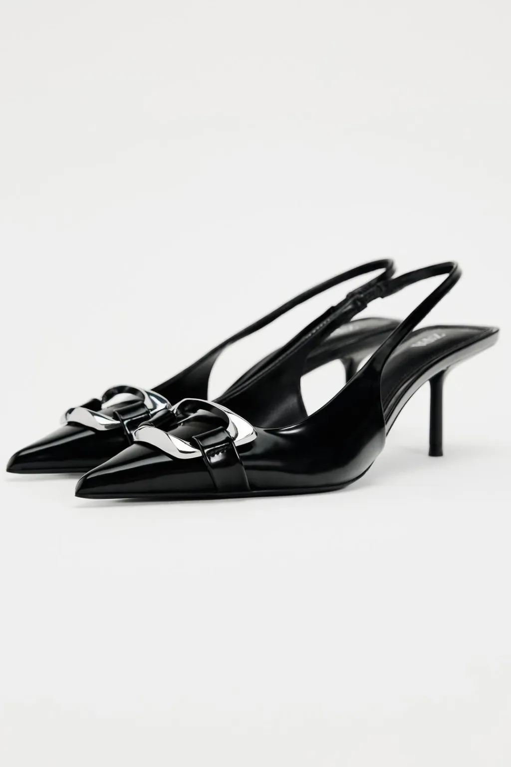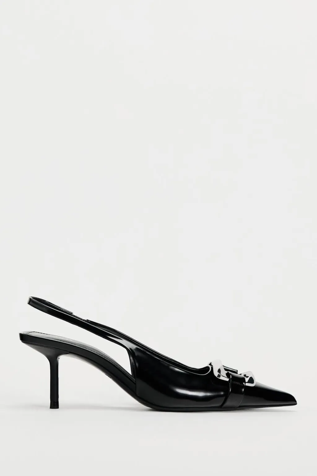 Zapato tacón destalonado. Detalle de pieza metálica en la parte delantera. Tira trasera con elástico. Tacón fino. Acabado en punta.
