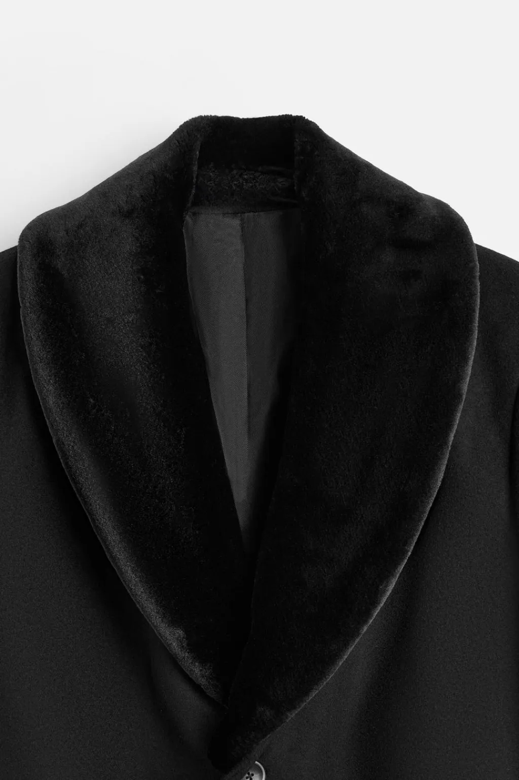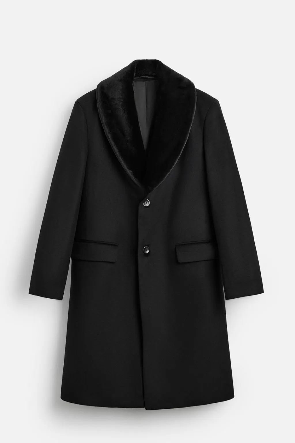 Abrigo regular fit confeccionado en tejido con mezcla de lana. Cuello con solapas de muesca. Detalle de cuello desmontable efecto pelo. Manga larga. Bolsillos de solapa en cadera y detalle de bolsillo interior. Bajo con abertura en centro espalda. Cierre frontal de botonadura.