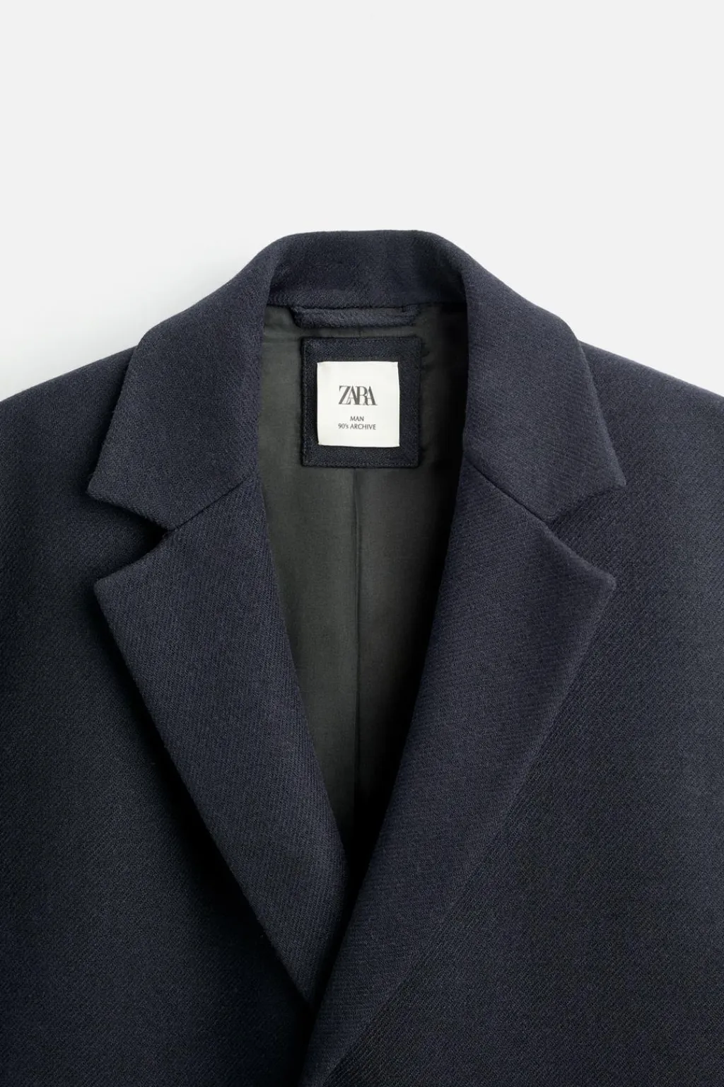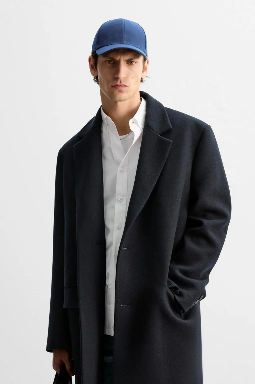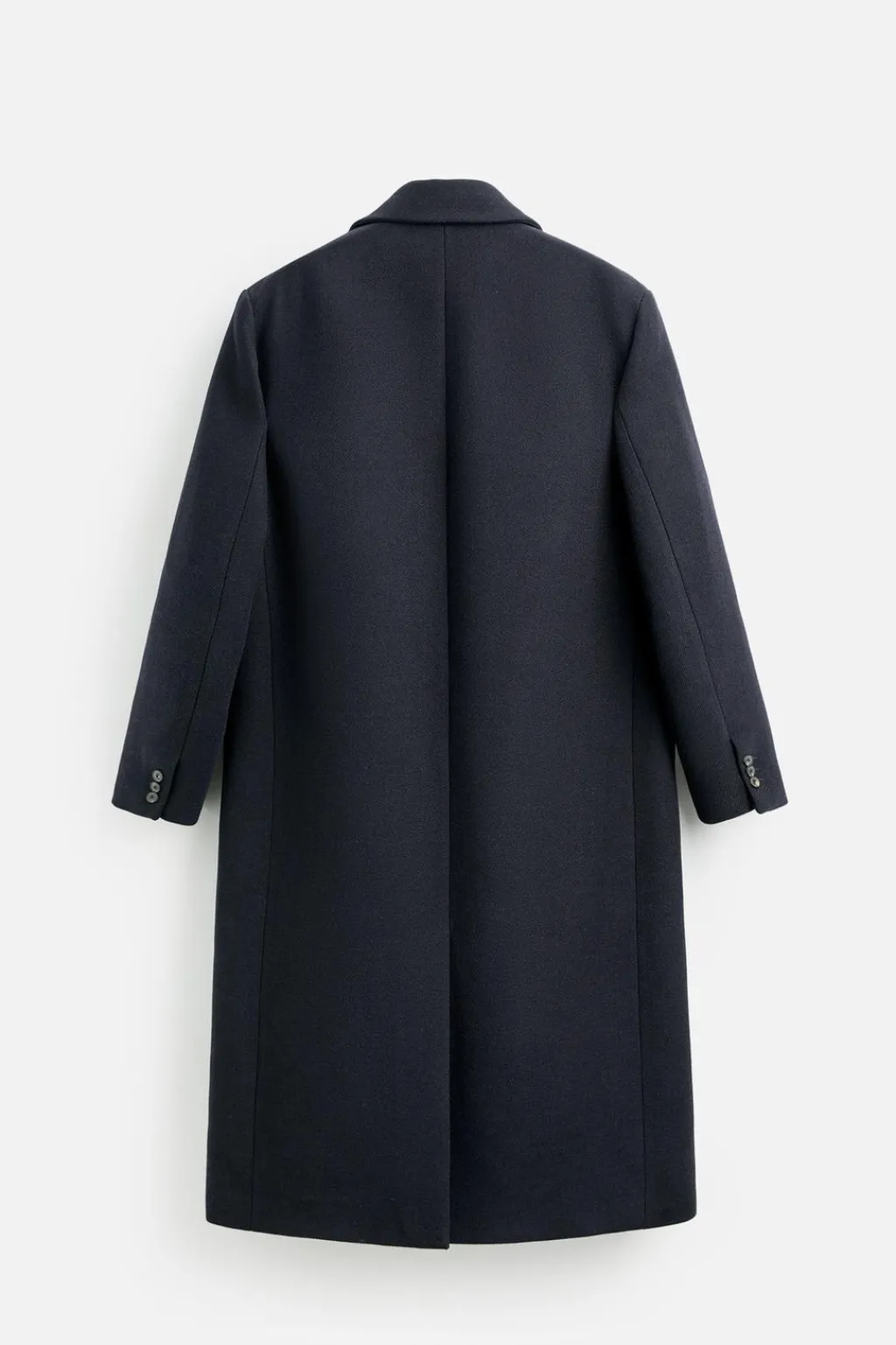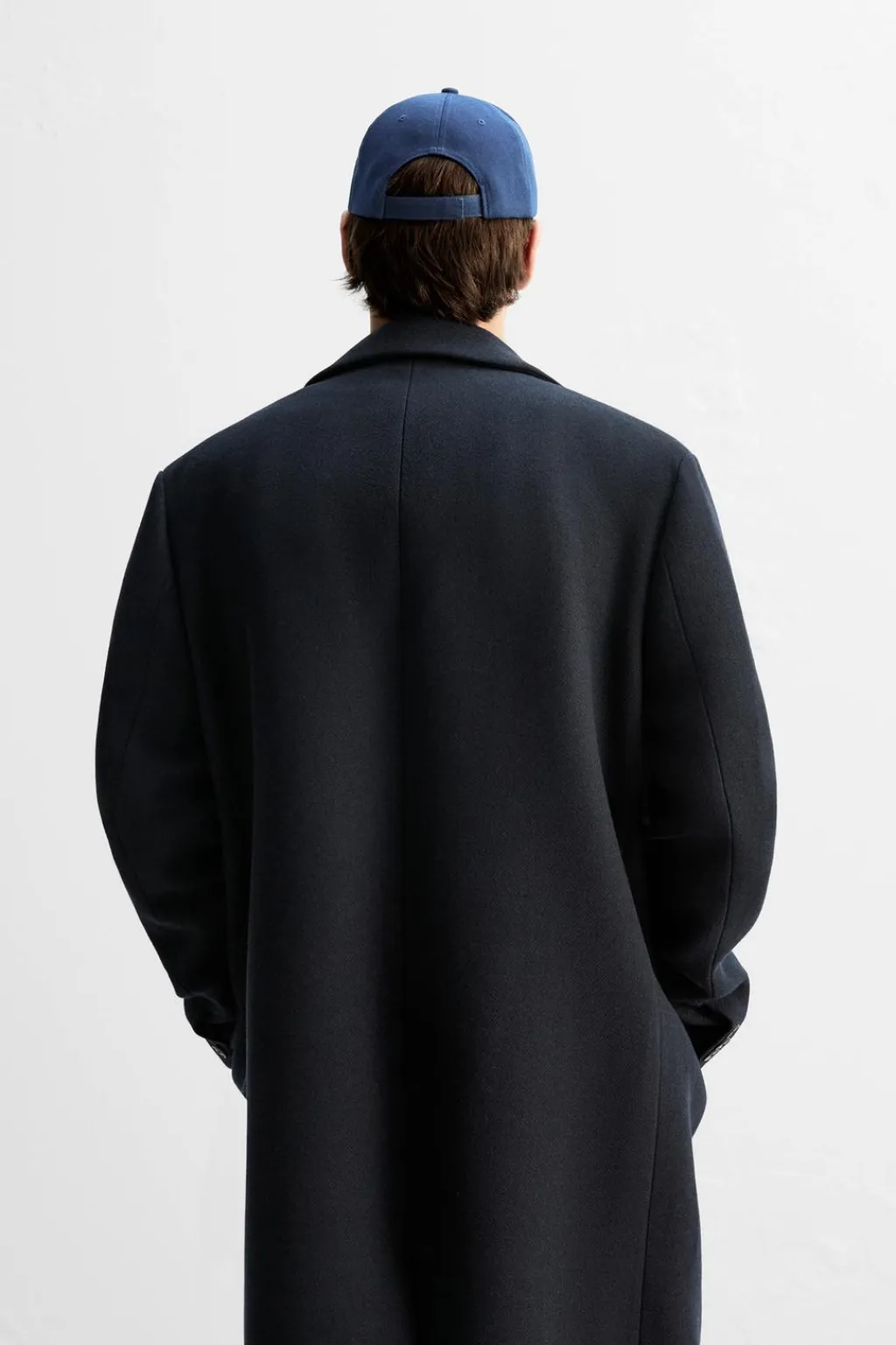 Abrigo oversized fitconfeccionado en tejido con lana. Cuello con solapas de muesca y manga larga acabada en puño con botones. Bolsillos de solapa en cadera y detalle de bolsillo interior. Bajo con abertura en centro espalda. Cierre frontal de botonadura.