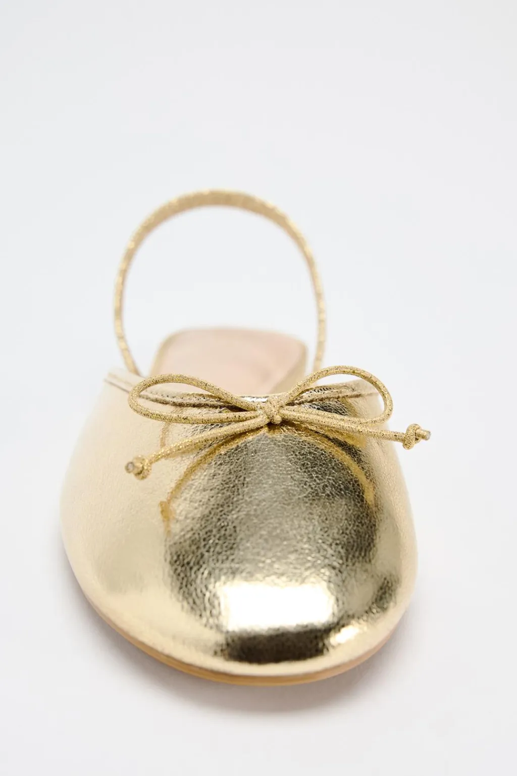 Zapato plano tipo bailarina destalonada efecto metalizado. Detalle de lazo en la parte delantera. Tira trasera. Acabado en punta redonda.