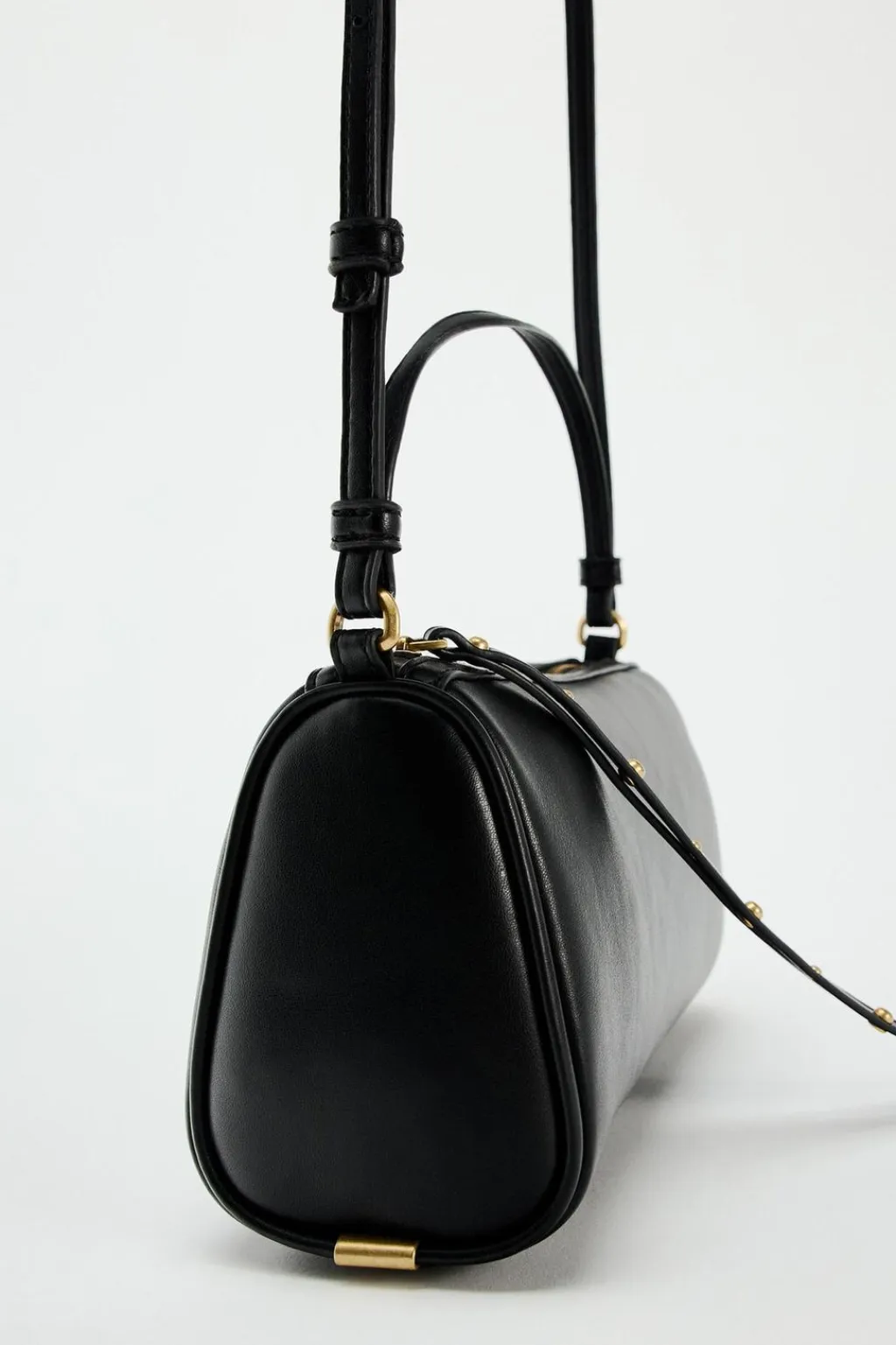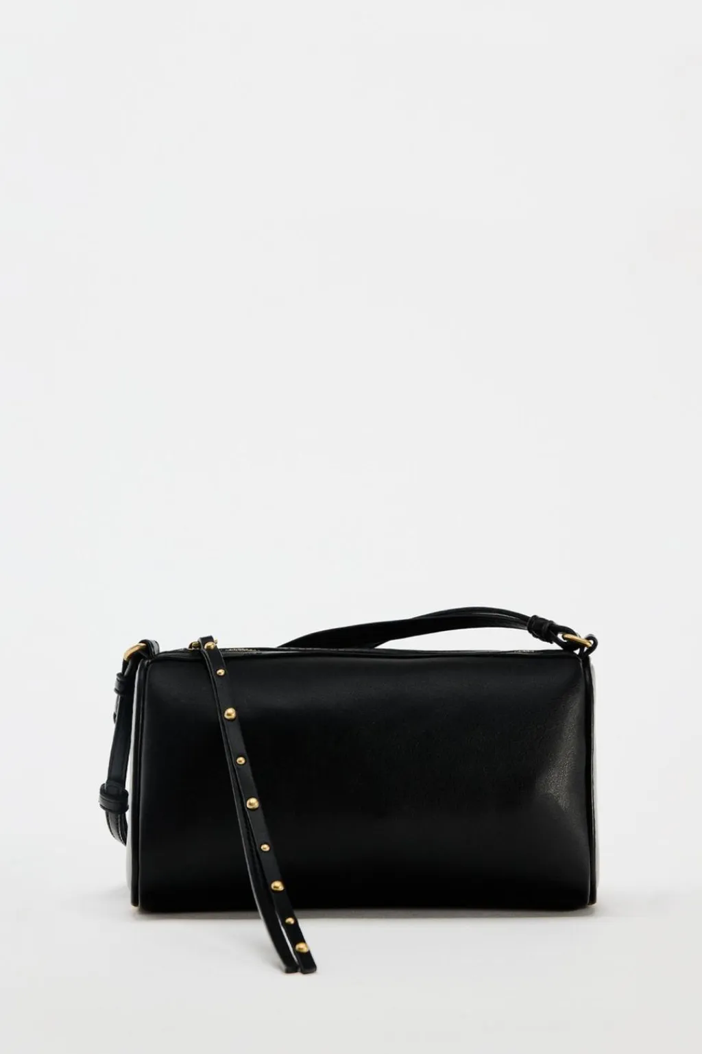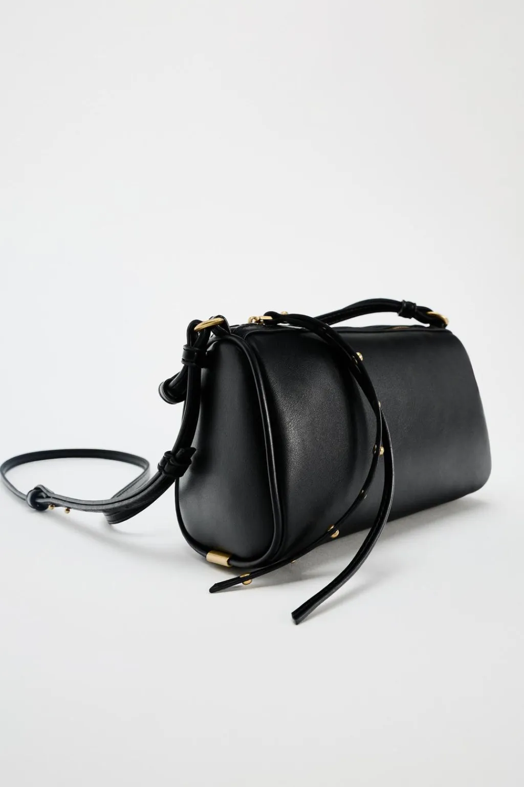 Bolso formato bandolera. Detalle de tachas en el tirador. Asa función bandolera ajustable. Cierre mediante cremallera.