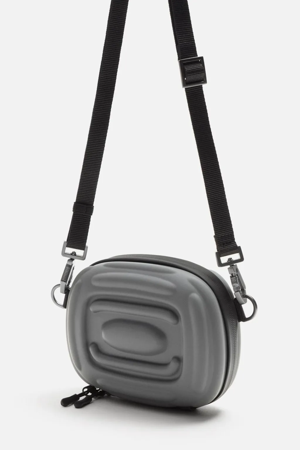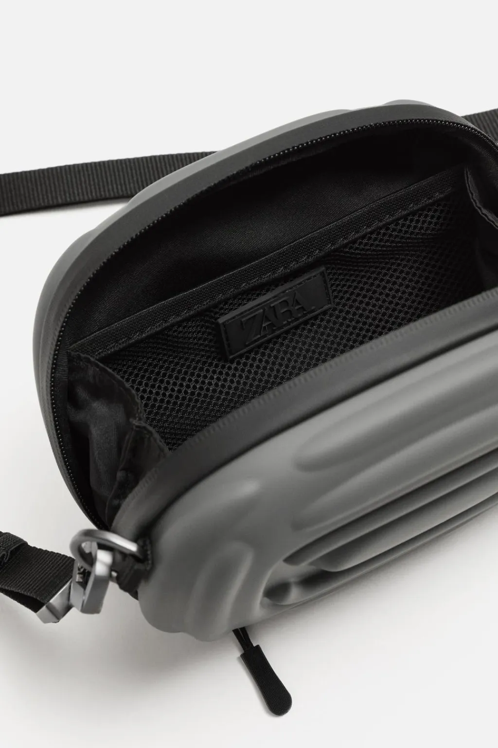 Bandolera rígida. Compartimento principal con cierre mediante cremallera escondida y en su interior tiene un bolsillo de rejilla. Dispone de un asa de hombro ajustable y extraíble.