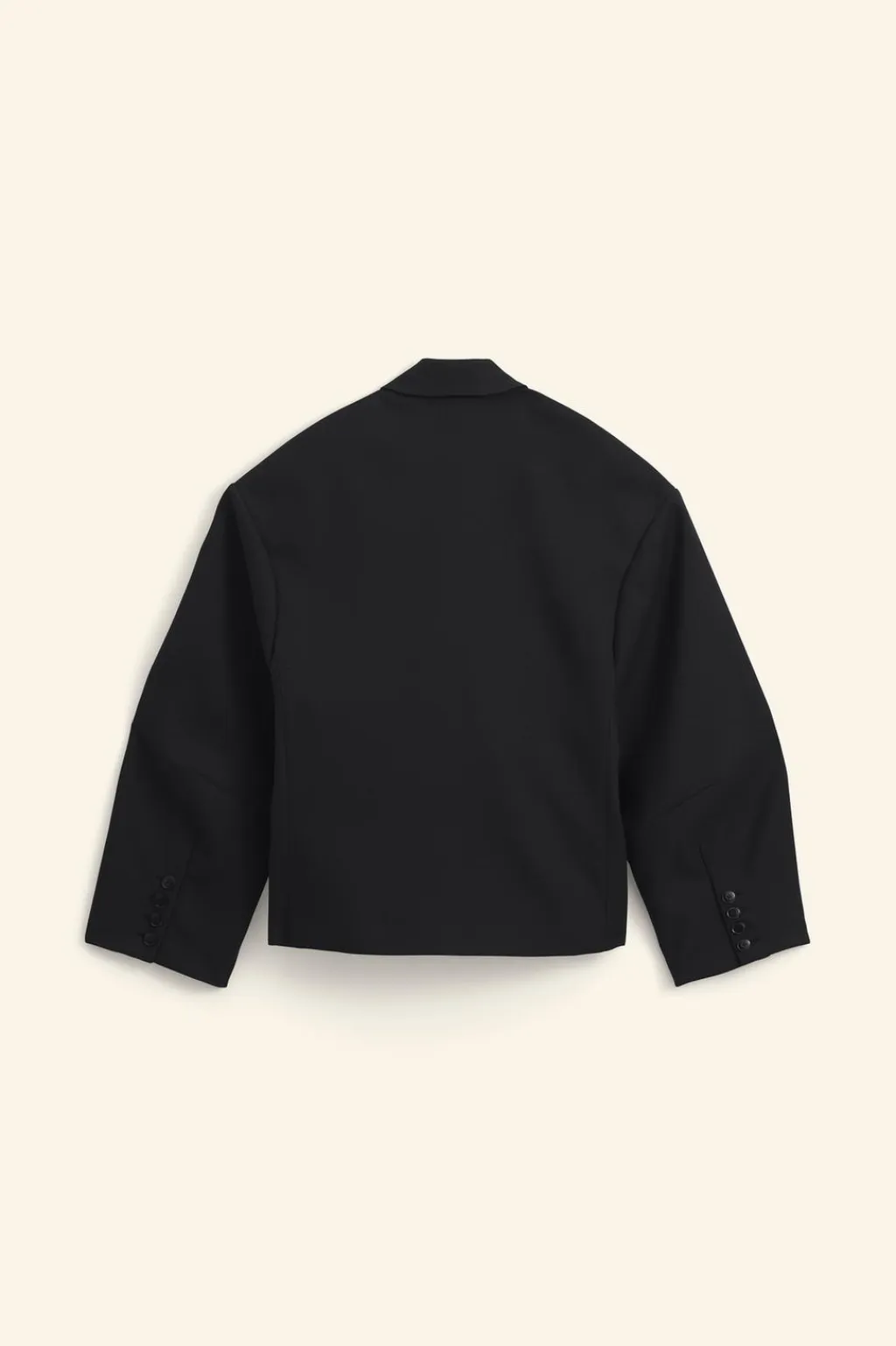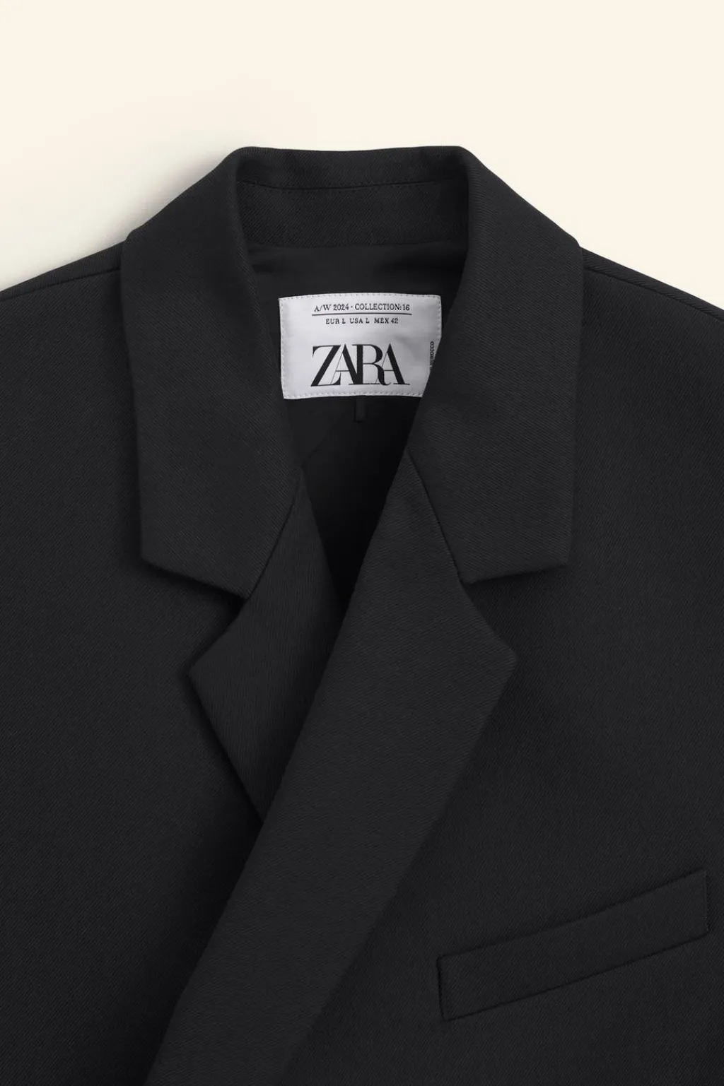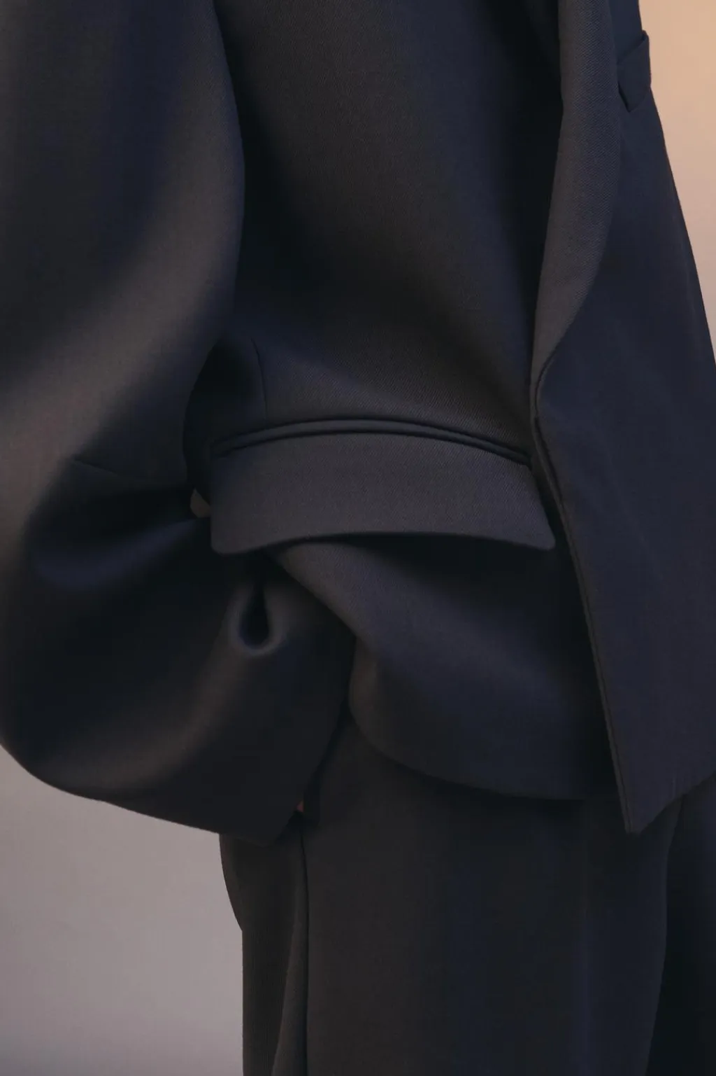 Blazer boxy fit confeccionado en tejido con elasticidad. Cuello con solapas de muesca. Manga larga acabada en puño con detalle de botones. Bolsillo de vivo en pecho y de solapa en cadera. Cierre frontal de botonadura cruzada oculta.
