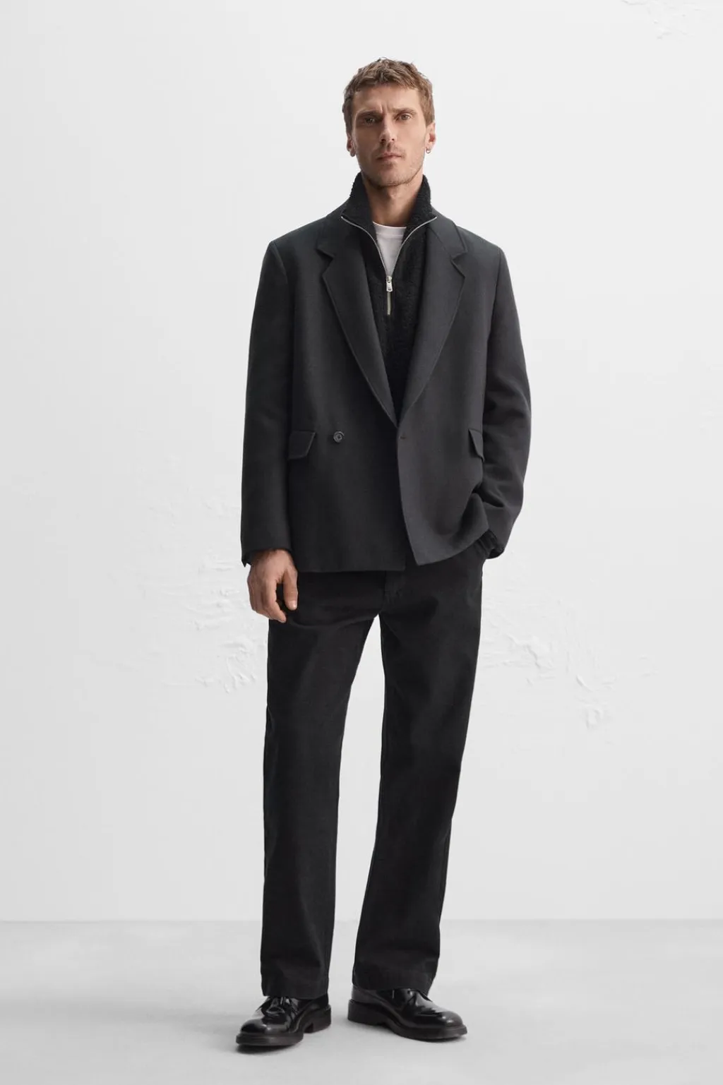 Blazer relaxed fit confeccionada en tejido con viscosa. Cuello con solapas de pico y manga larga. Bolsillos de solapa en cadera y detalle de bolsillo interior. Cierre frontal de botonadura cruzada.