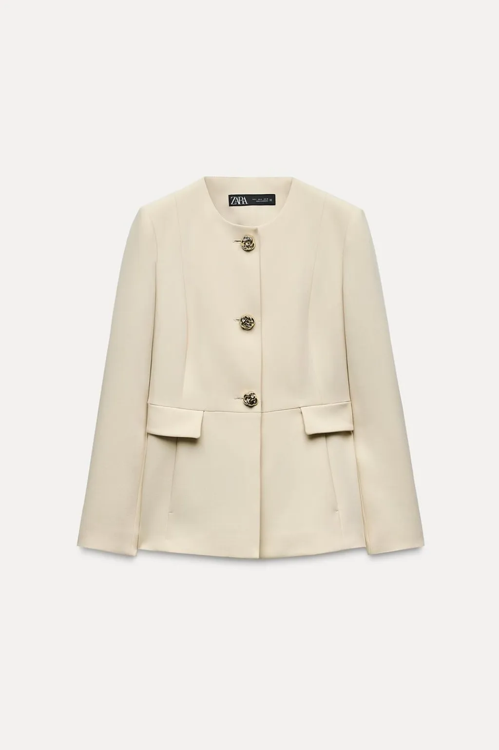 Blazer de cuello redondo y manga larga con hombros marcados. Detalle de tapetas delanteras y bolsillos. Cierre frontal con botones dorados con relieve.