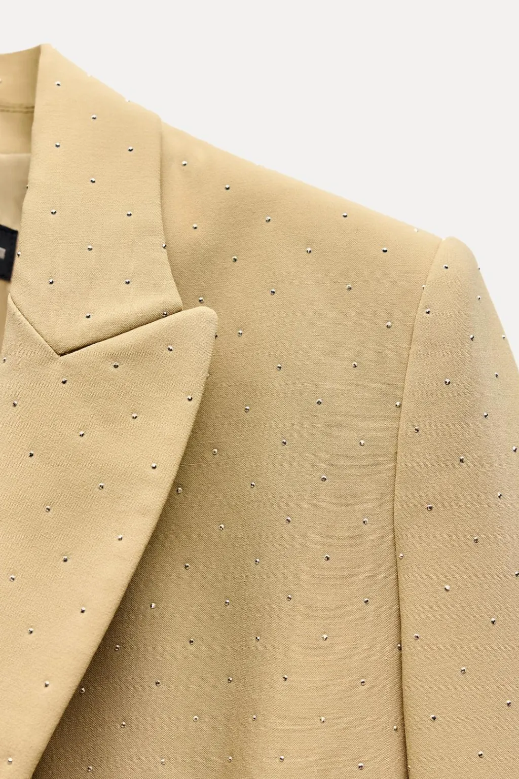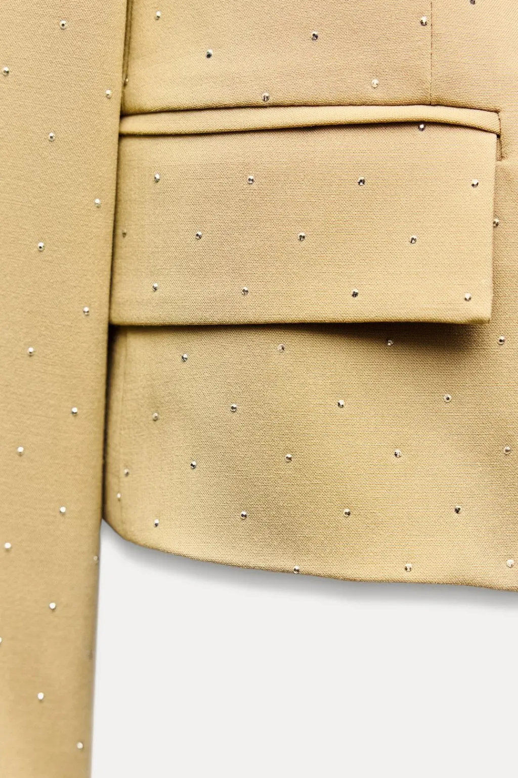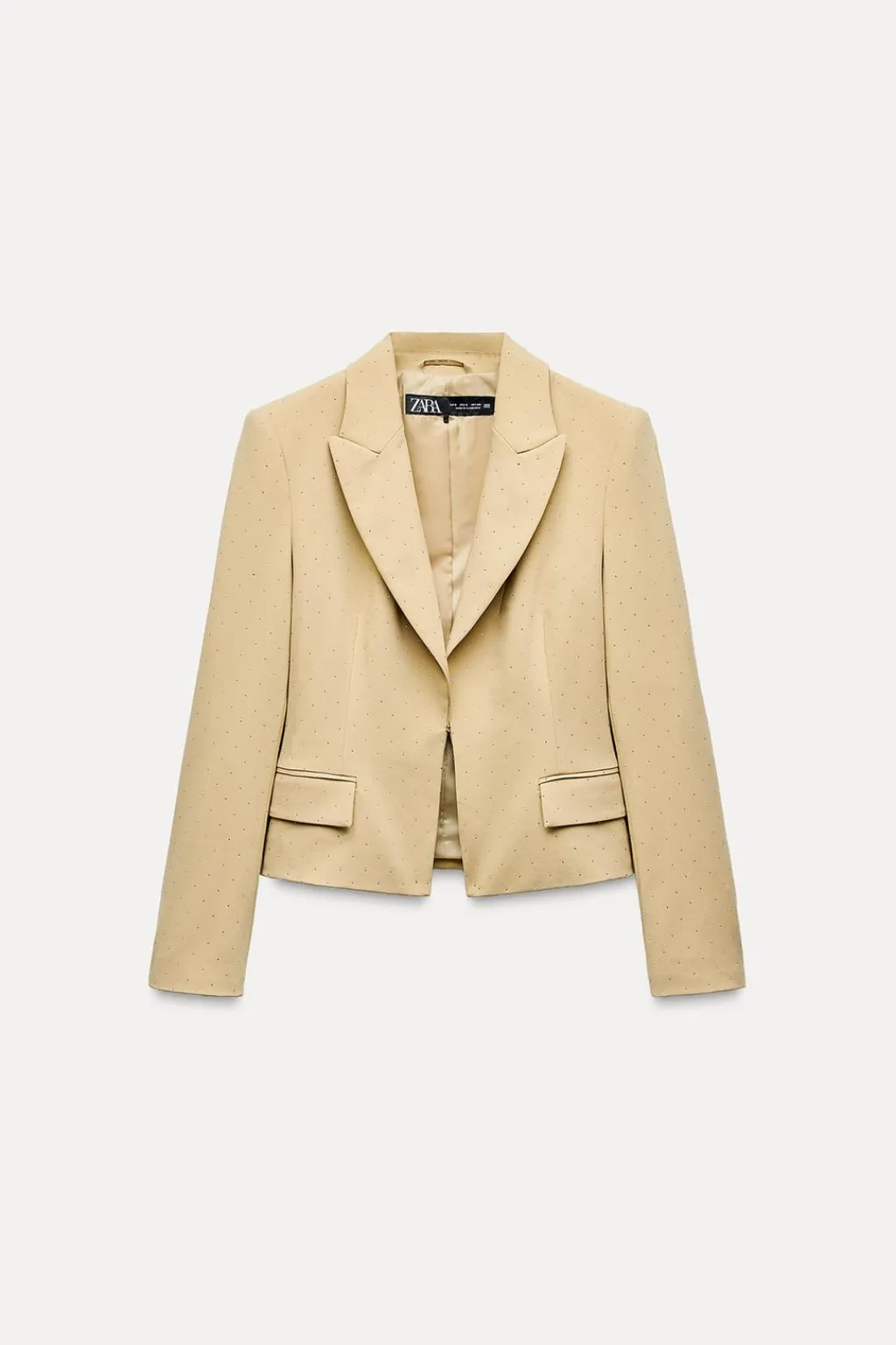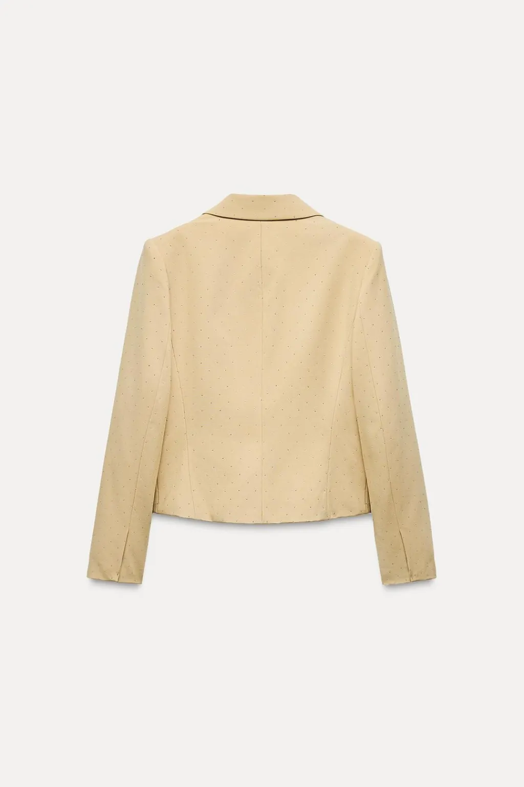 Blazer de cuello solapa y manga larga con hombreras. Bolsillos delanteros con solapa. Detalle aplicación de abalorios con brillo. Cierre frontal con corchete oculto.