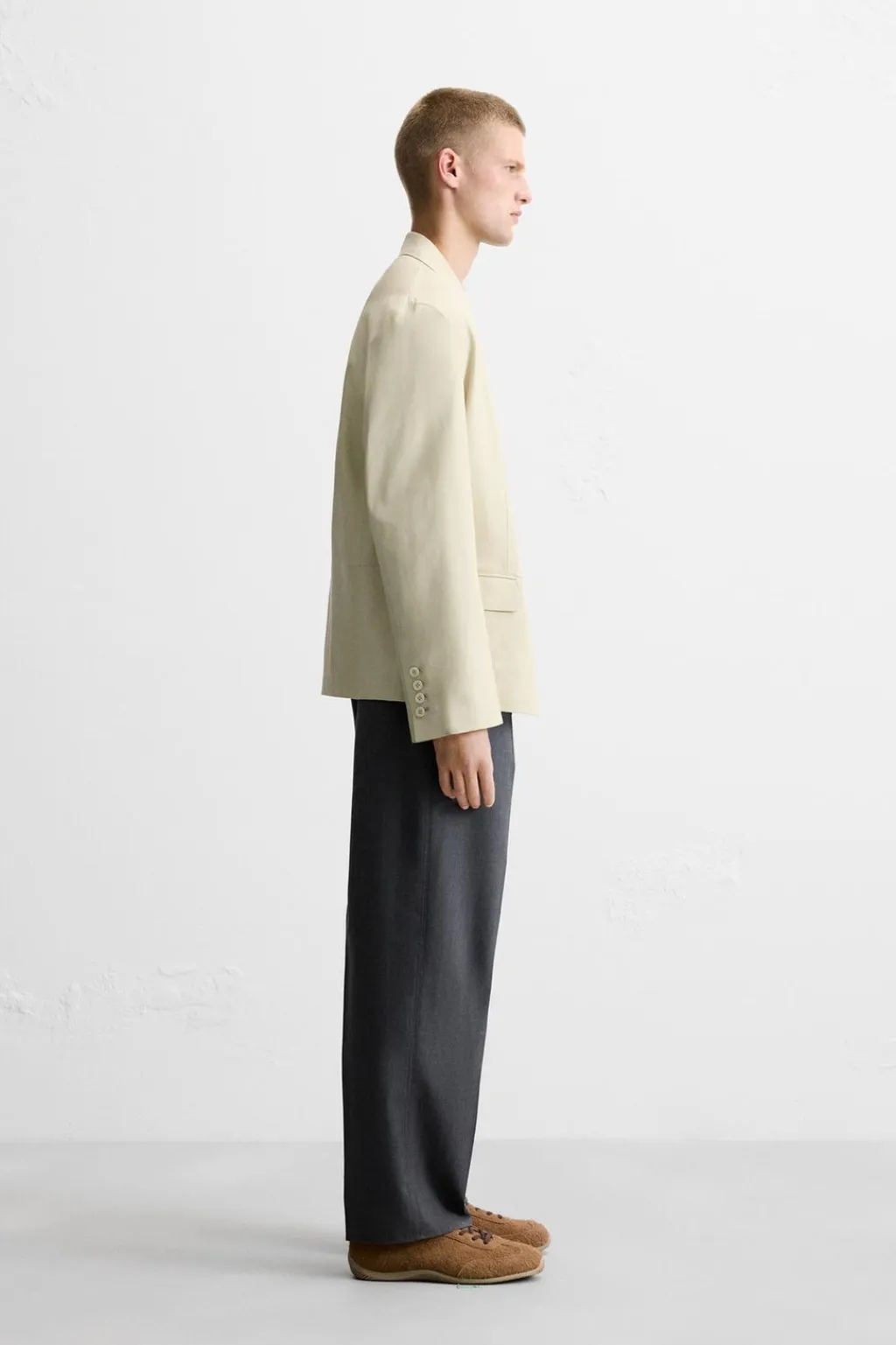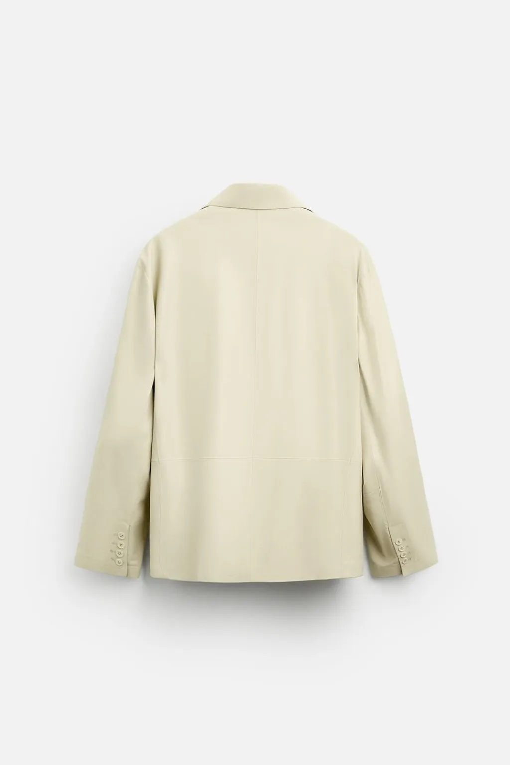 Blazer relaxed fit confeccionada en piel ligera. Cuello con solapas de muesca y manga larga acabda en puño con botones. Bolsillo de vivo en pecho yde solapa en cadera. Cierre frontal de botonadura.