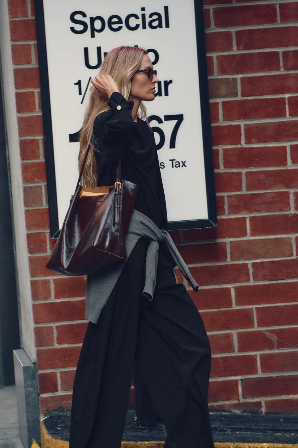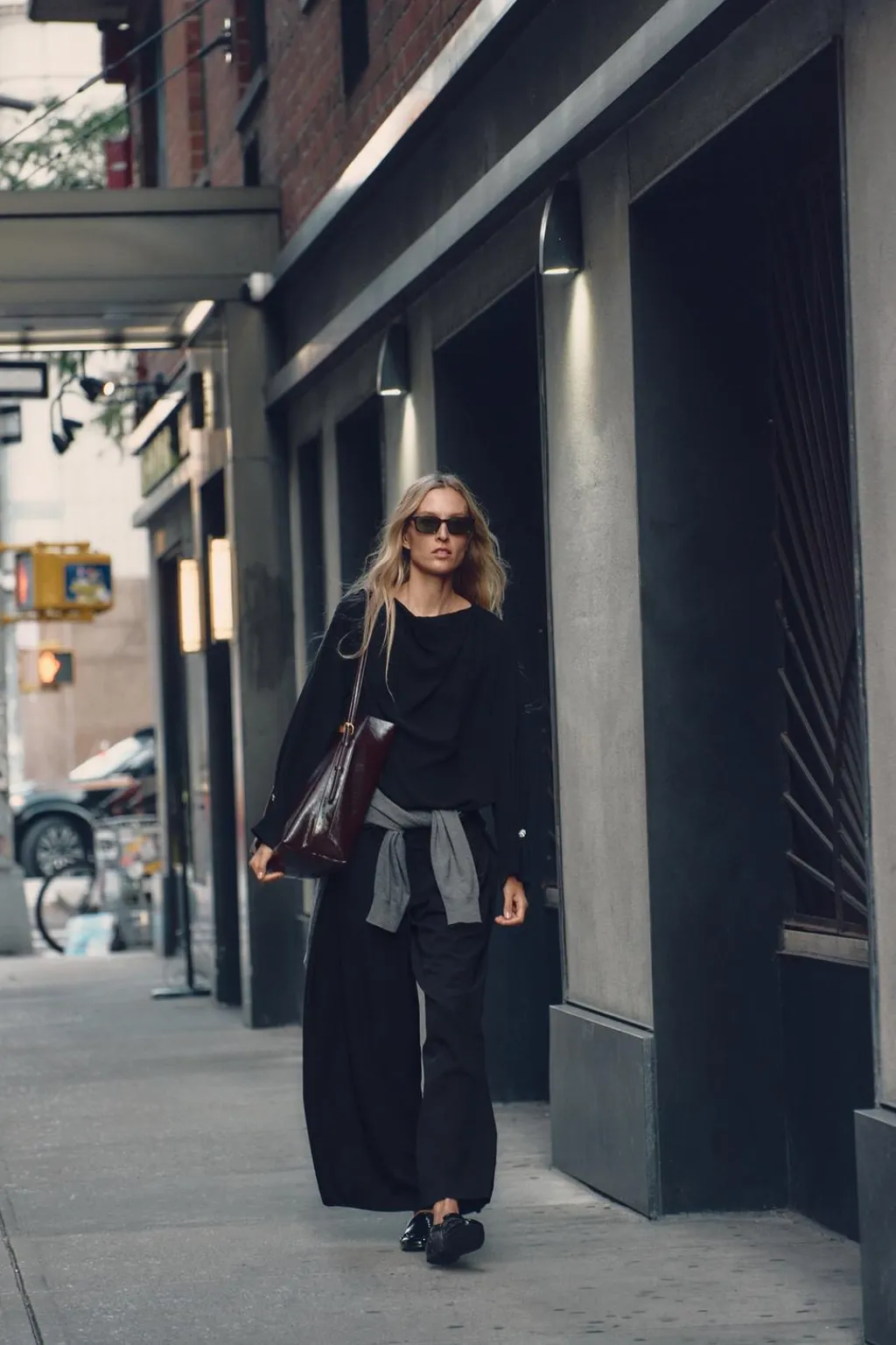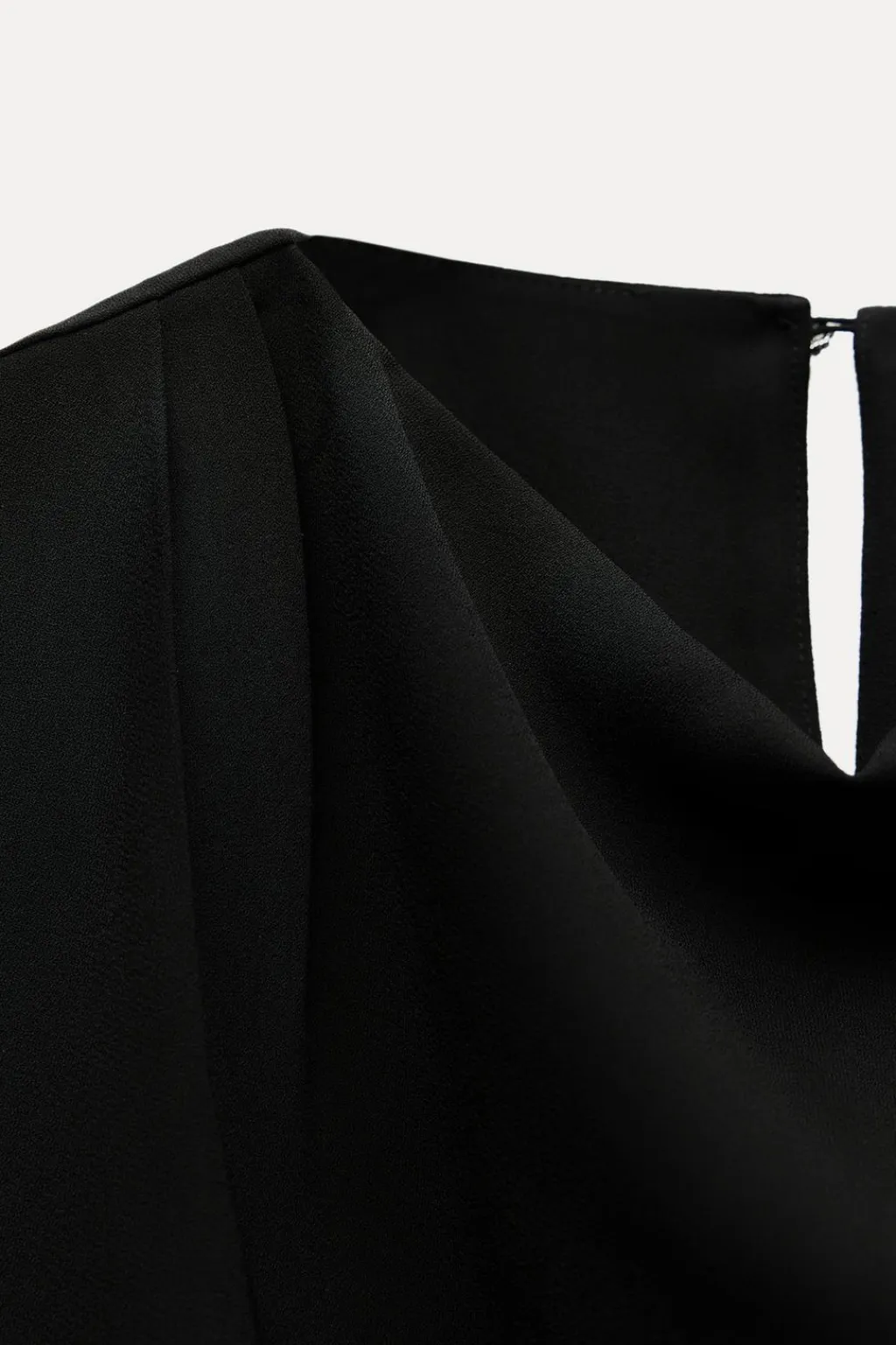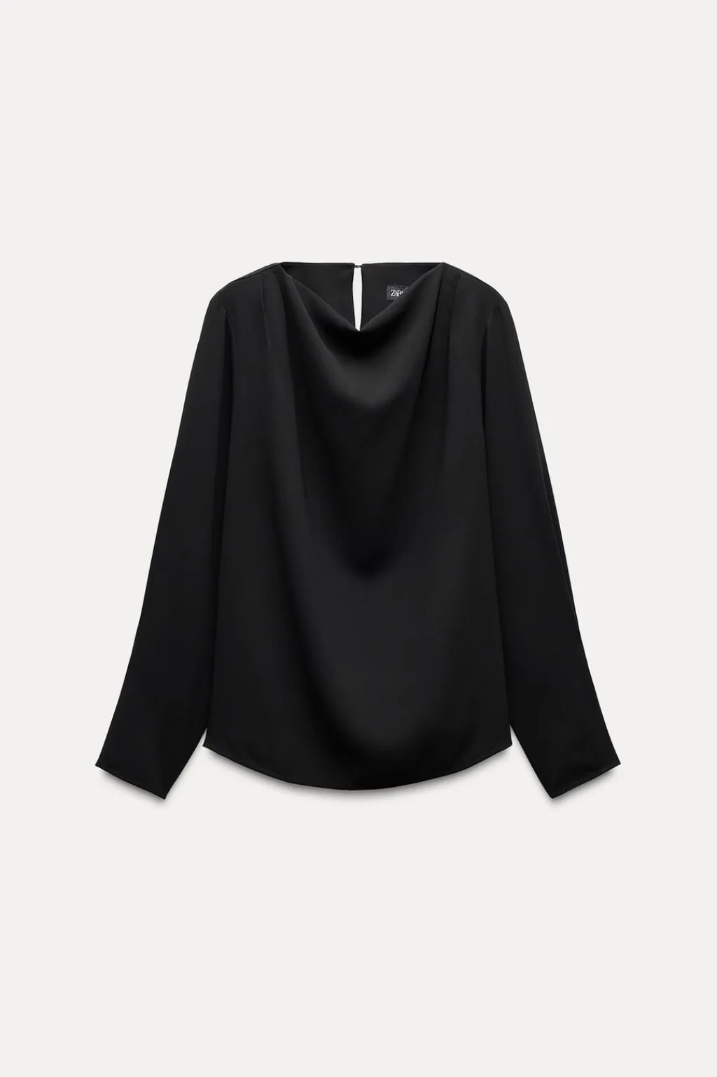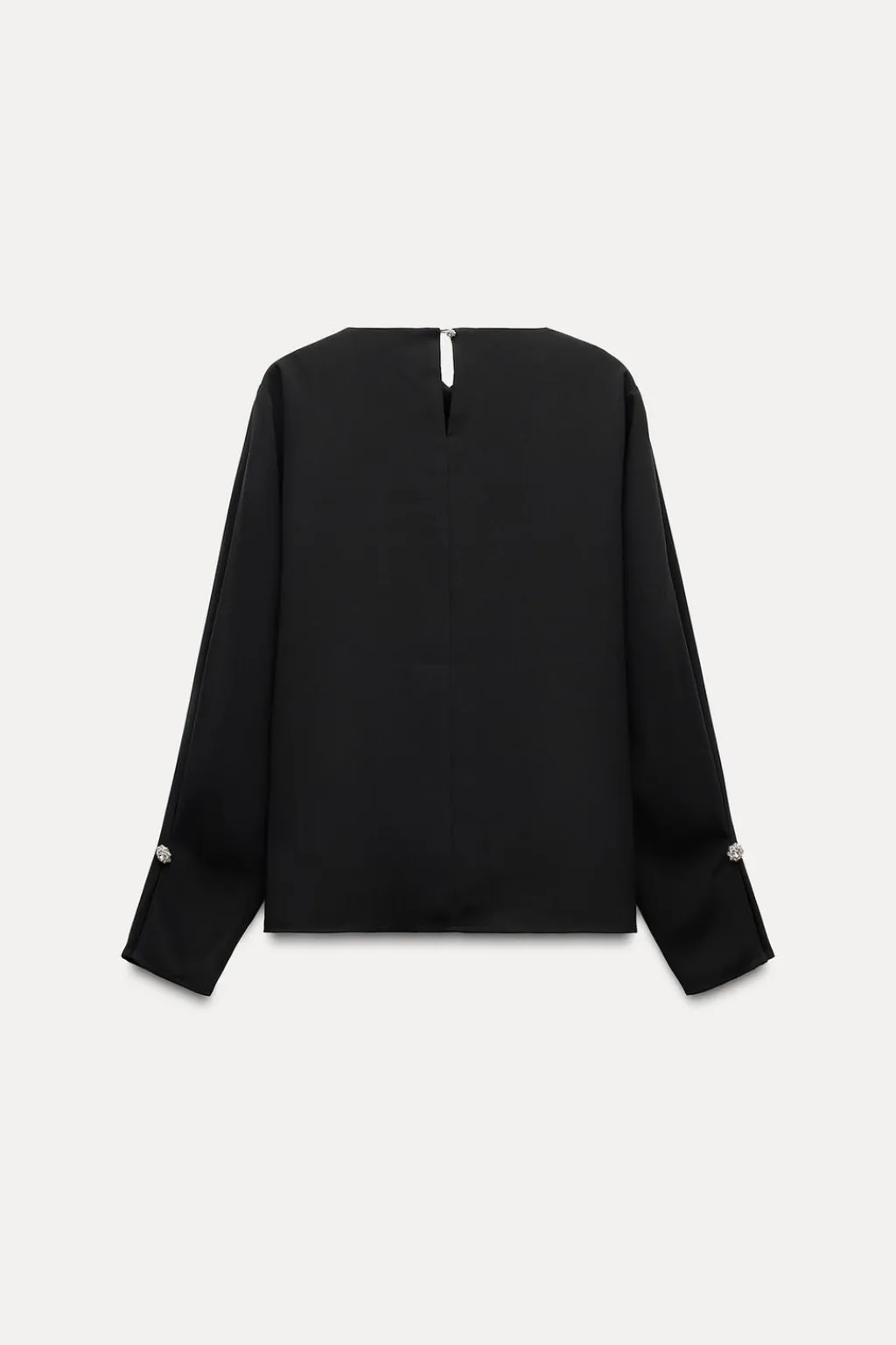 Blusa de cuello fluido y manga larga. Cierre en espalda con abertura y botón. Detalle de acabados con botones joya.