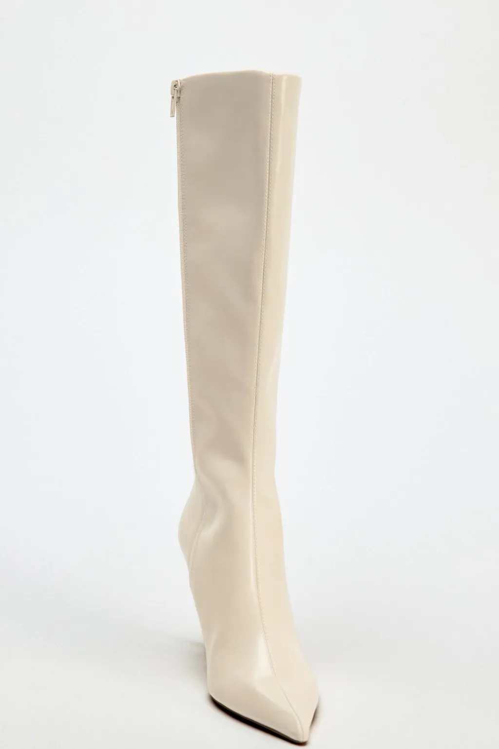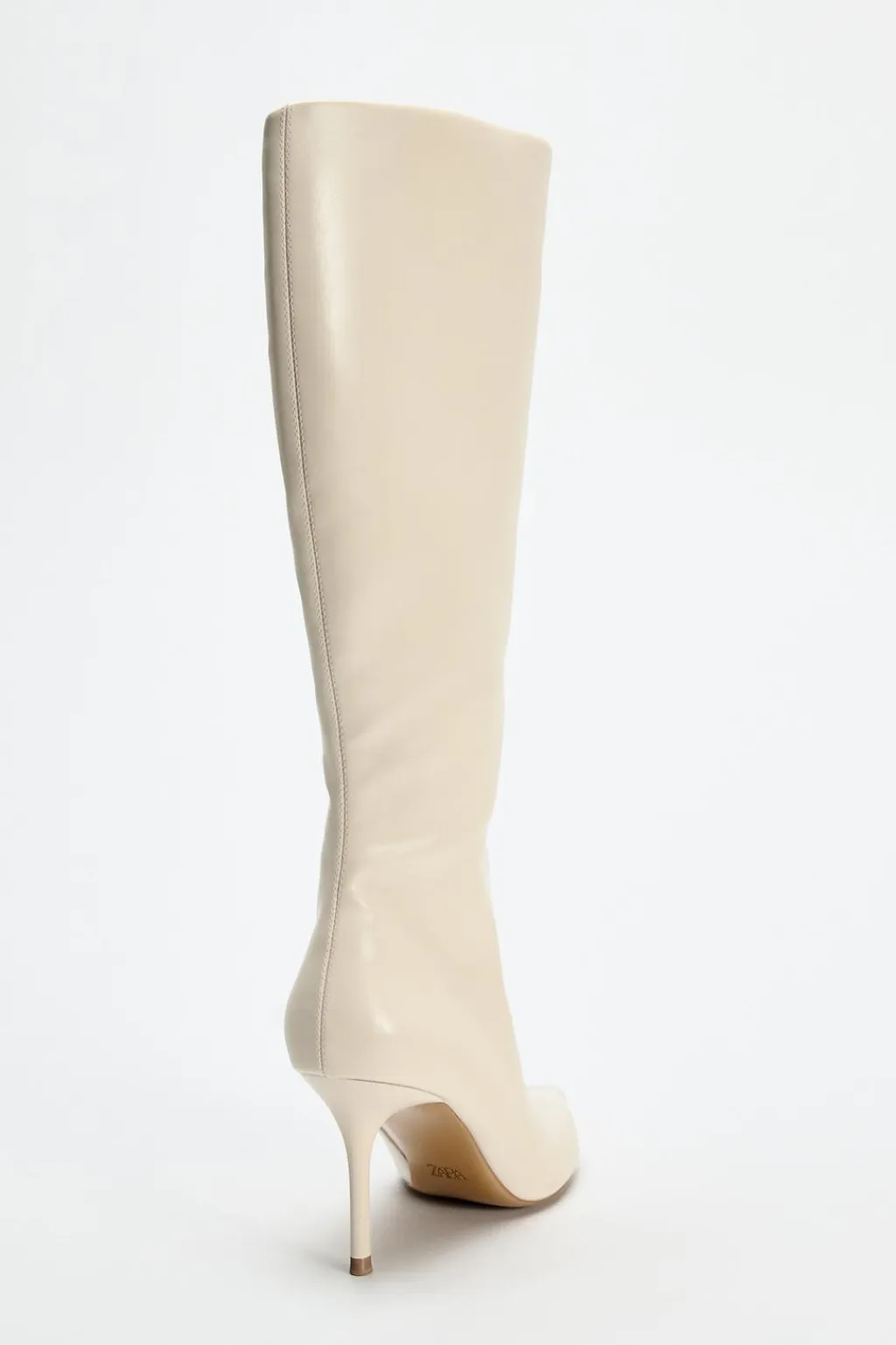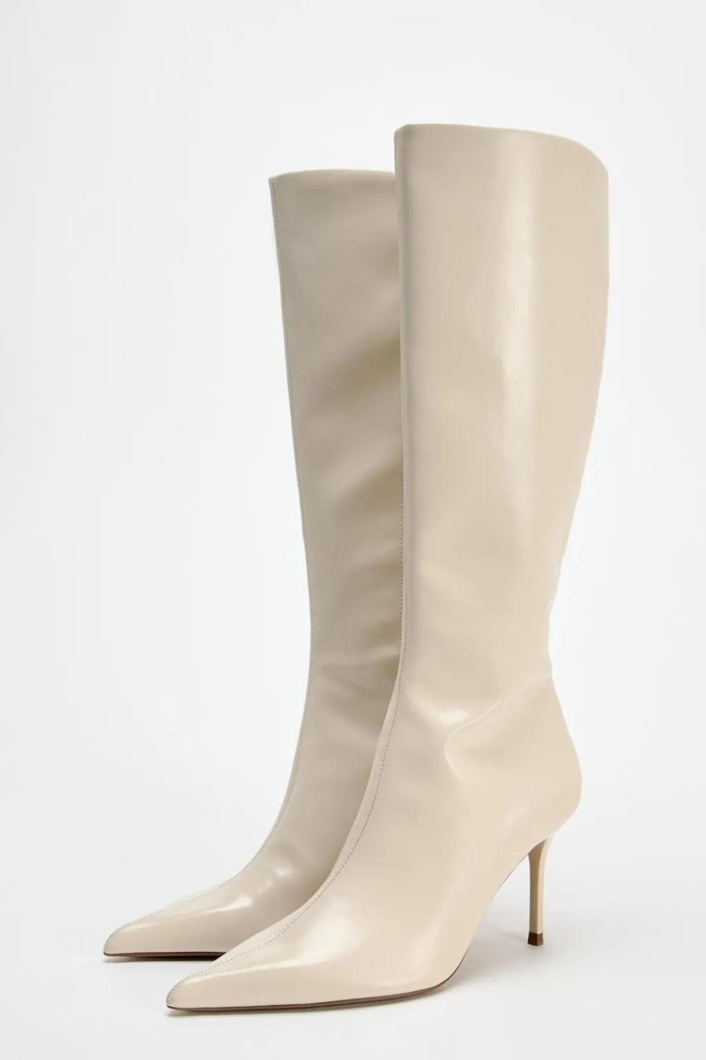 Zapato tipo bota de caña alta. Tacón fino. Cierre mediante cremallera. Acabado en punta.
