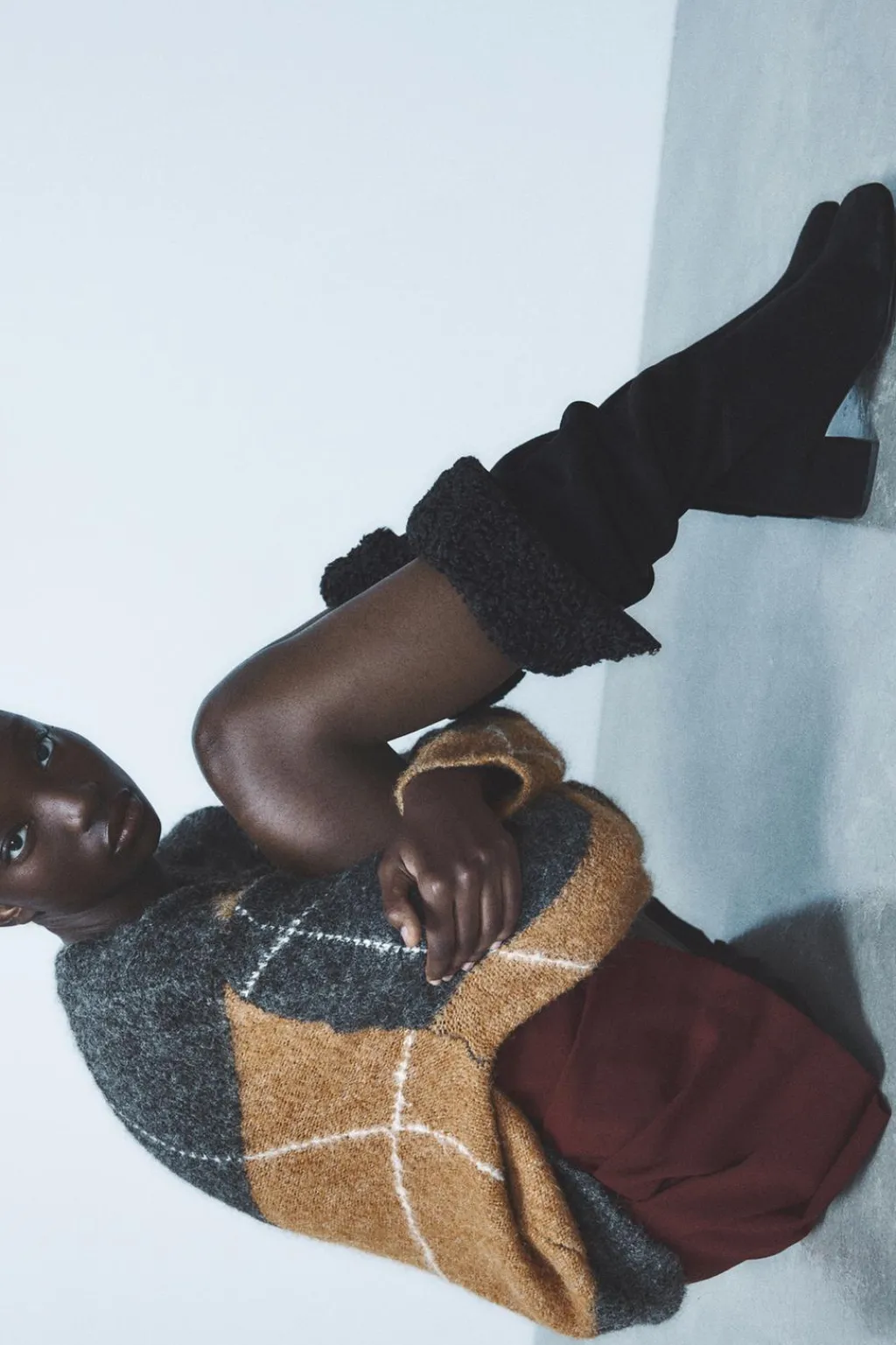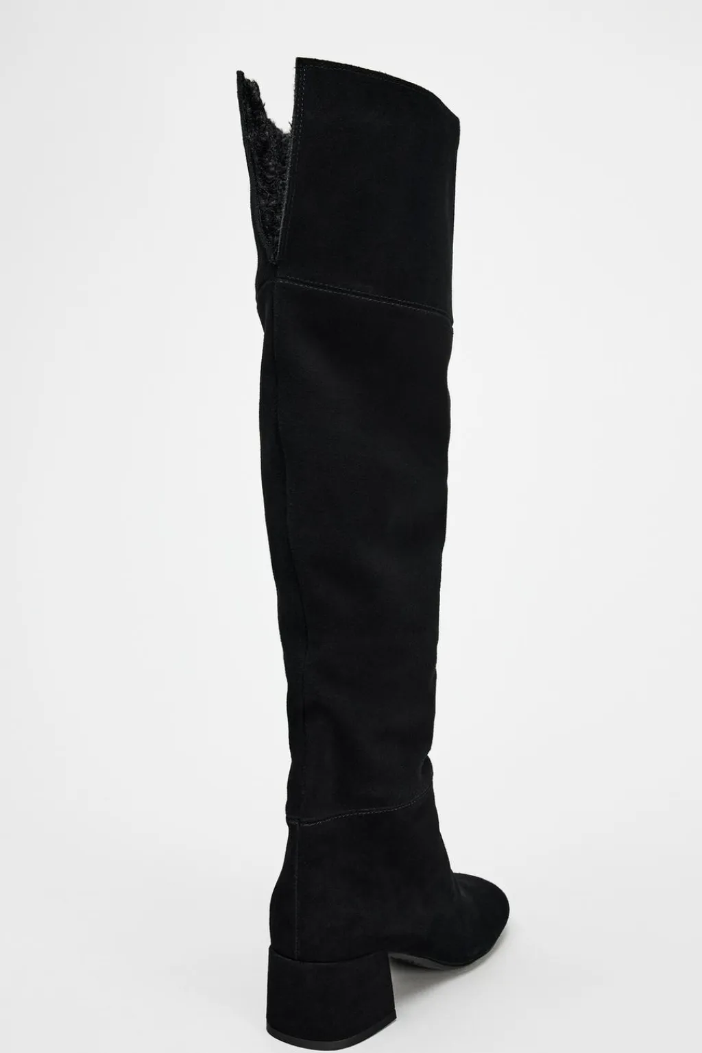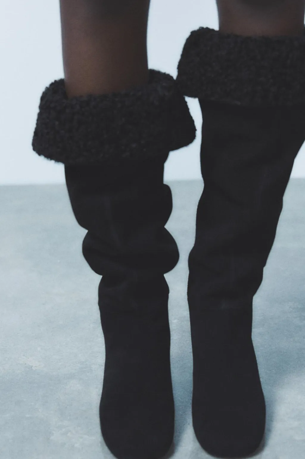 Zapato tipo bota en serraje. Caña alta con detalle de vuelta en efecto borreguito. Acabado en punta redonda.