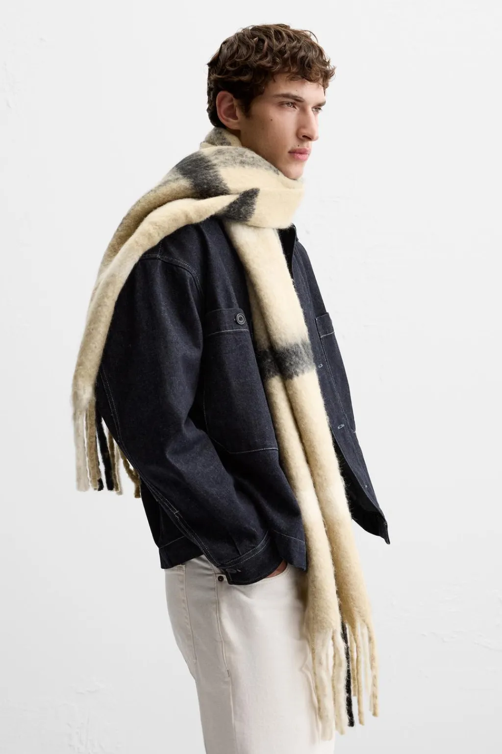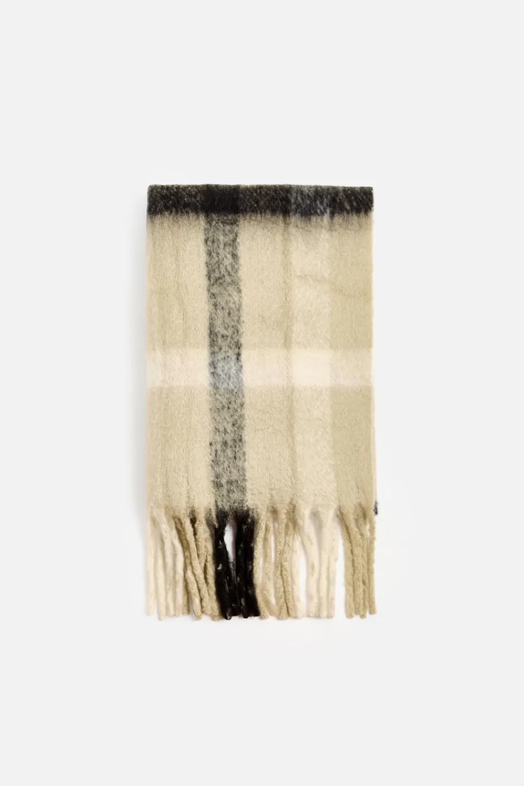 Bufanda confeccionada en tejido con acabado cepillado. Acabado con flecos.