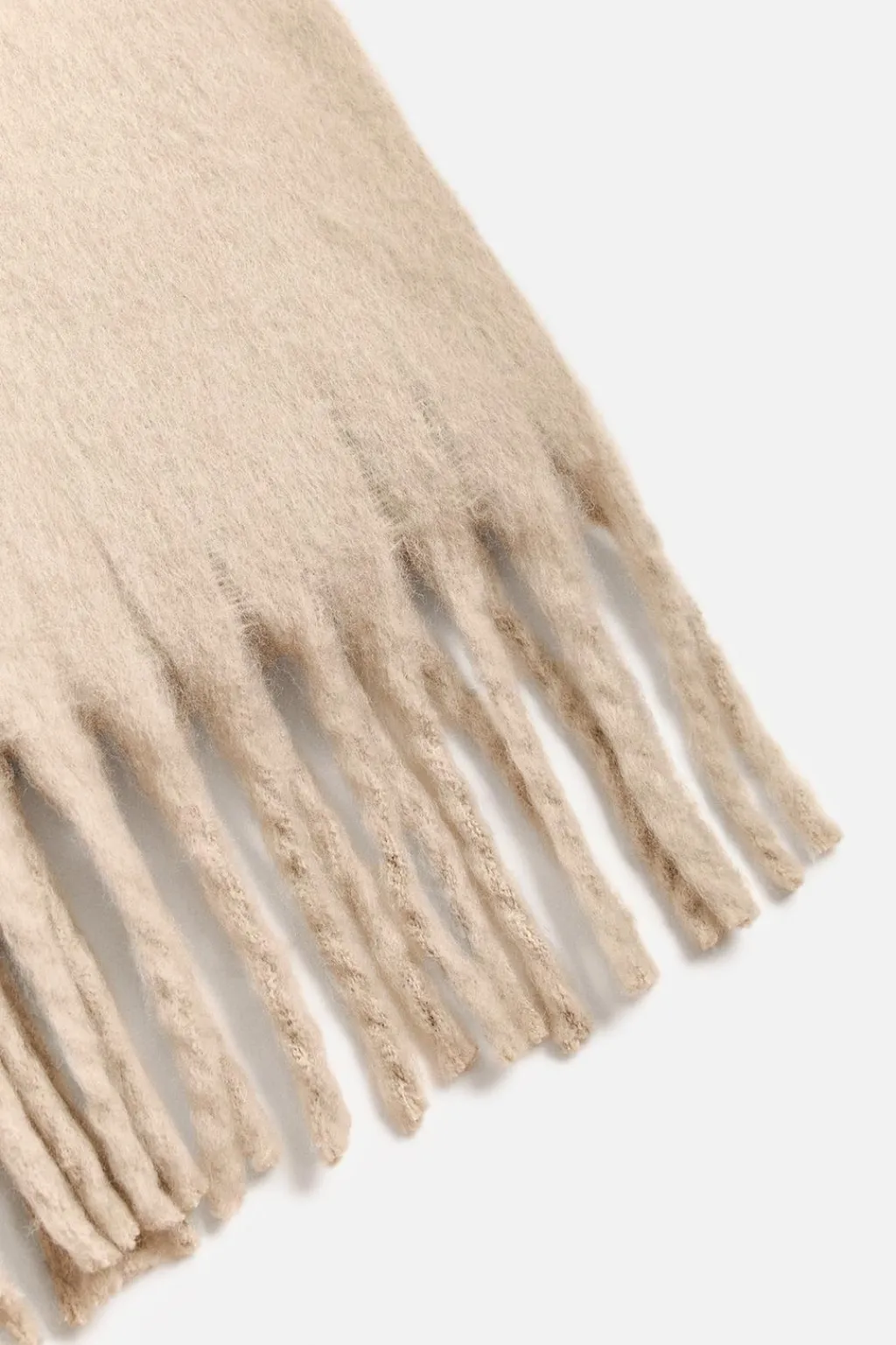 Bufanda tejida en hilatura con acabado cepillado. Acabado con flecos.