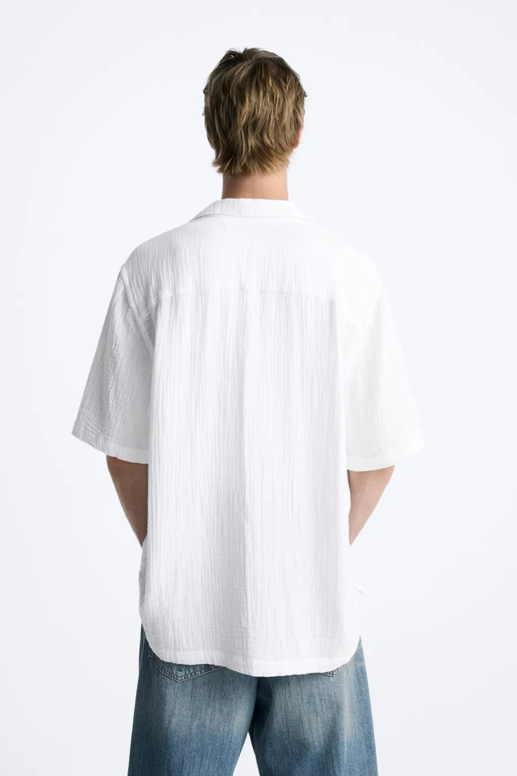 Camisa relaxed fit confeccionada en tejido con efecto arrugado. Cuello bowling y manga corta. Bolsillo plastrón en pecho. Cierre frontal de botonadura.