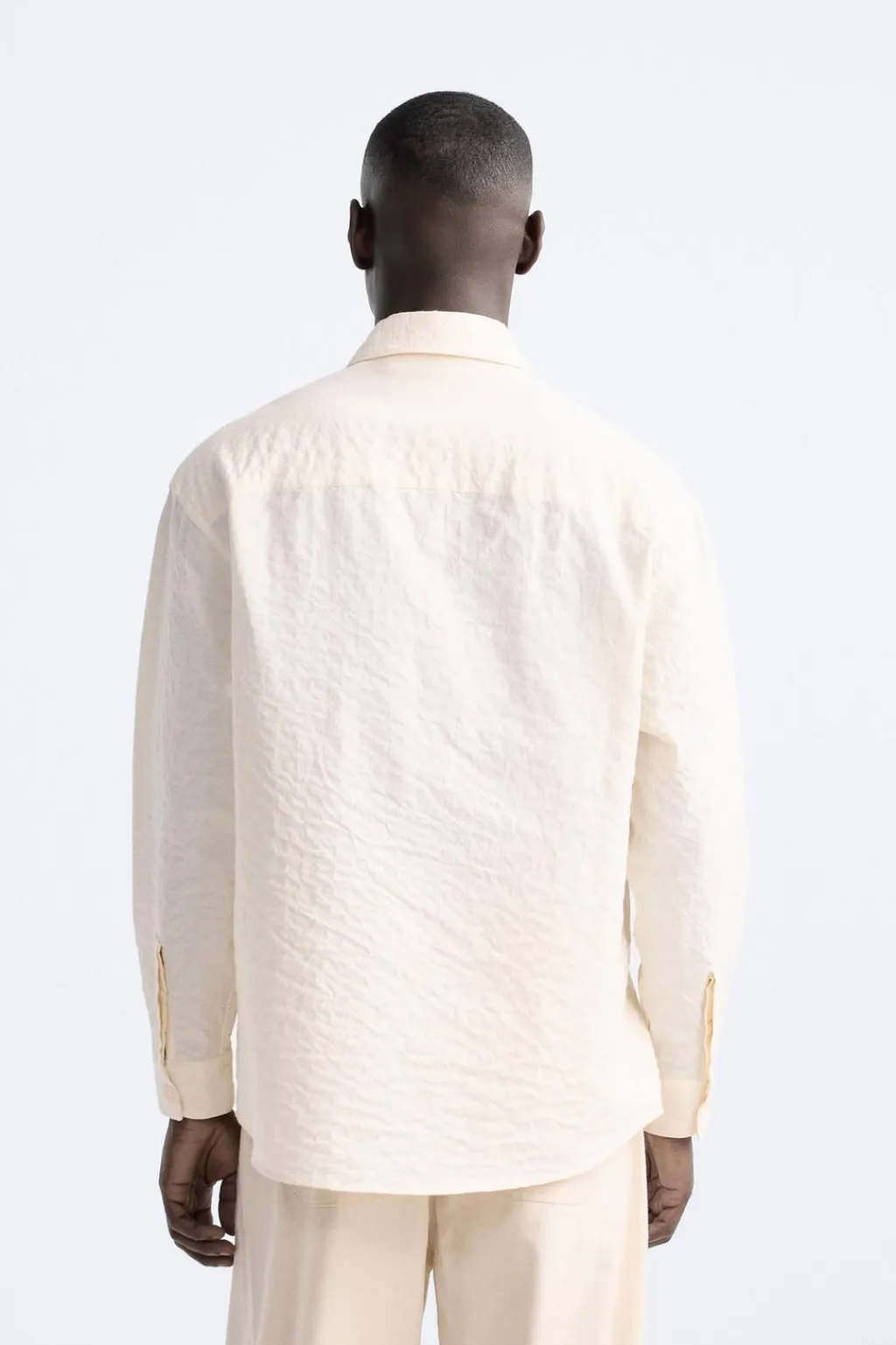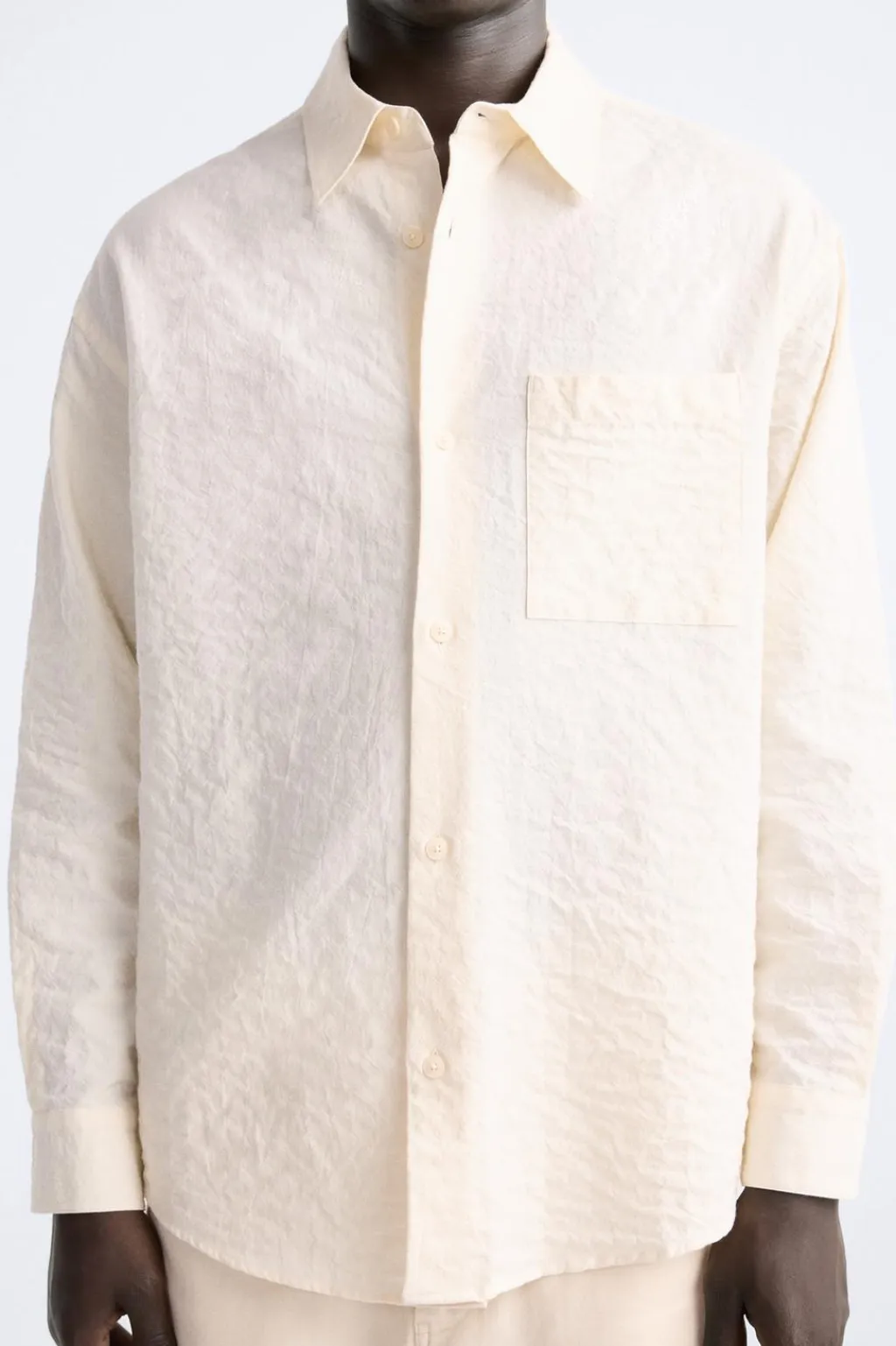 Camisa relaxed fit confeccionada en tejido de algodón con elasticidad. Cuello solapa y manga larga acaba en puño con botón. Bolsillo plastrón en pecho. Efecto arrugado. Cierre frontal de botonadura.