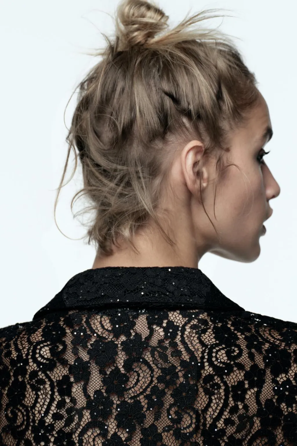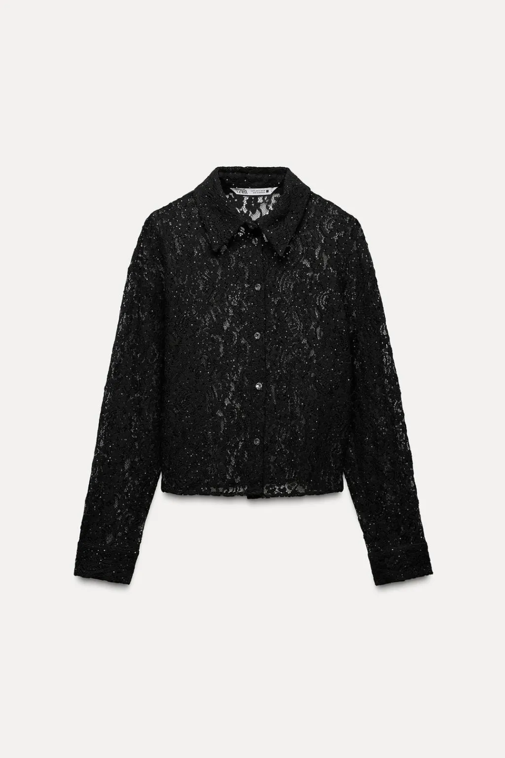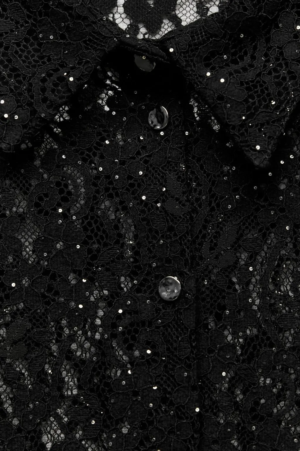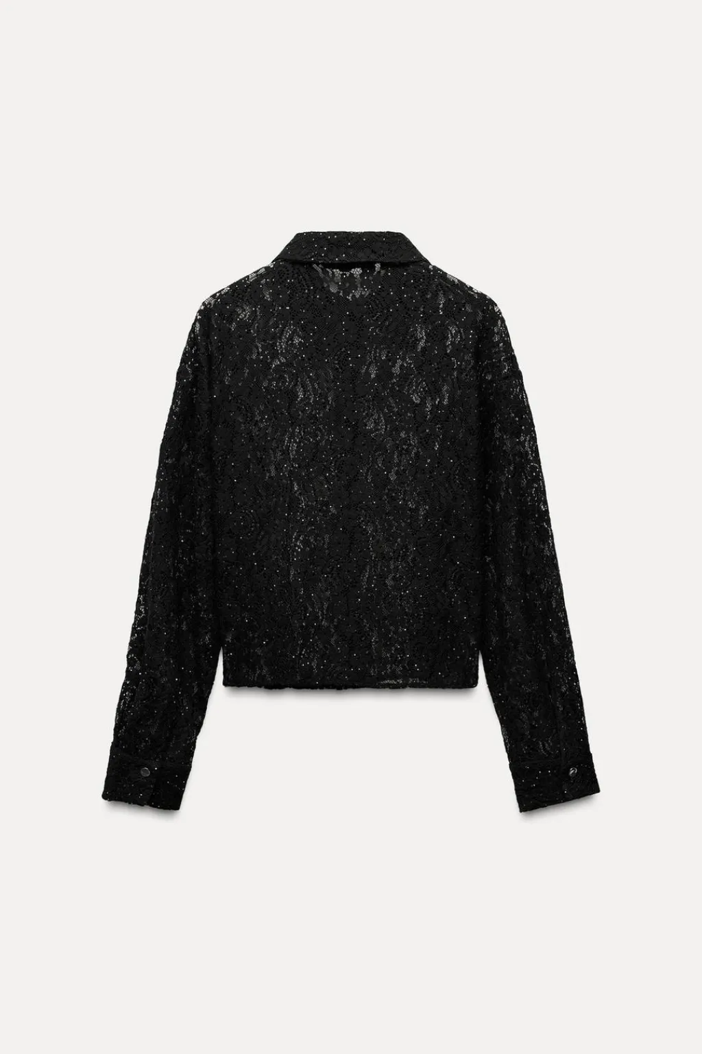 Camisa de cuello solapa y manga larga. Detalle aplicación de lentejuelas. Cierre frontal con botones metálicos.