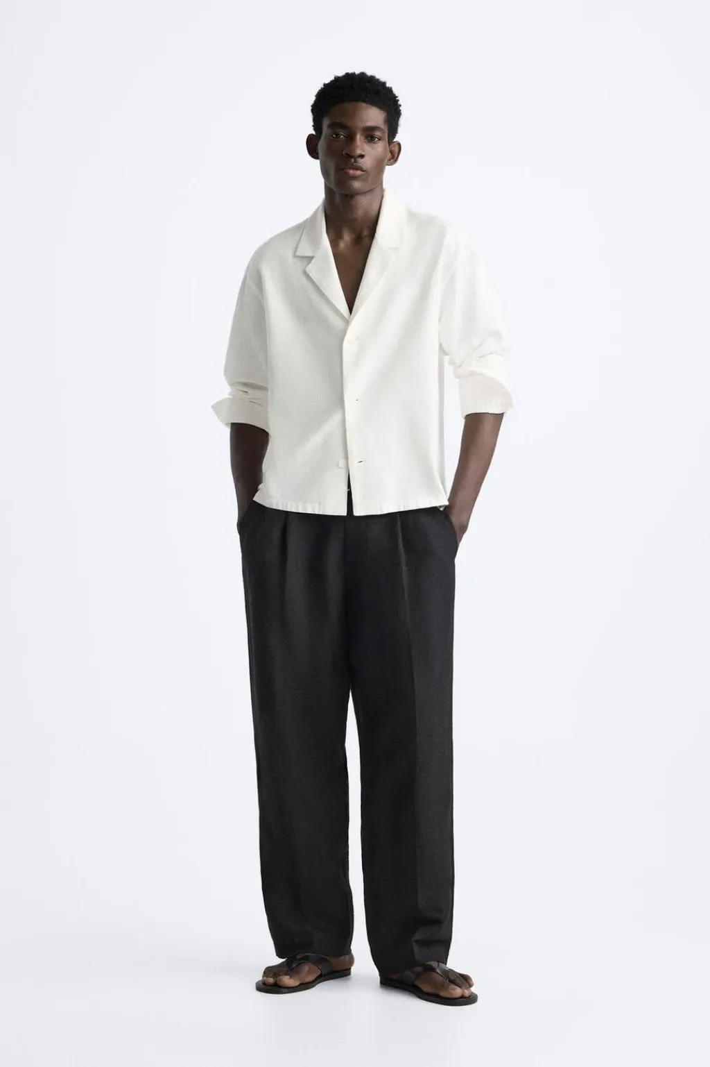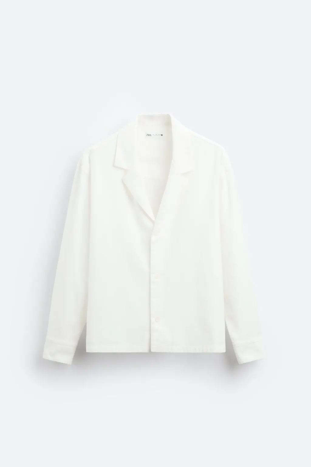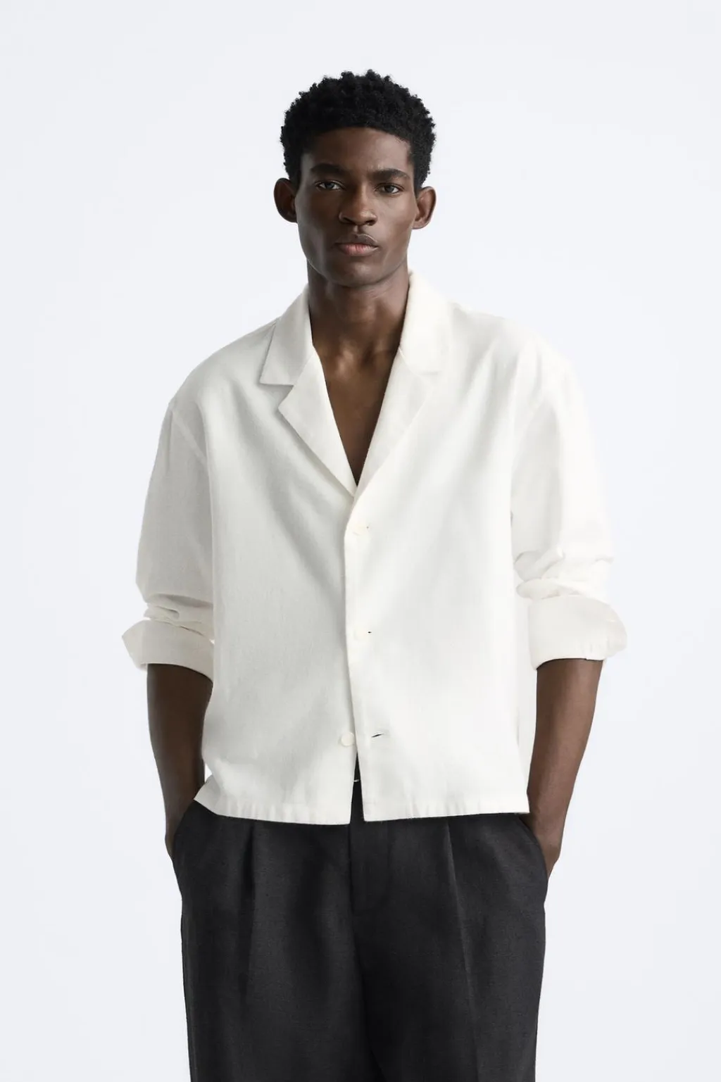 Camisa relaxed fit. Cuello con solapas de muesca y manga larga acabada en puño con botón. Bajo con aberturas laterales. Cierre frontal de botonadura.