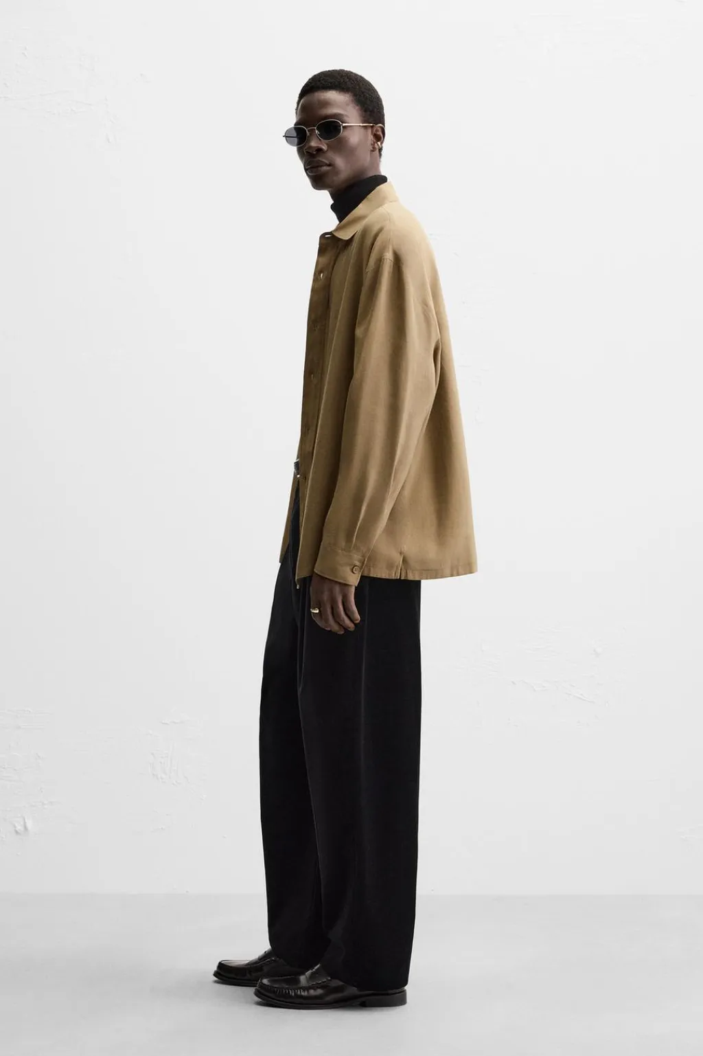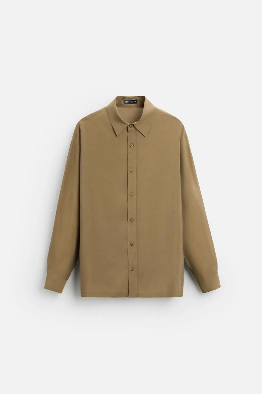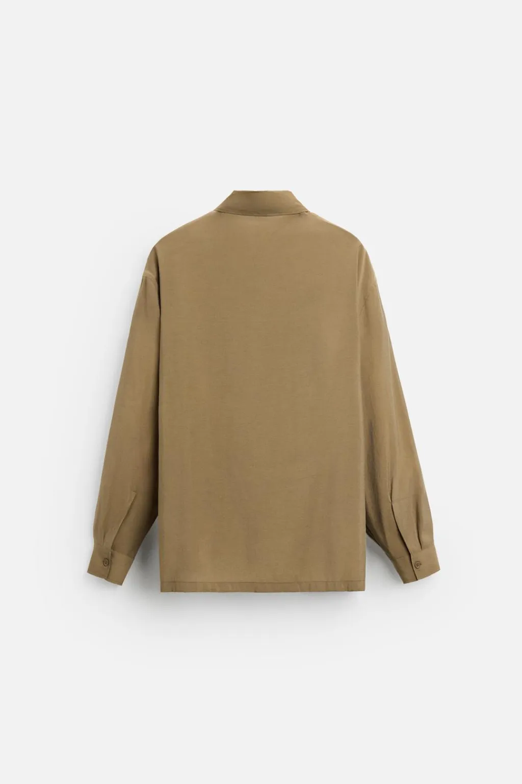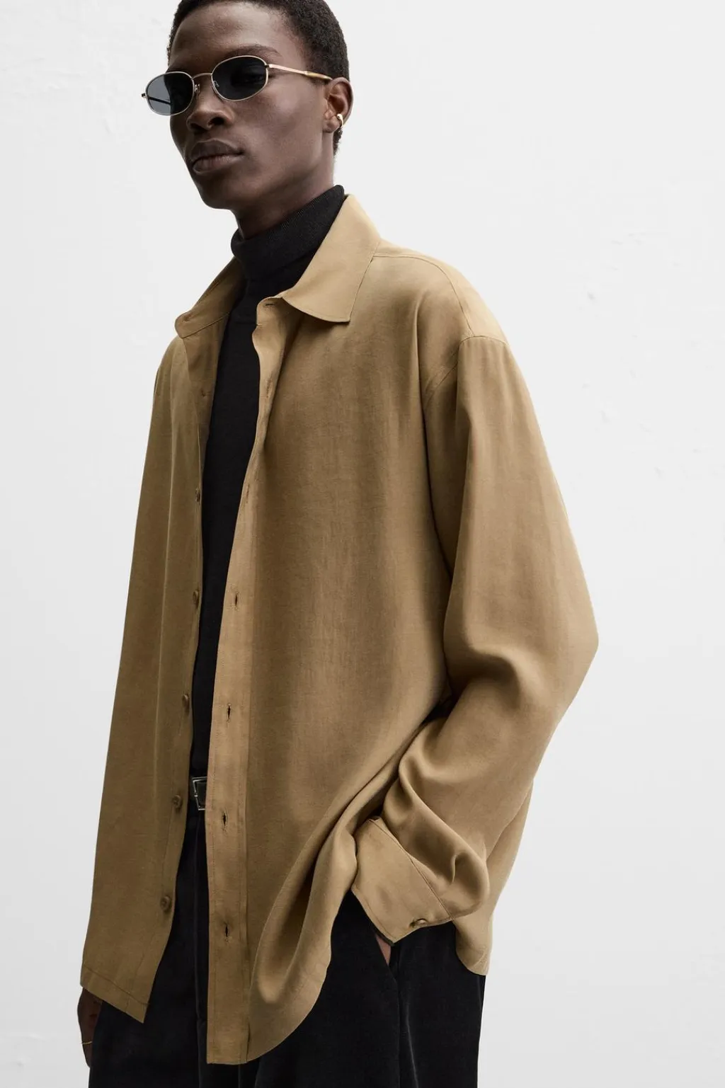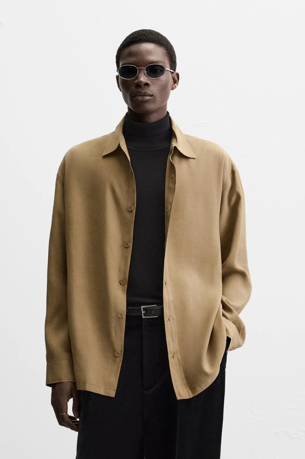 Camisa relaxed fit confeccionada en tejido fluido con mezcla de modal. Cuello italiano y manga larga acabada en puño con botón. Cierre frontal de botonadura.