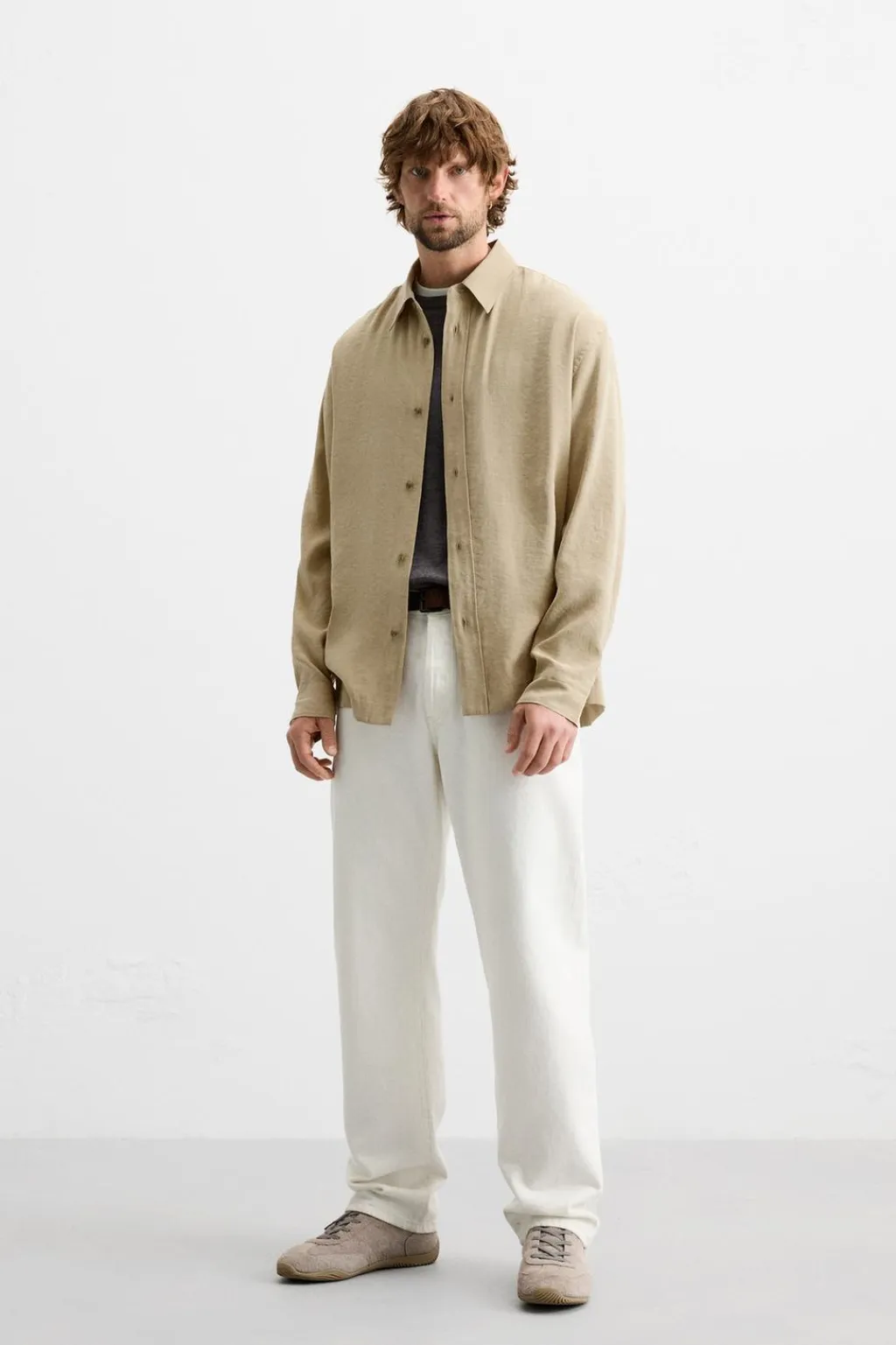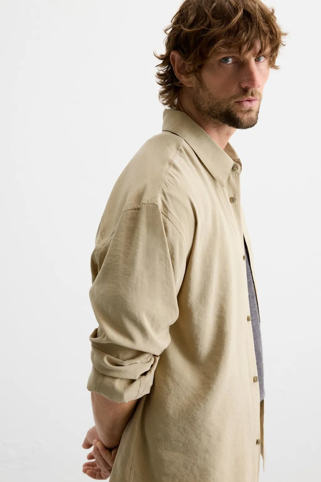Camisa relaxed fit confeccionada en tejido con mezcla de modal. Cuello solapa y manga larga. Cierre frontal de botonadura.