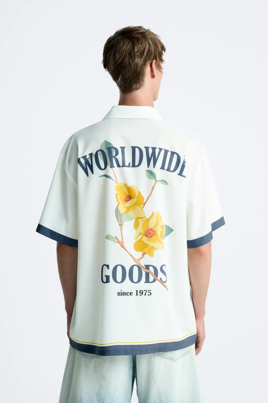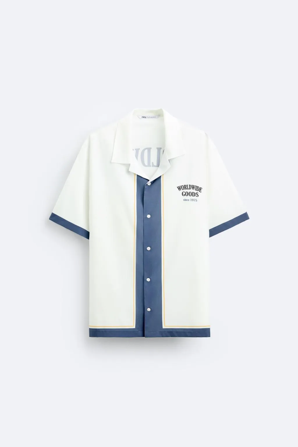 Camisa relaxed fit confeccionada en tejido satinado. Cuello bowling y manga corta. Estampaciones combinadas a contraste en delantero y espalda. Cierre frontal de botonadura.