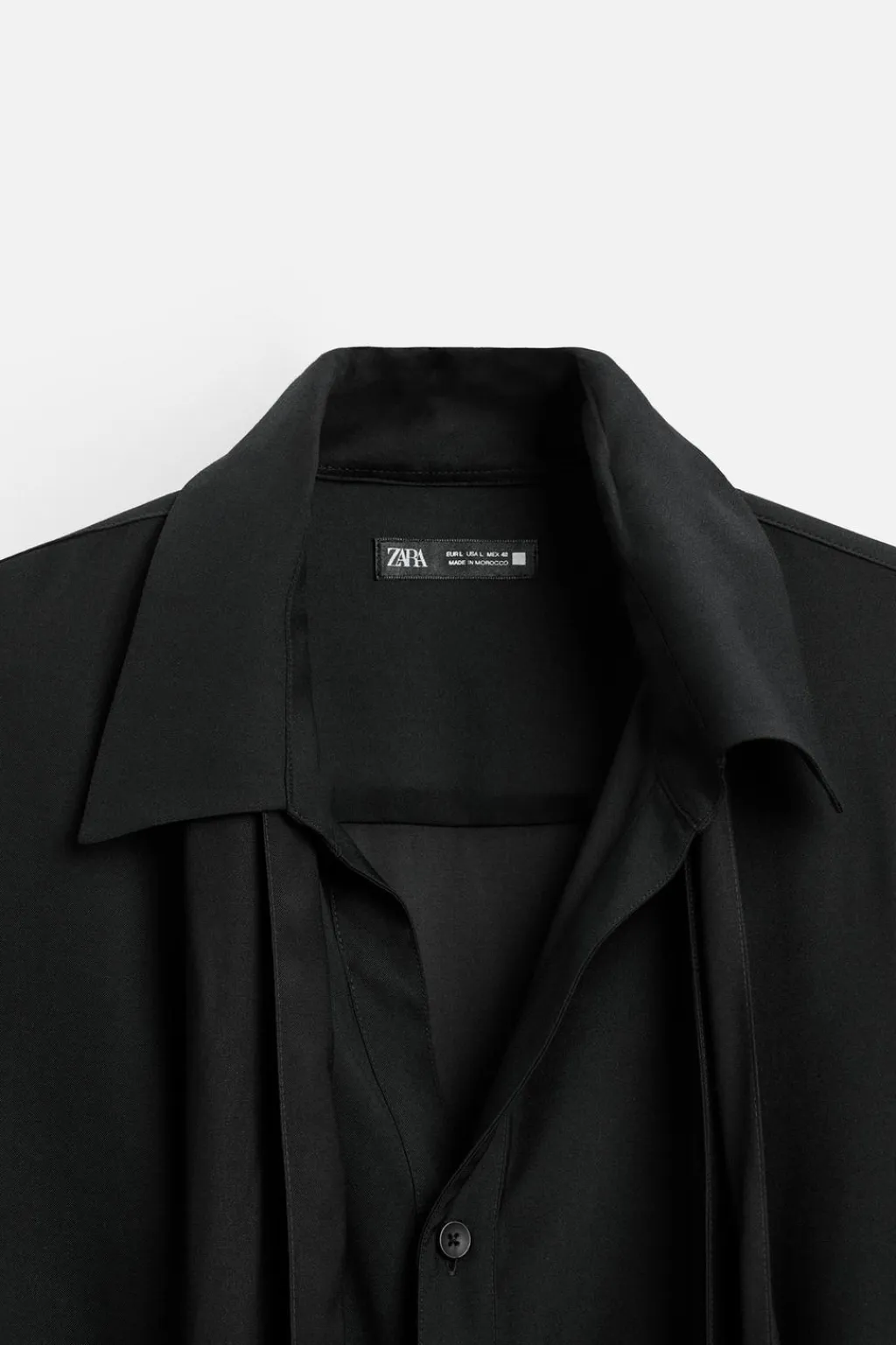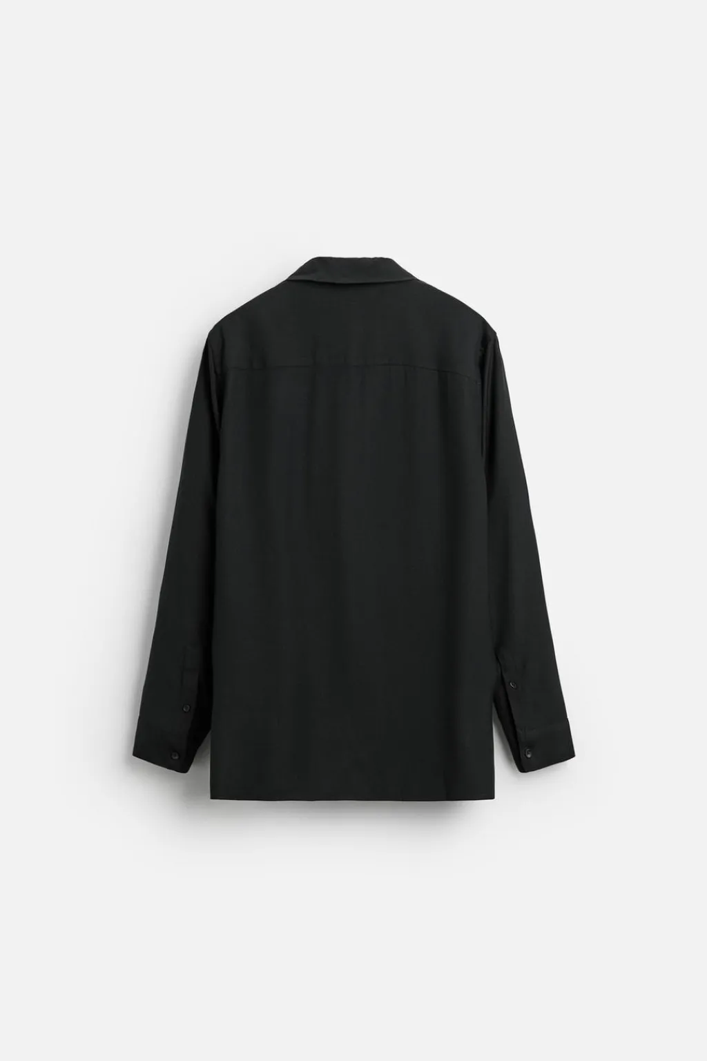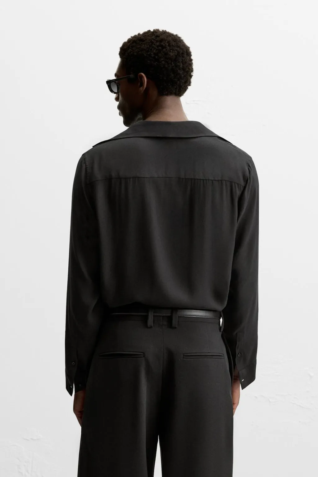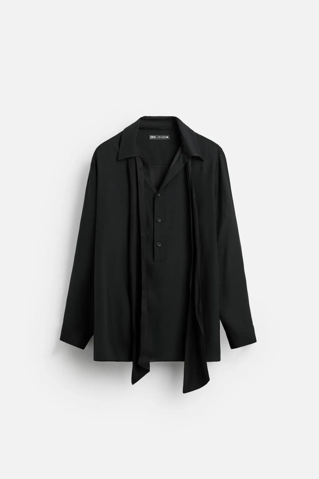 Camisa relaxed fit confeccionada en tejido de viscosa satinada. Cuello polo con abertura frontal y cierre de botonadura. Detalle de lazo en el mismo tejido. Manga larga acabada en puño con botones. Bajo asimétrico con aberturas laterales.