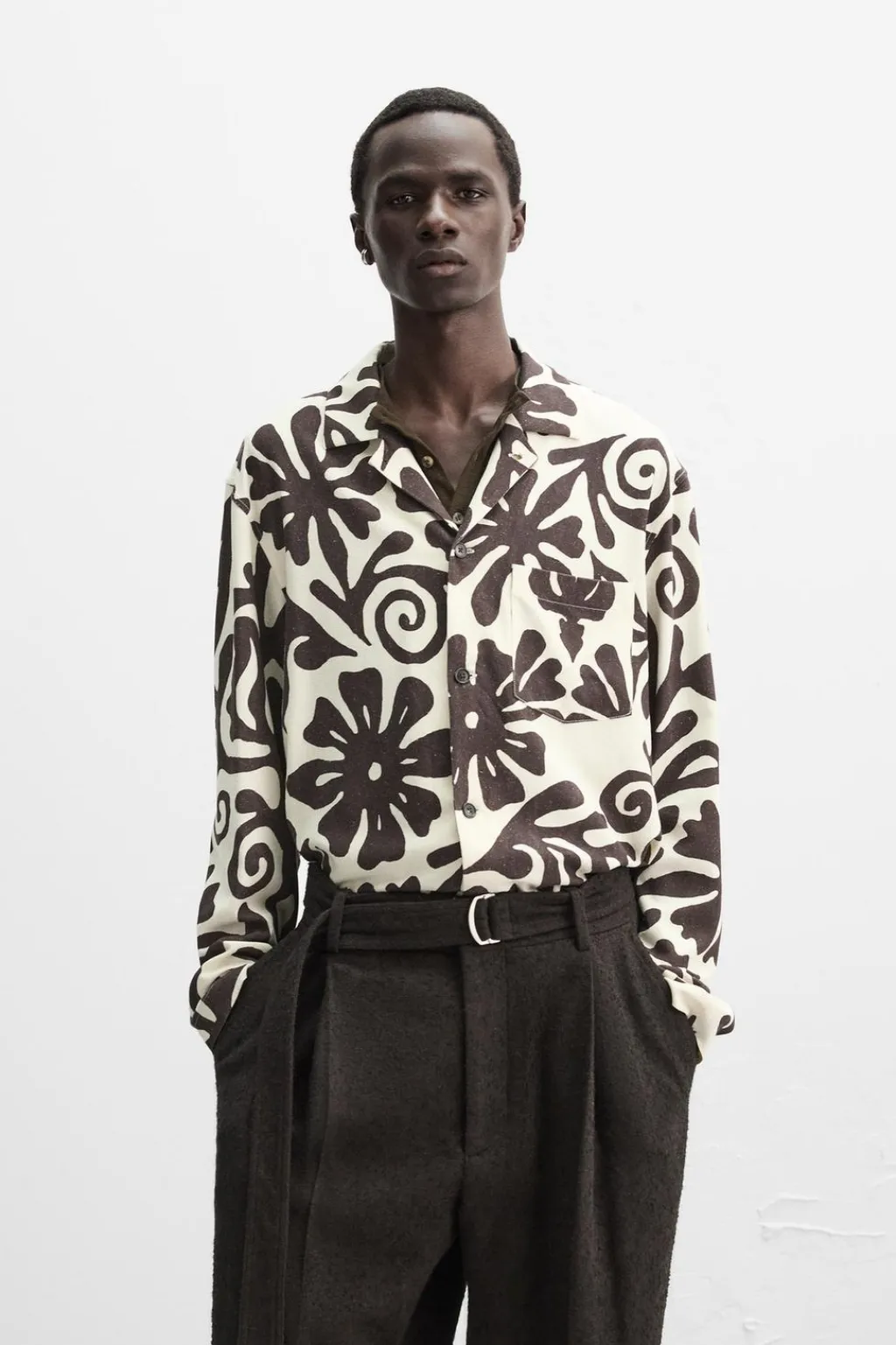 Camisa fluida regular fit confeccionada en tejido de seda. Cuello italiano y manga larga. Bolsillo plastrón en pecho. Cierre frontal de botonadura.