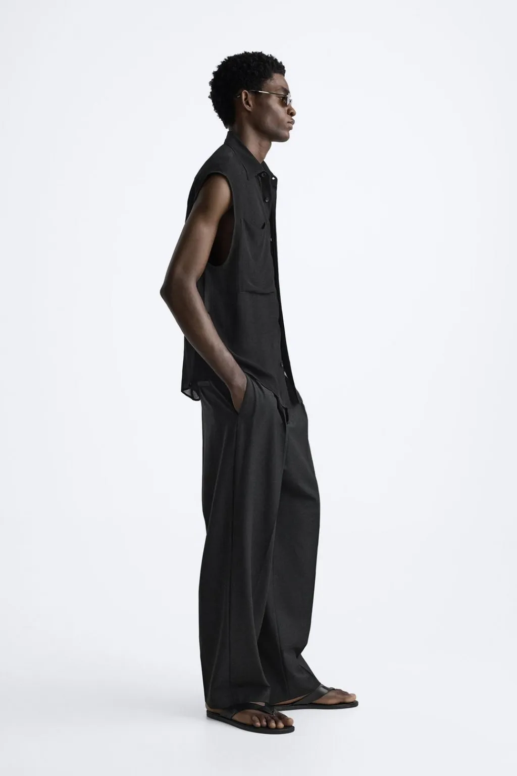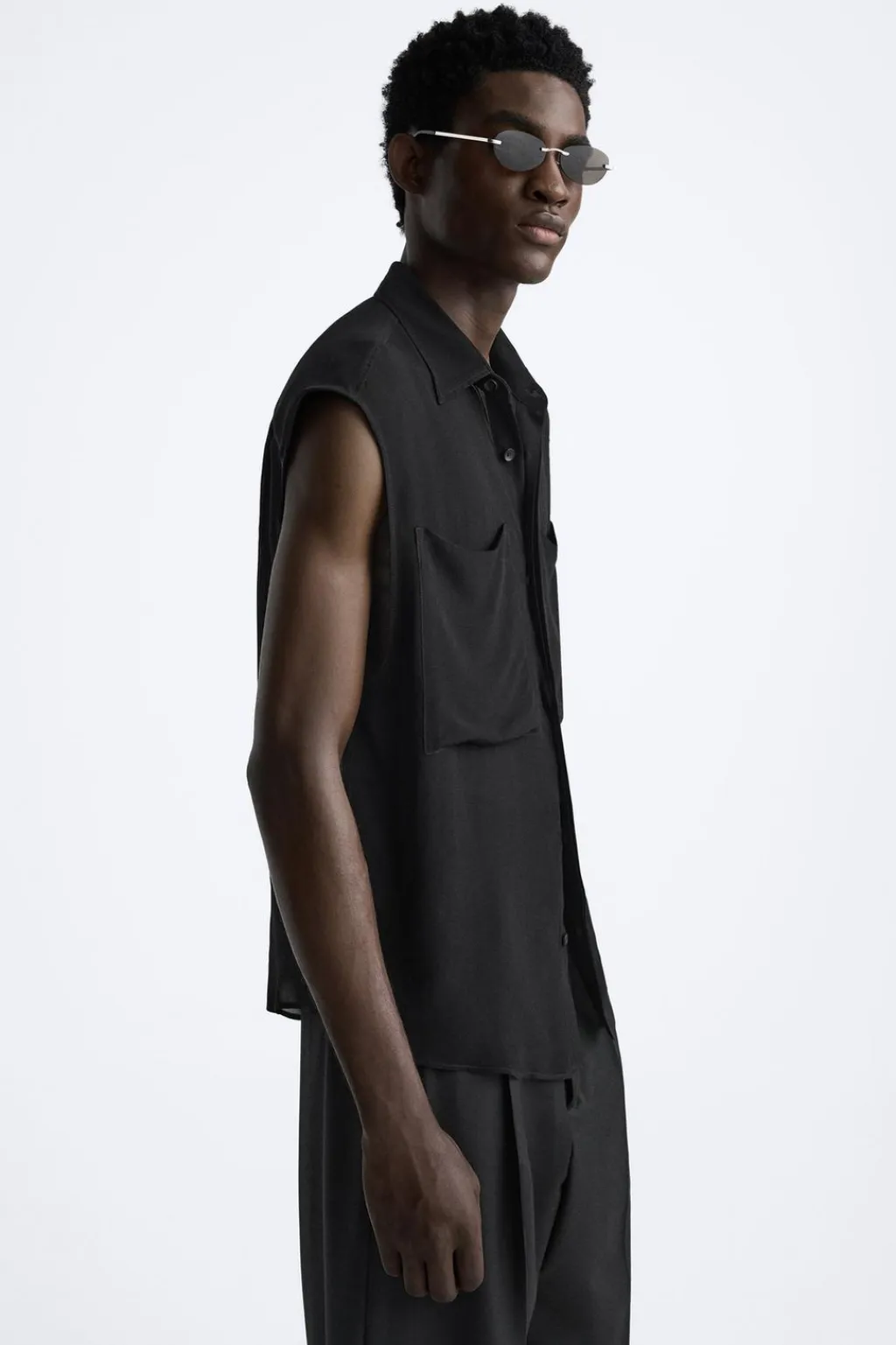Camisa relaxed fit confeccionada en tejido semitransparente de viscosa. Cuello italiano y manga sisa. Bolsillos de plastrón en pecho. Bajo asimétrico. Cierre frontal de botonadura oculta por solapa.