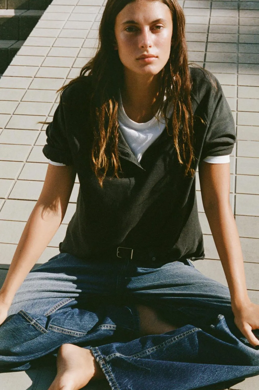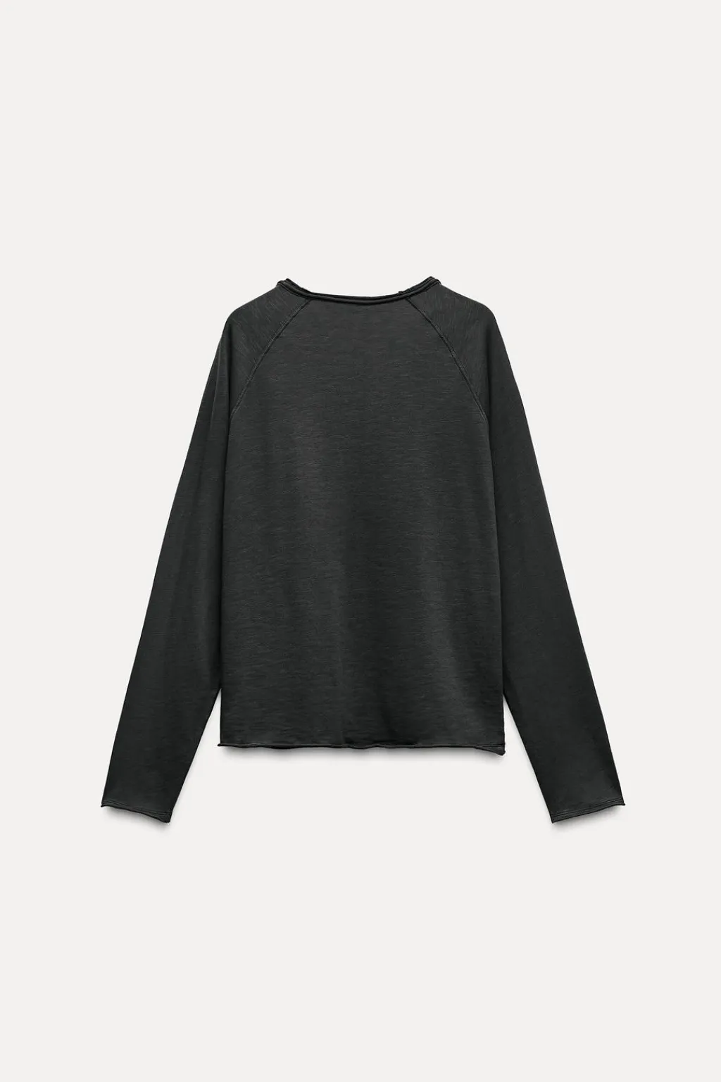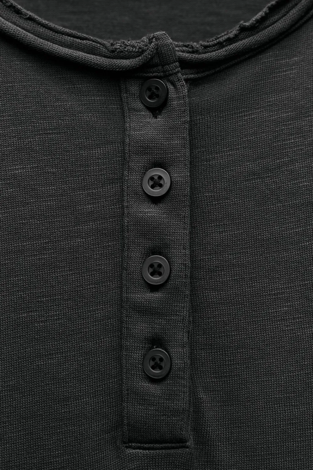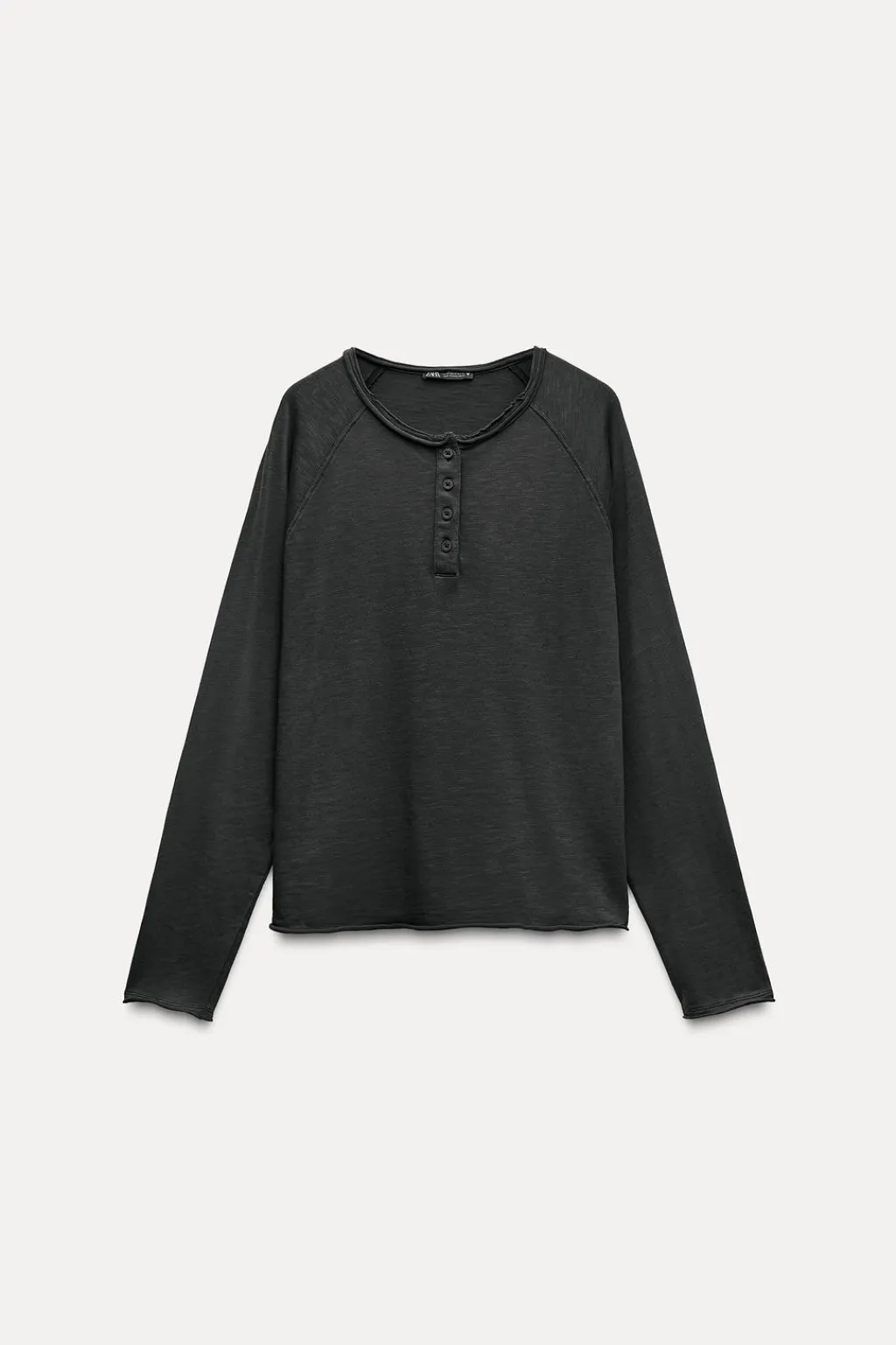 Camiseta confeccionada en algodón 100% efecto lavado. Cuello redondo y manga larga. Cierre tipo polo con botones en delantero.