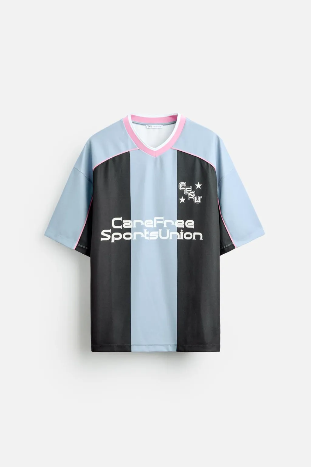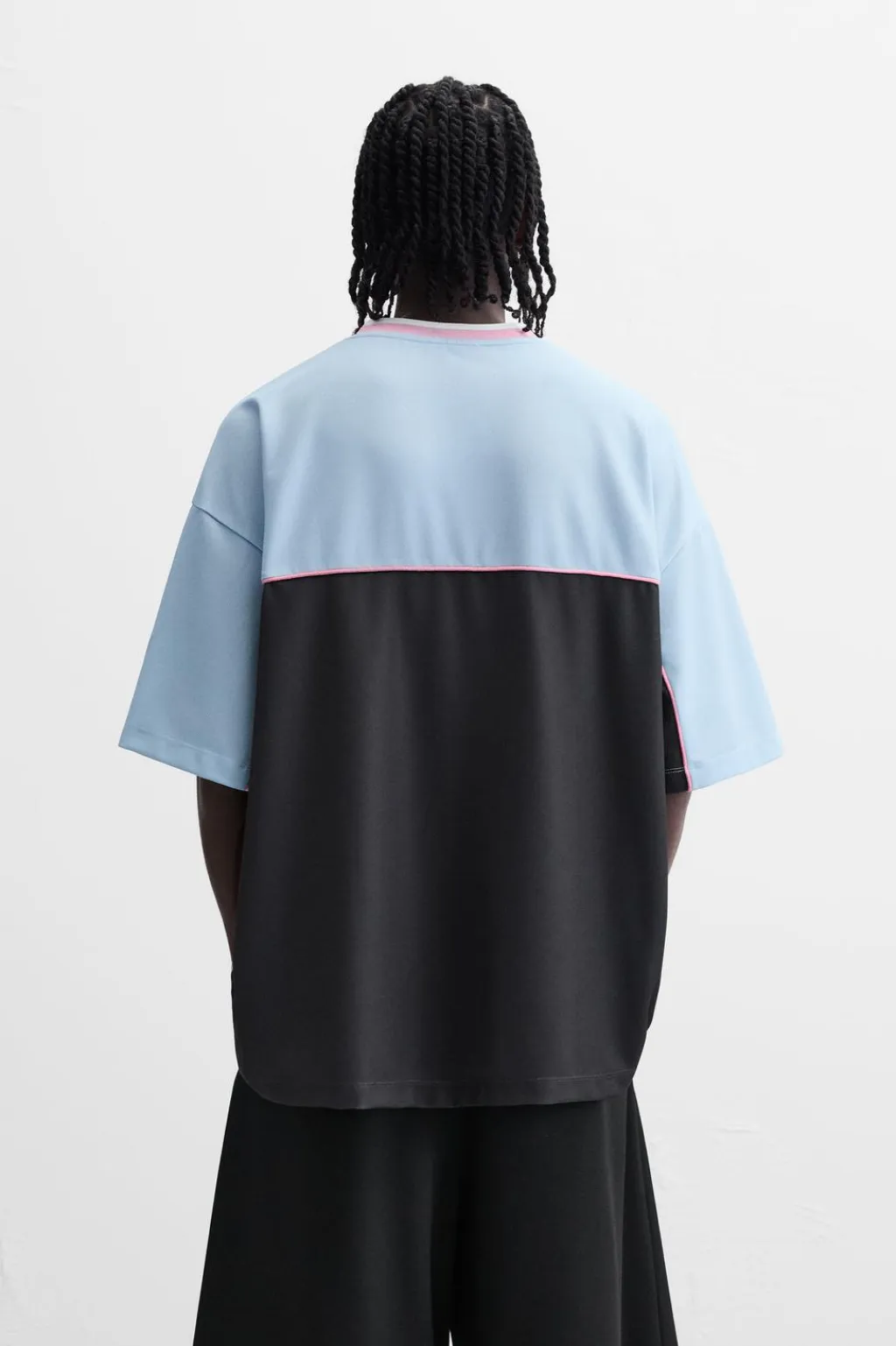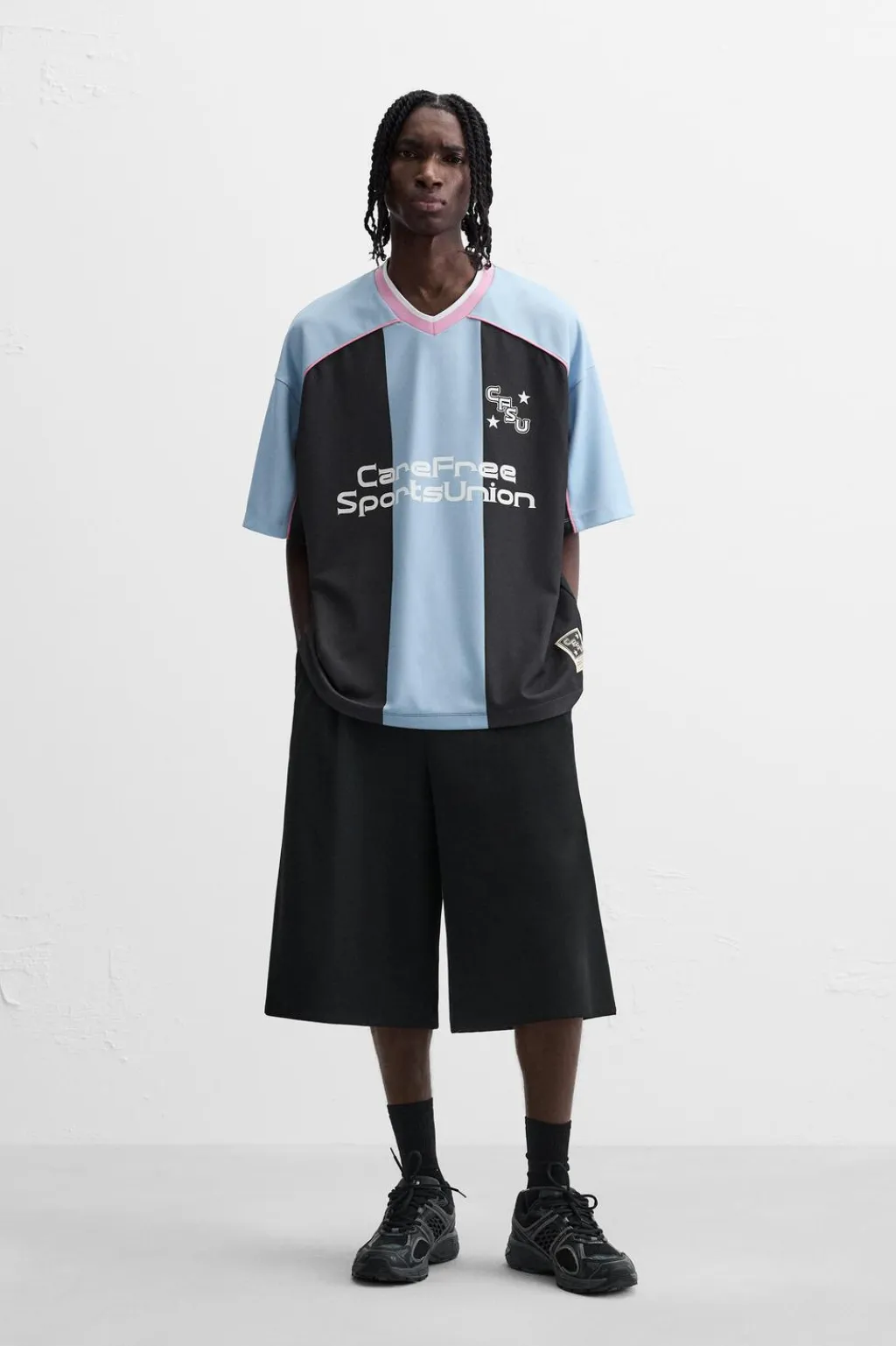 Camiseta relaxed fit confeccionada en tejido técnico. Cuello pico y manga corta. Estampados combinados a contraste en delantero y espalda.